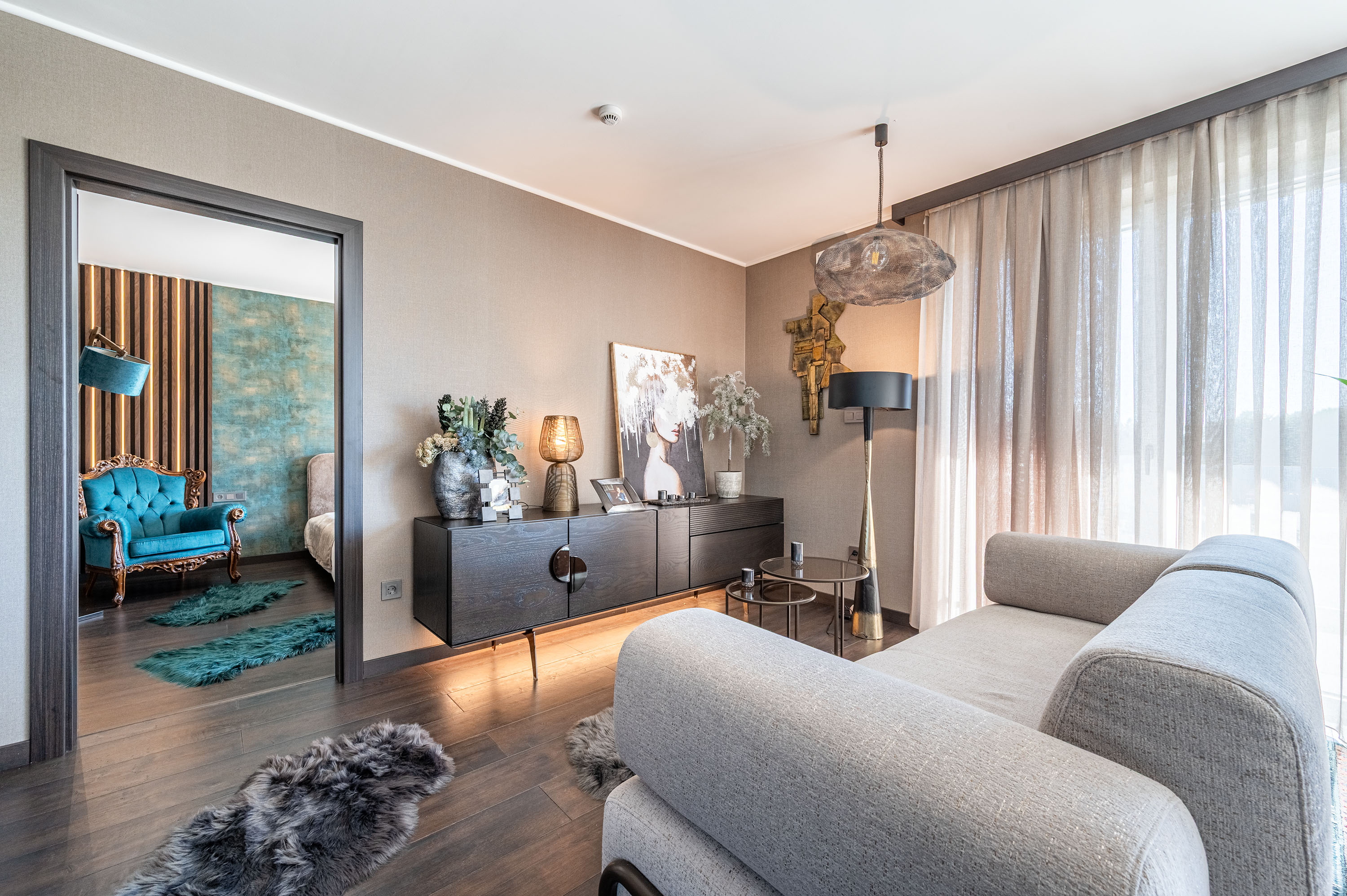 The apartment is one of the three largest apartments in the building. The interior was designed by the owner herself, sparing no expense, time or energy – it is not equipped with standard fixtures and fittings. The apartment has ceiling cooling, underfloor heating, Austrian electric shutters, a premium custom-made kitchen, stone countertops, high-quality Italian flooring, and Bugnatese sanitary ware.