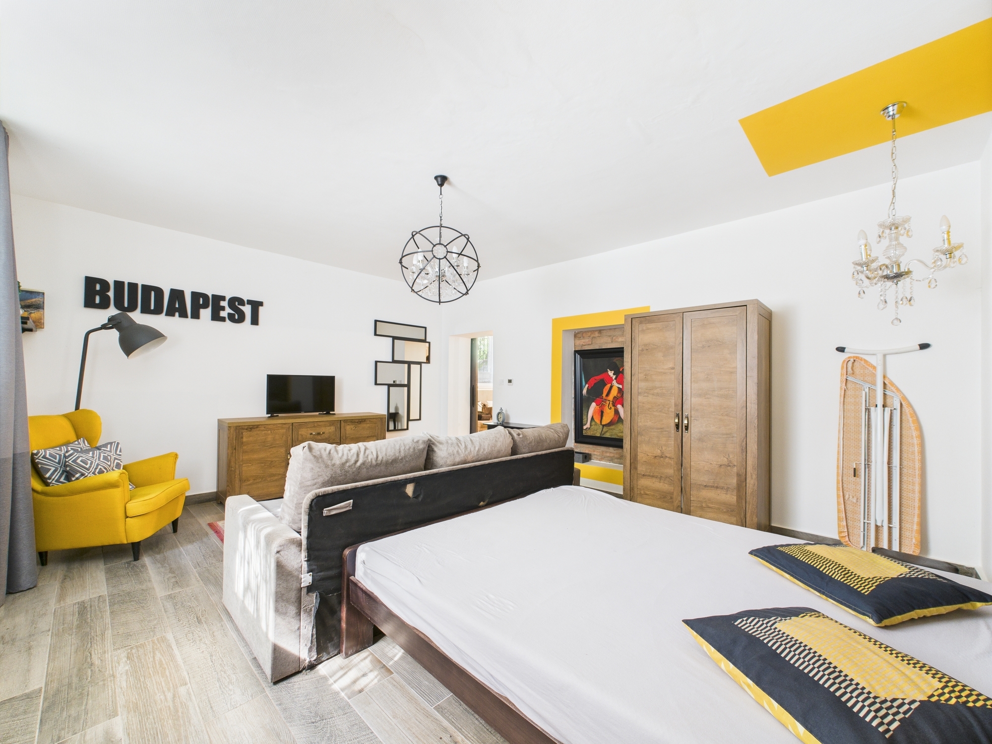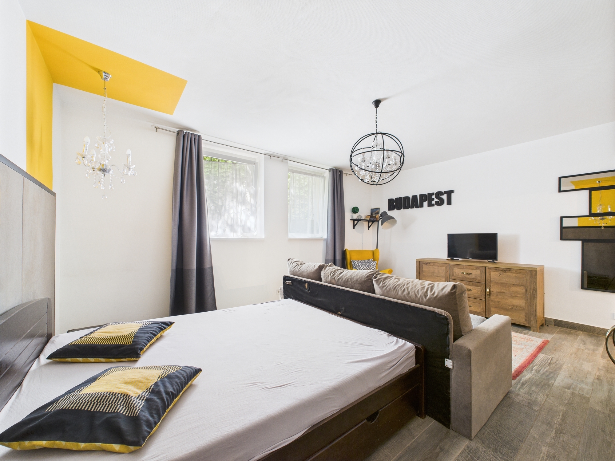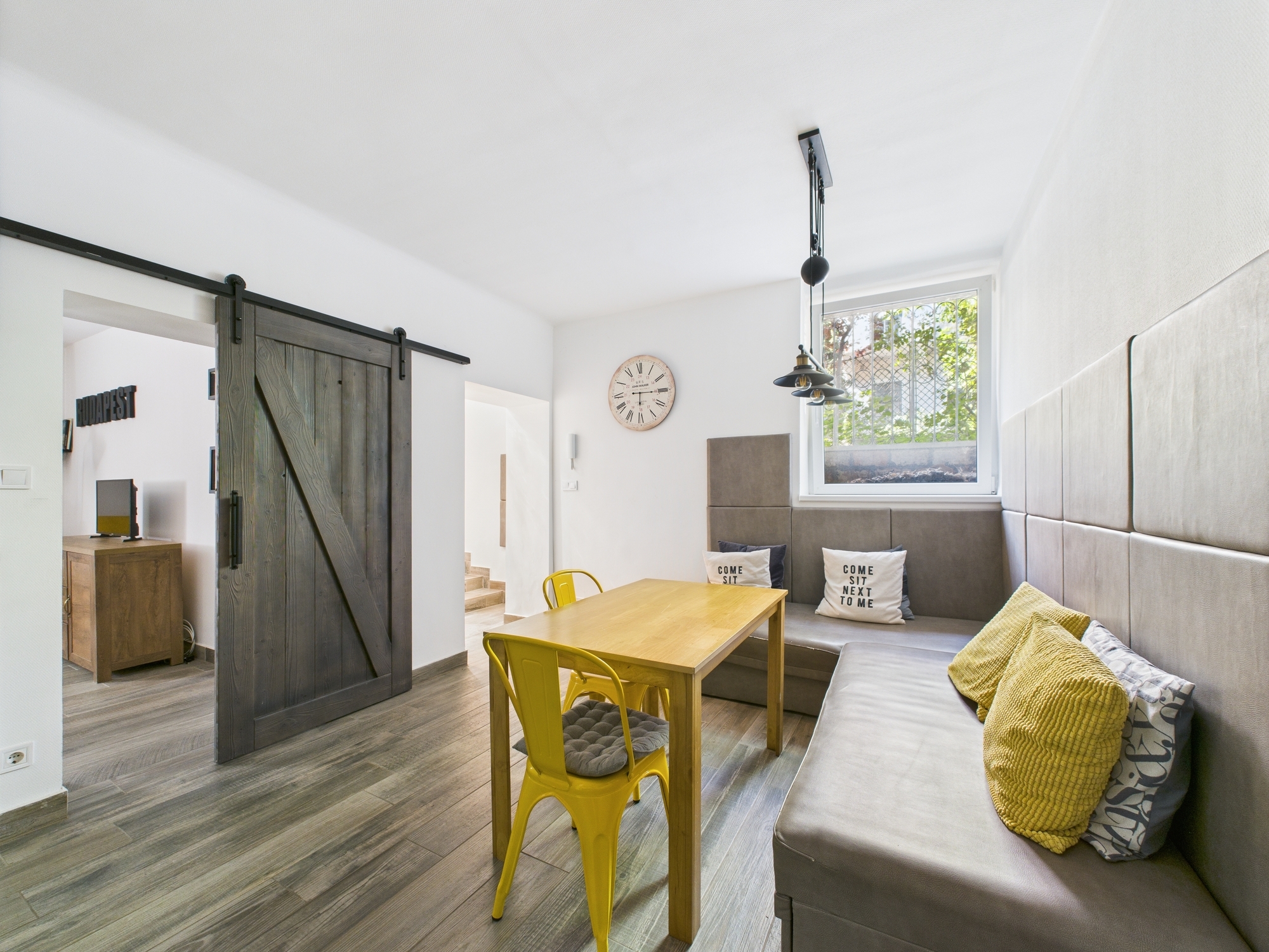 The apartment is stylish, tastefully renovated, and fully furnished. The interior is bright and modern yet welcoming, with an open-plan kitchen-dining-living room and a 25 m² well-separated sleeping area with a comfortable sofa bed, double bed, wardrobe, and a cozy reading corner.
