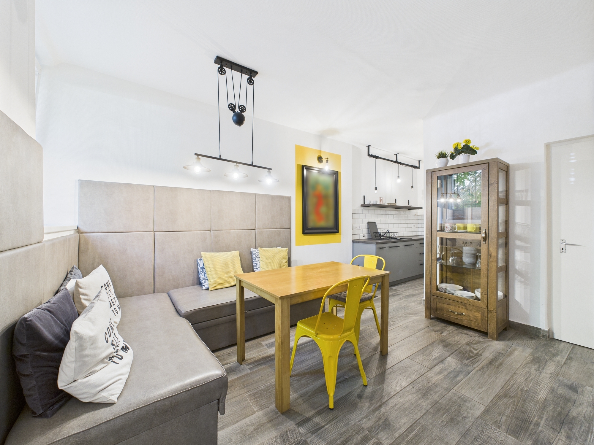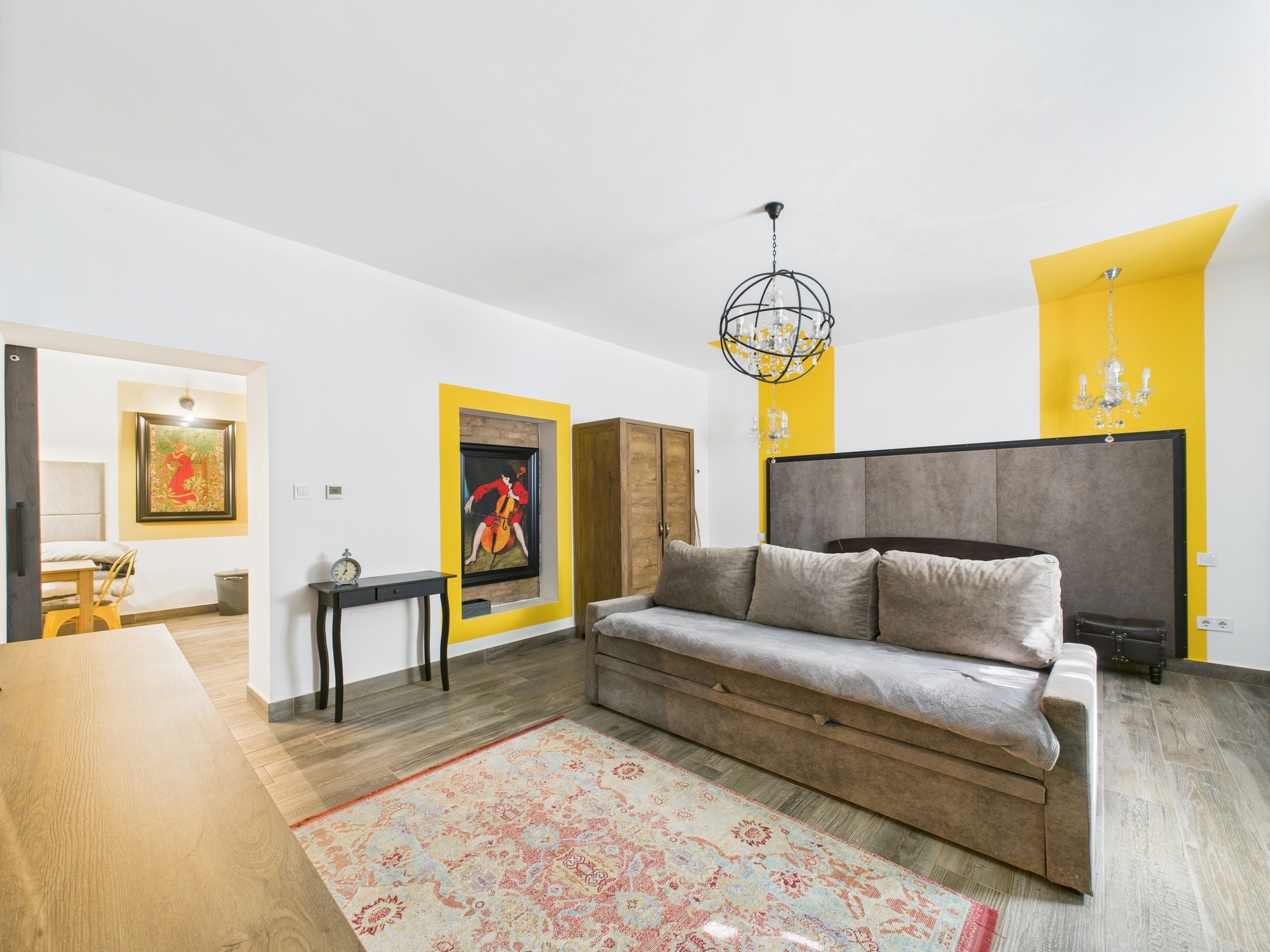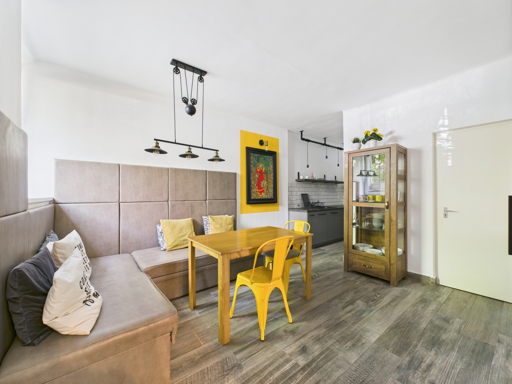 The apartment is stylish, tastefully renovated, and fully furnished. The interior is bright and modern yet welcoming, with an open-plan kitchen-dining-living room and a 25 m² well-separated sleeping area with a comfortable sofa bed, double bed, wardrobe, and a cozy reading corner.