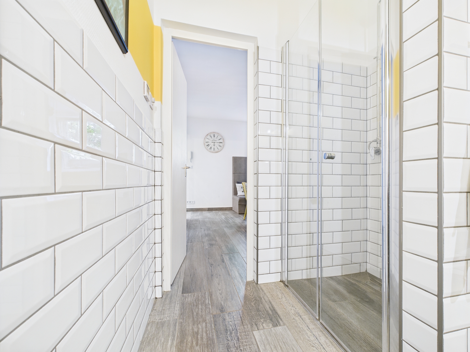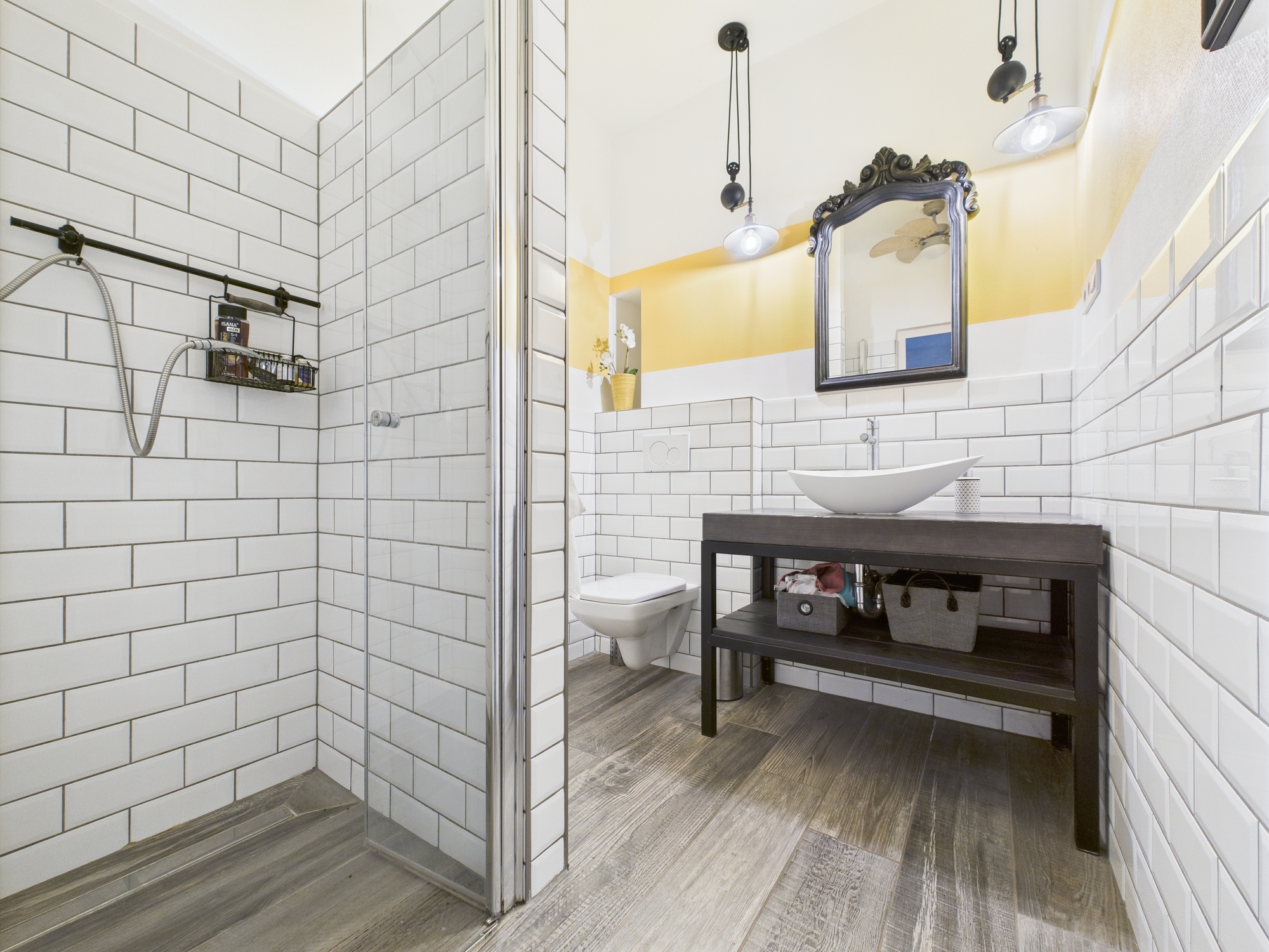 The kitchen is fully equipped with appliances (hob, microwave, fridge, water heater, and storage cupboards), and the dining room is comfortably furnished with a corner bench and a quality wooden table. The bathroom has a particularly sophisticated design, with a shower, modern metro tiles, a unique washbasin, and pendant designer lights.