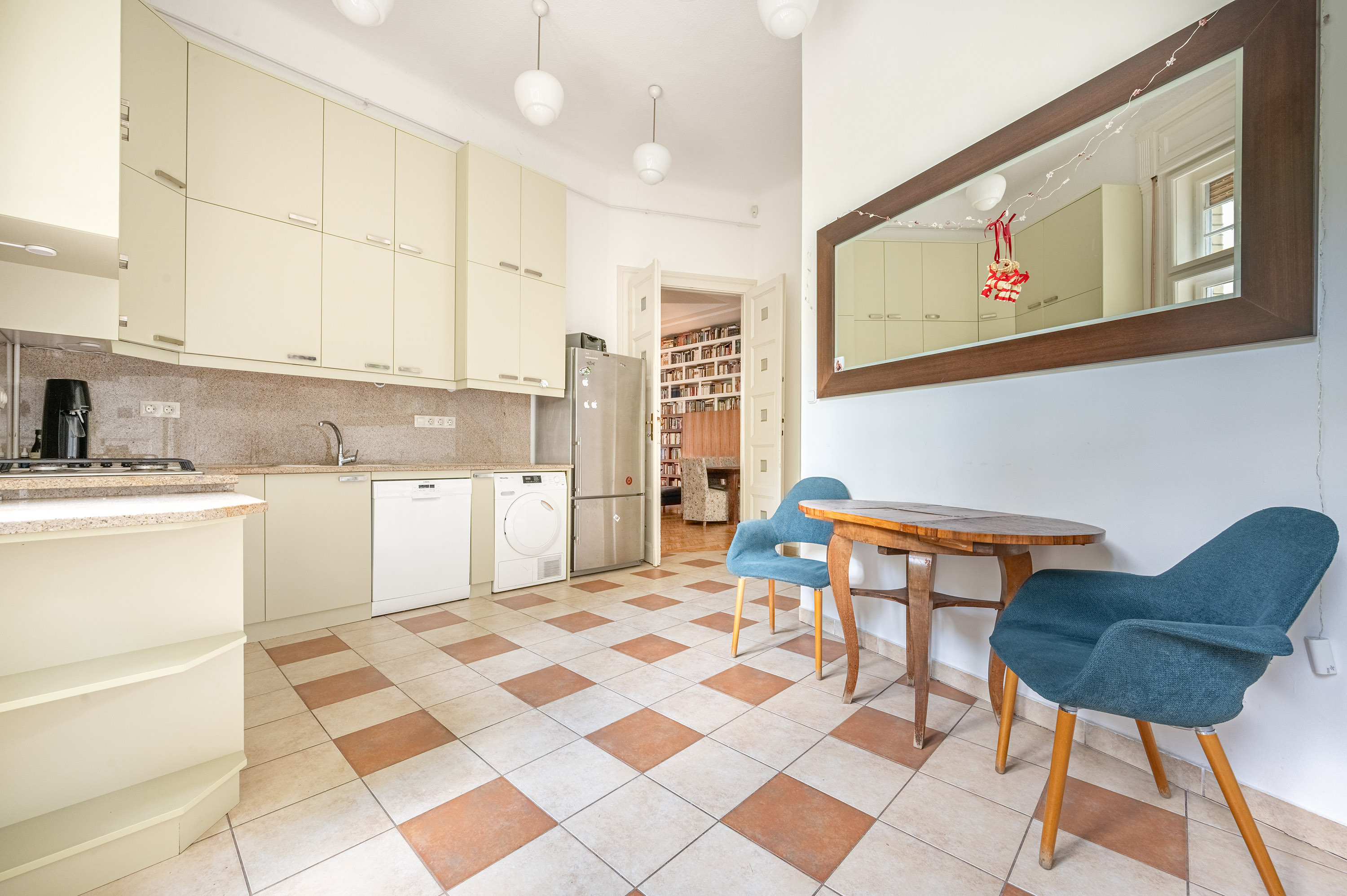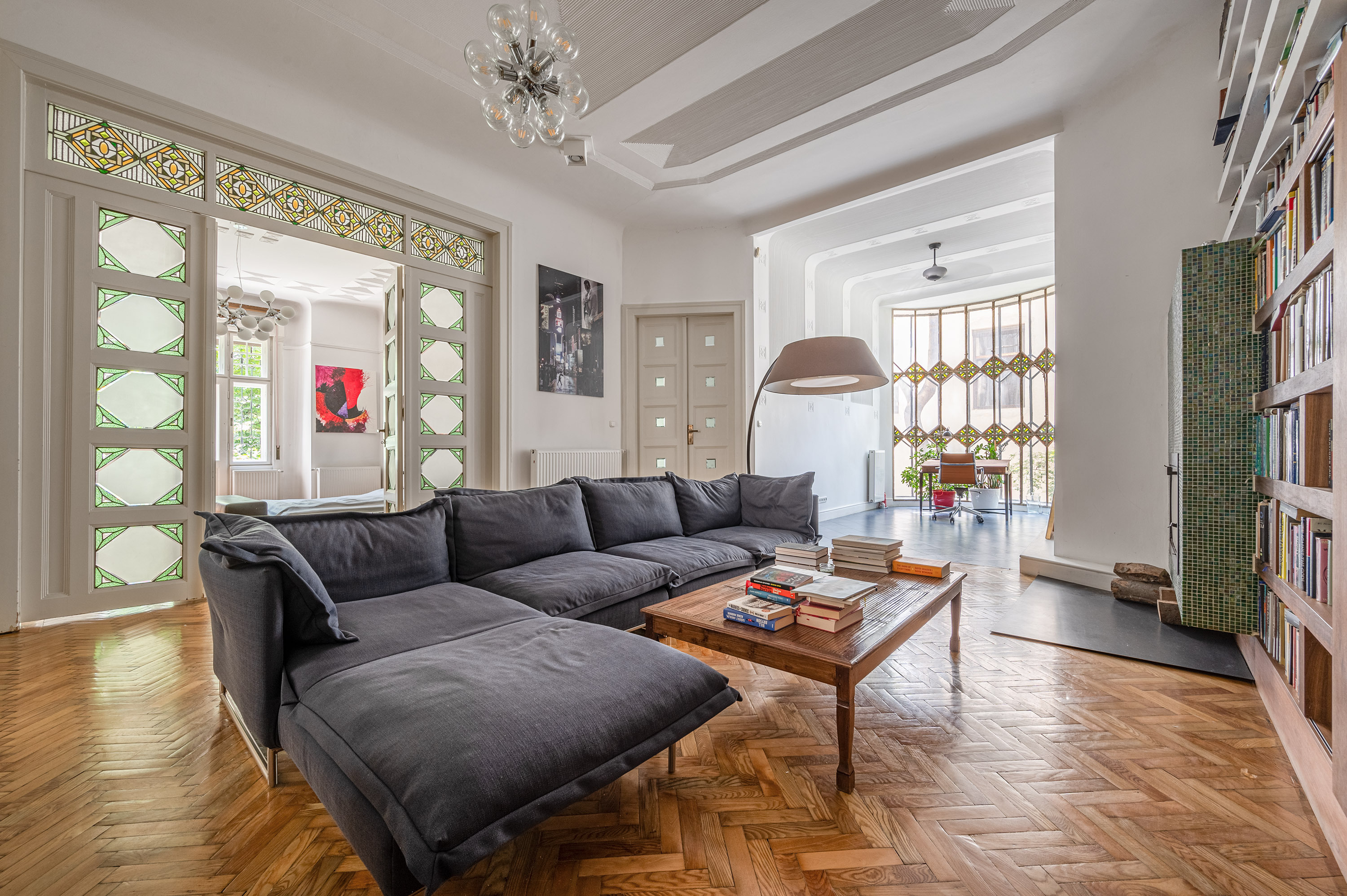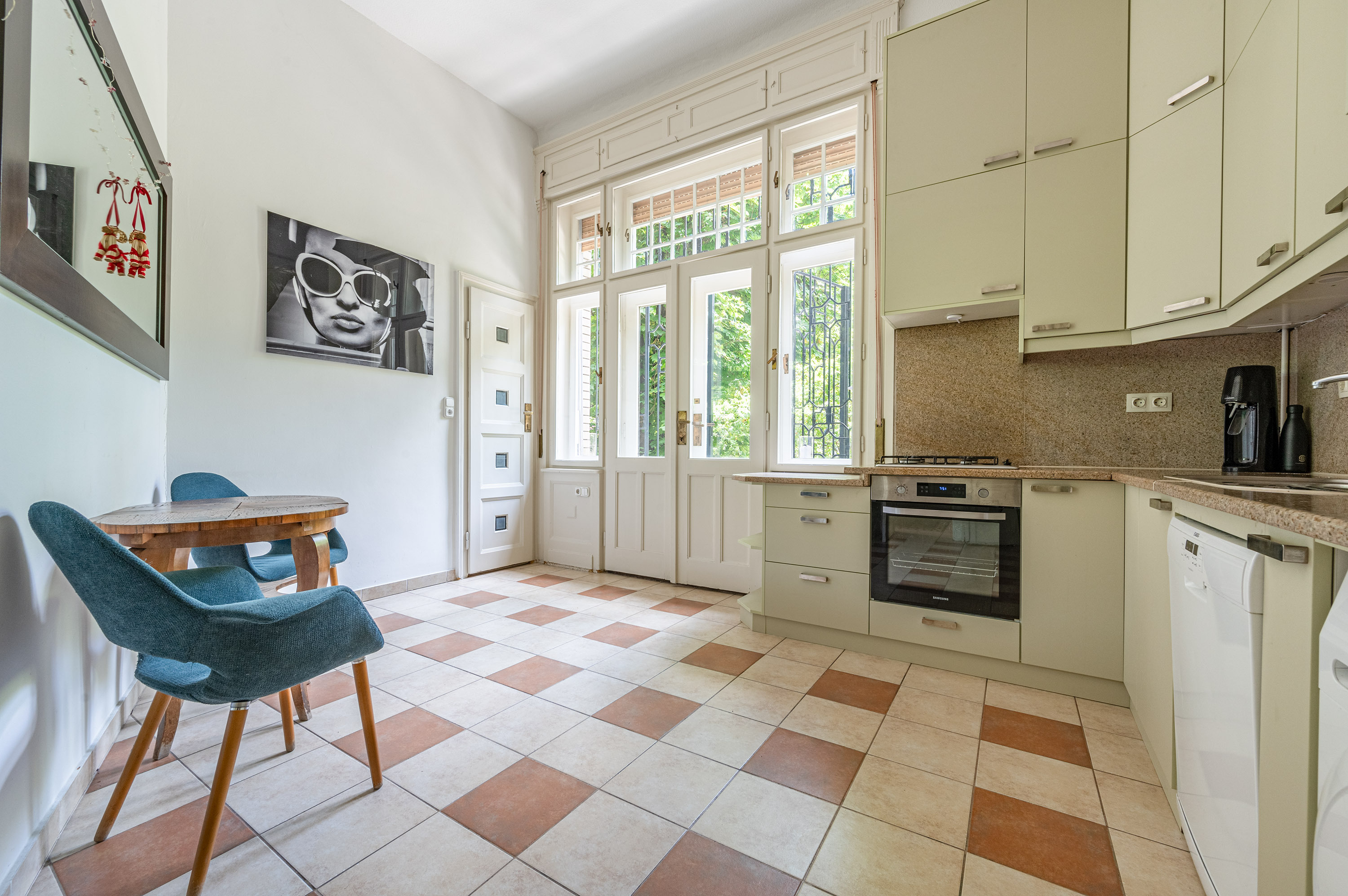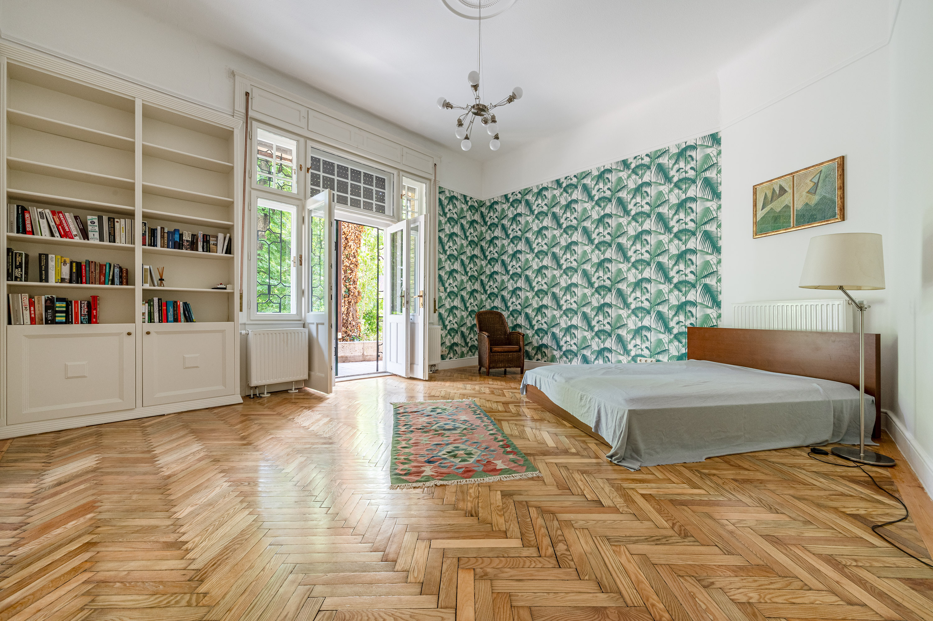 The impressive apartment on the high ground floor of the property known as Gyenes-villa has 2 bedrooms, a large living room, a study corner, a fitted kitchen with terrace connection, a large bathroom with bath and shower.