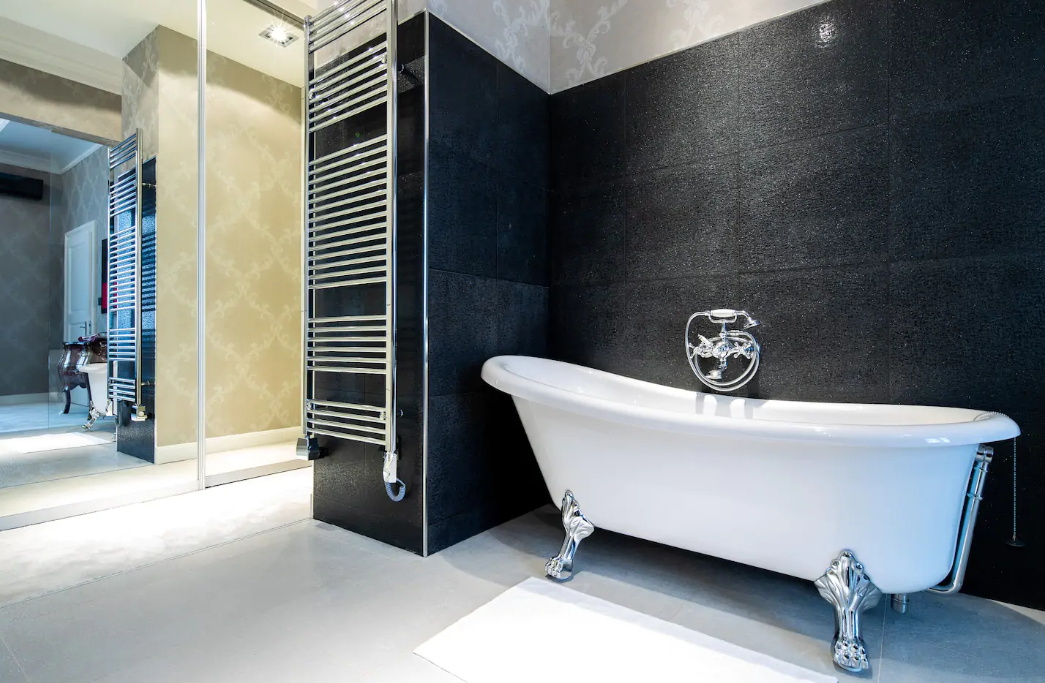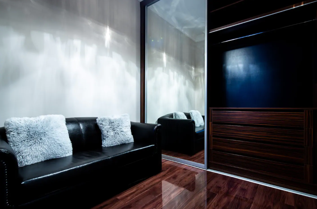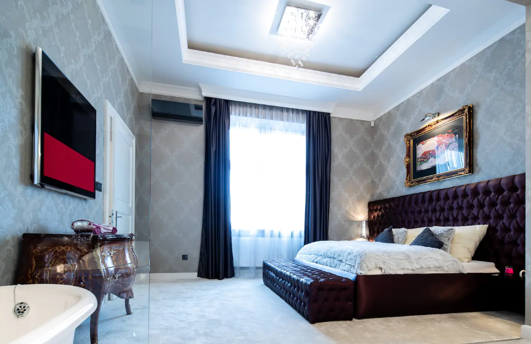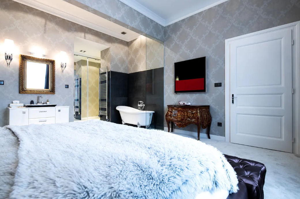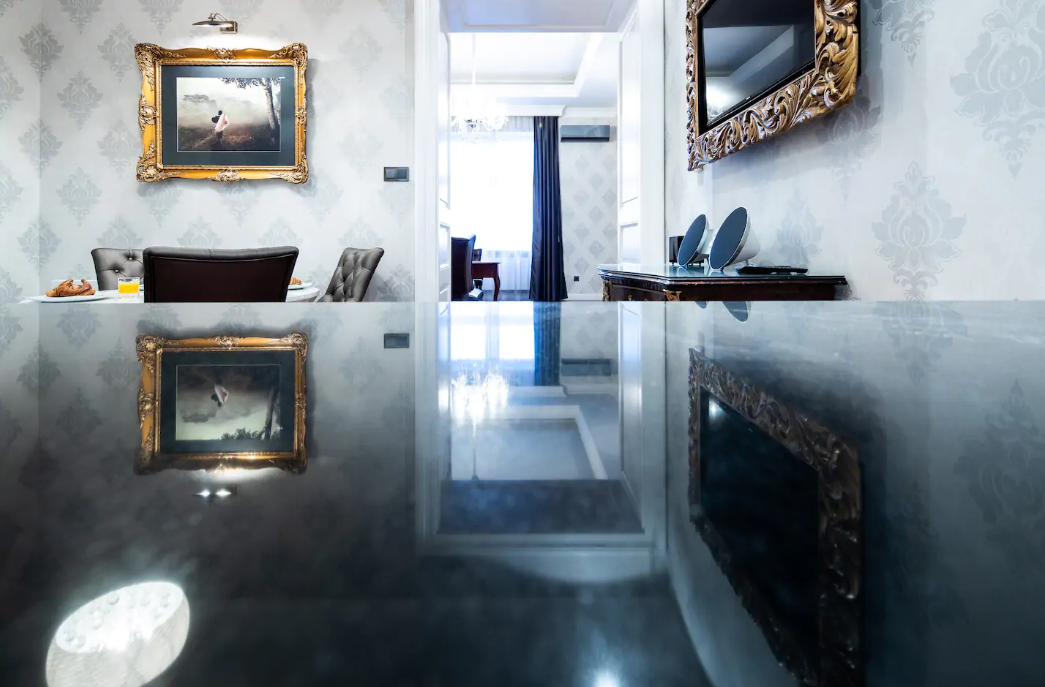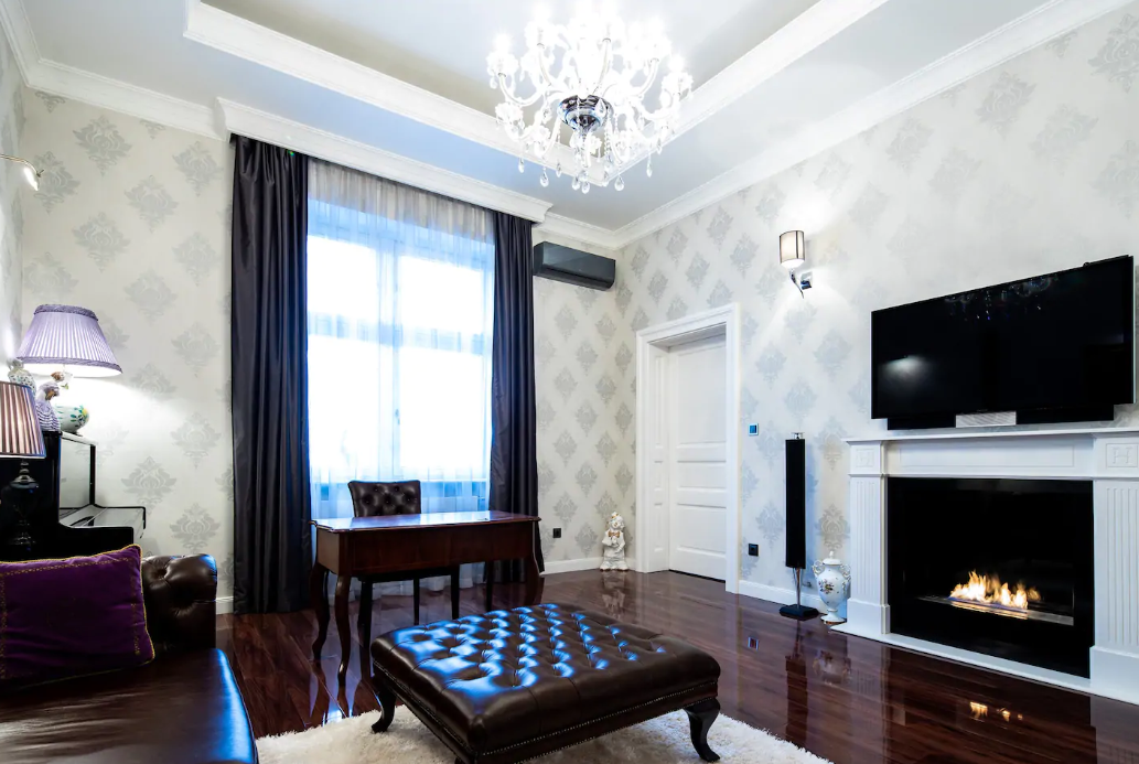 There are 2 bedrooms, a living room and a kitchen. Sheer marble, parquet flooring, Versace wallpapers, Bose sound system, a working fireplace, one-of-a-kind self playing Steiner piano, a bathtub and a shower and other details all make your stay unforgettable.