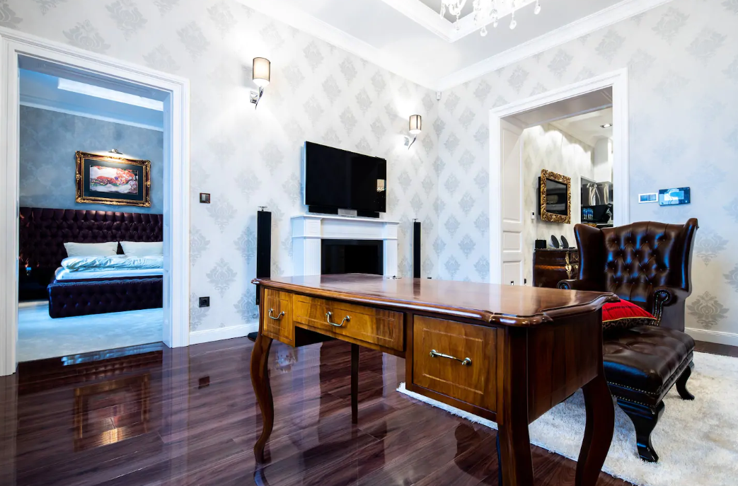 The door of the dining area opens to the office/living room which boasts of oroginal Chesterfield furniture, a huge antique desk, one-of-a-kind self playing Steiner piano, a real fireplace (can be controlled remotely by smart home system) and a widescreen TV.