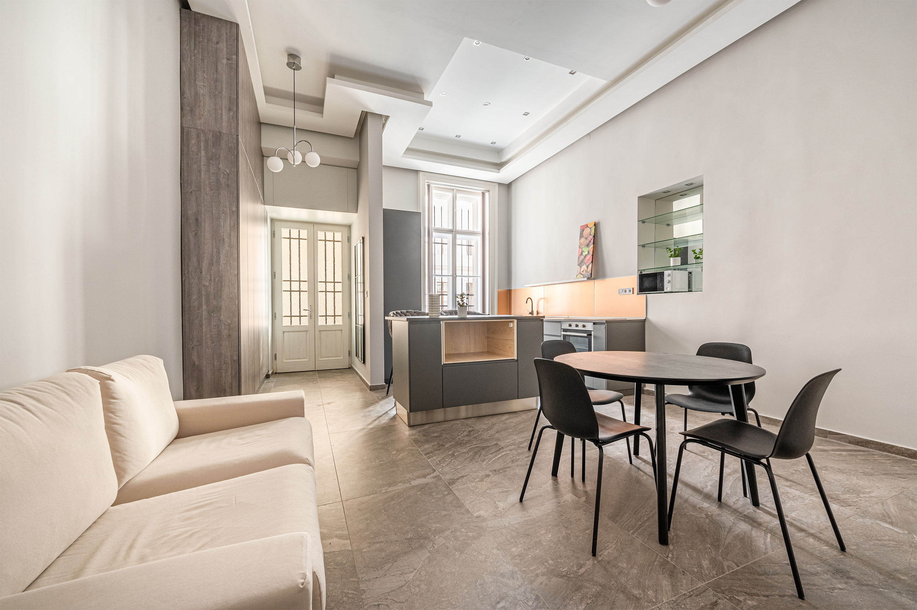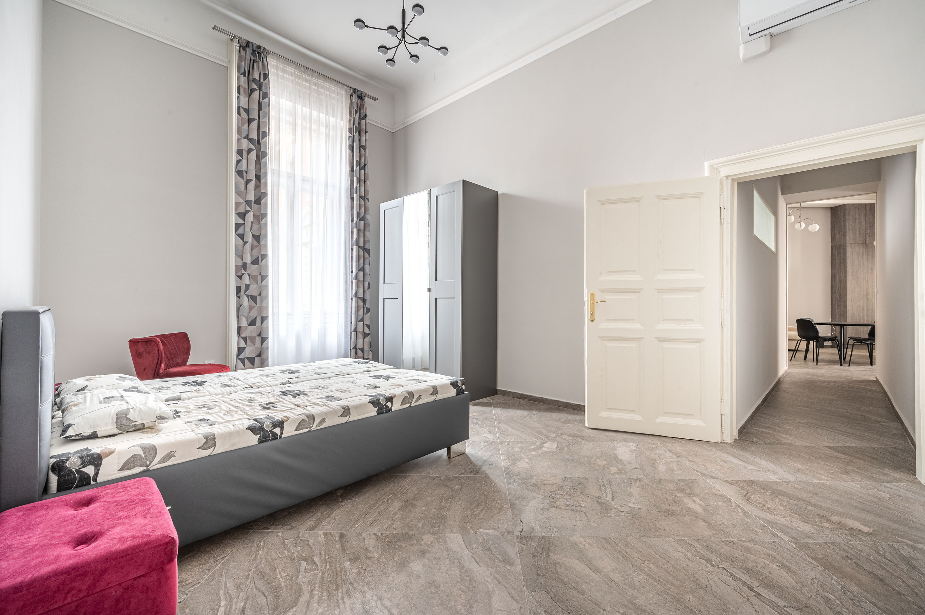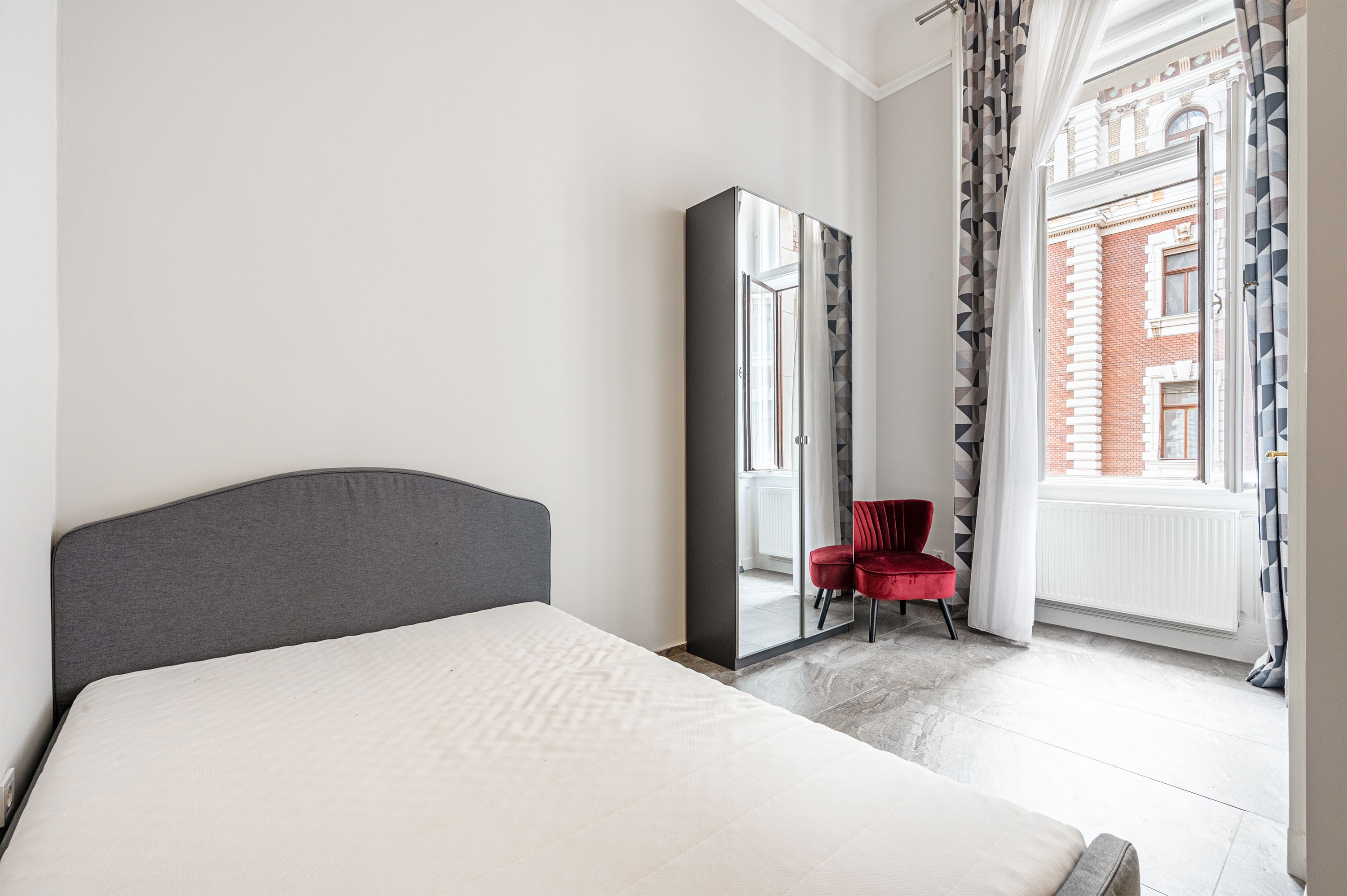 The entrance hall with built-in furniture leads directly into the kitchen and living room, from here there are two separate corridors leading to the bedrooms, from where you have an eye-catching view of the French courtyard and the Kodály körönd square (Metro 1), yet the apartment is very quiet and sheltered from the noise of Andrassy Avenue.