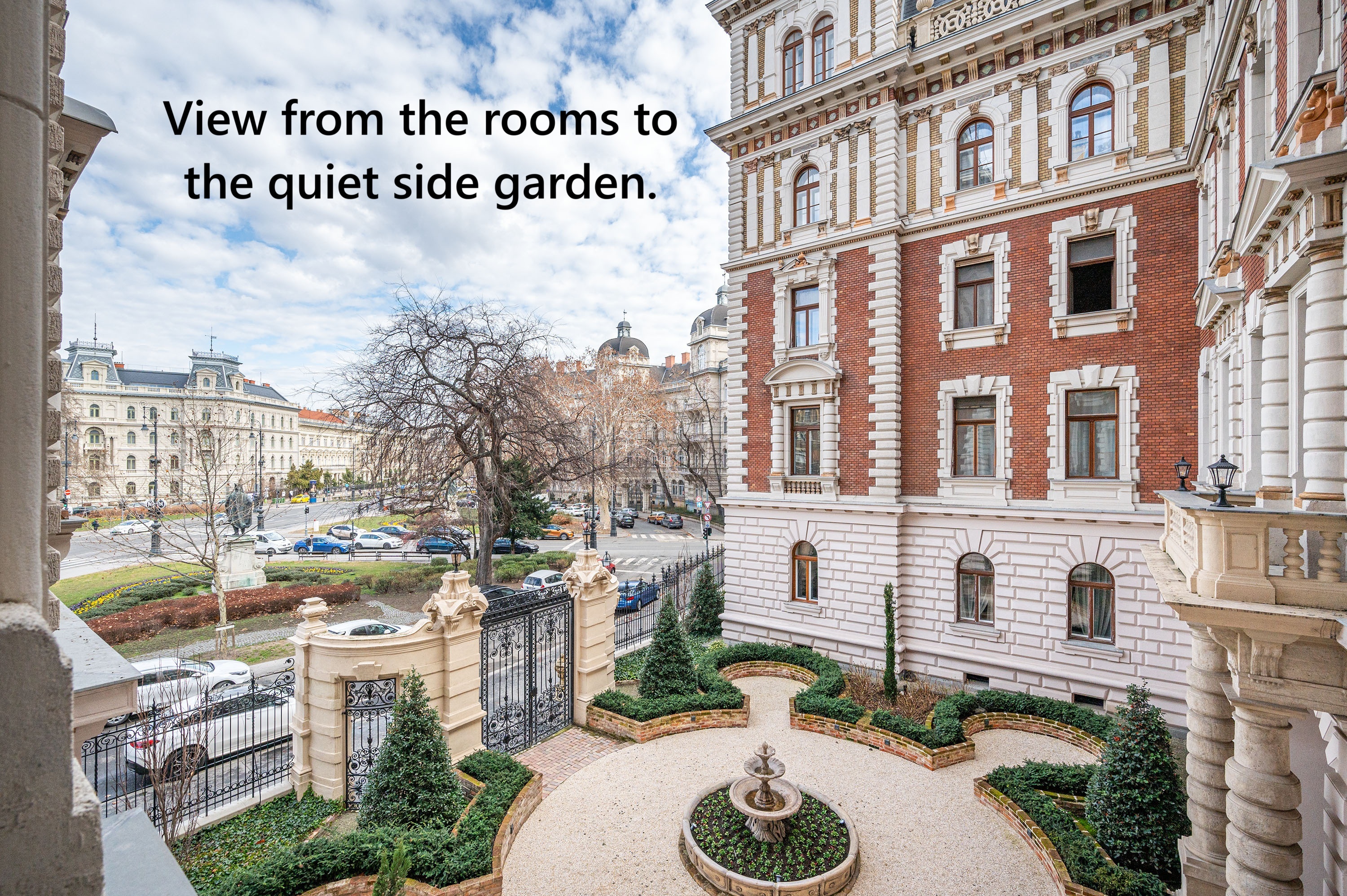 About the building: „Today, the facade has been restored to its original form in every detail, but the interiors have been given a contemporary touch, and the former main entrance has been relocated. The atriums, or inner courtyards, have been named according to themes, including the Renaissance Garden, the Palm Garden and the English Garden.