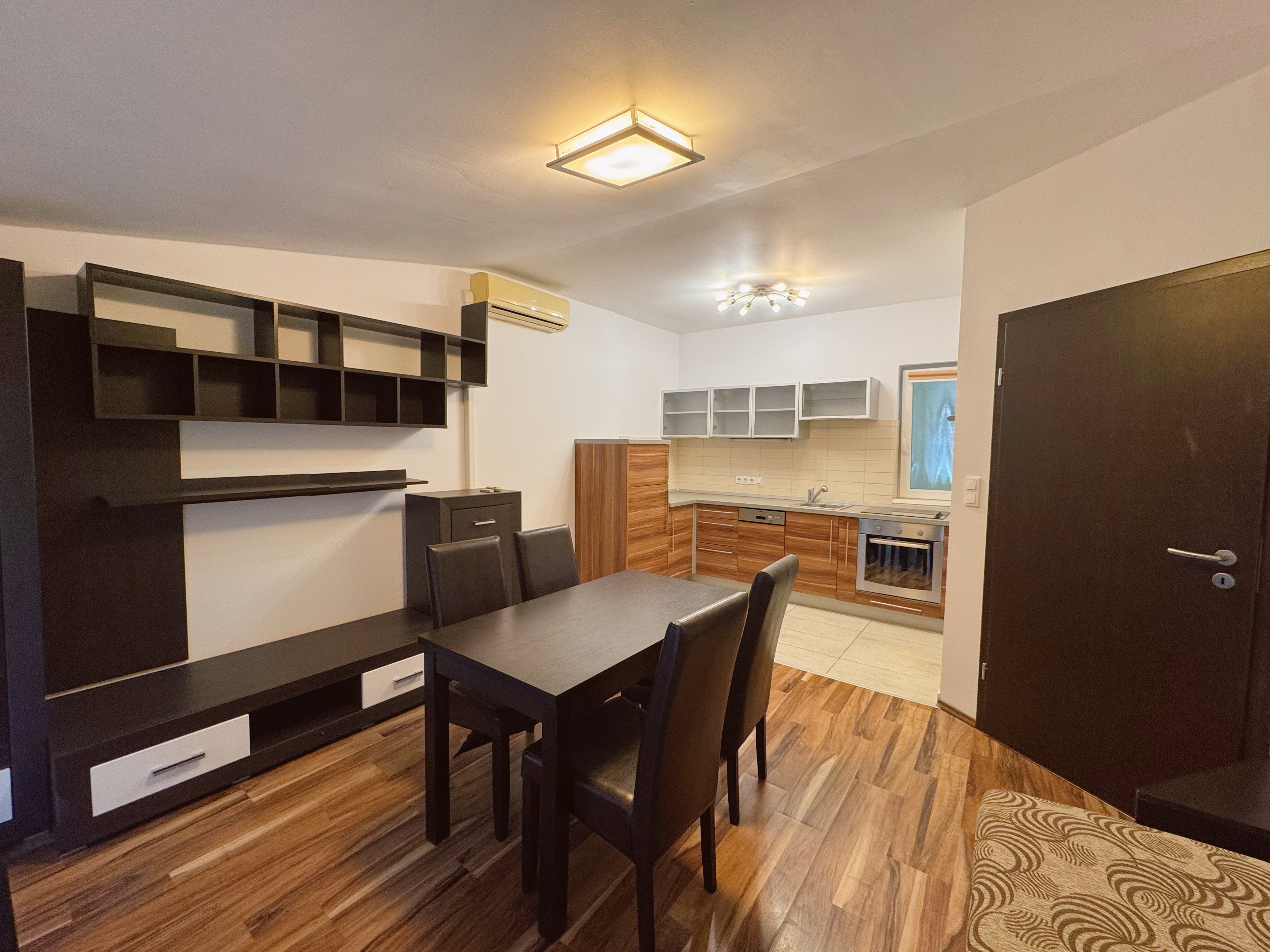The property features a bright living room, a spacious bedroom, and a contemporary bathroom. The apartment is furnished, equipped with a built-in kitchen, and includes air conditioning for year-round comfort.