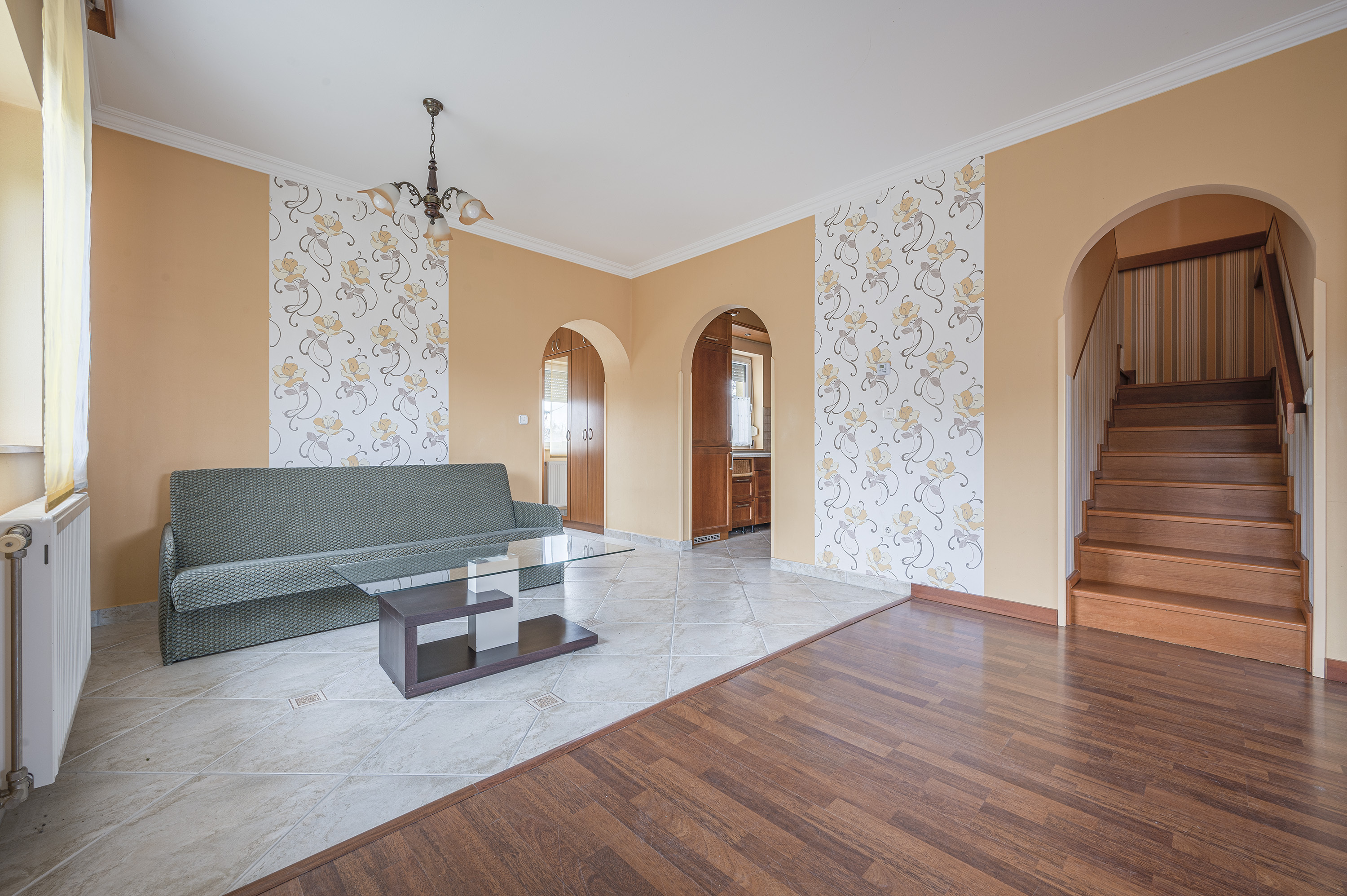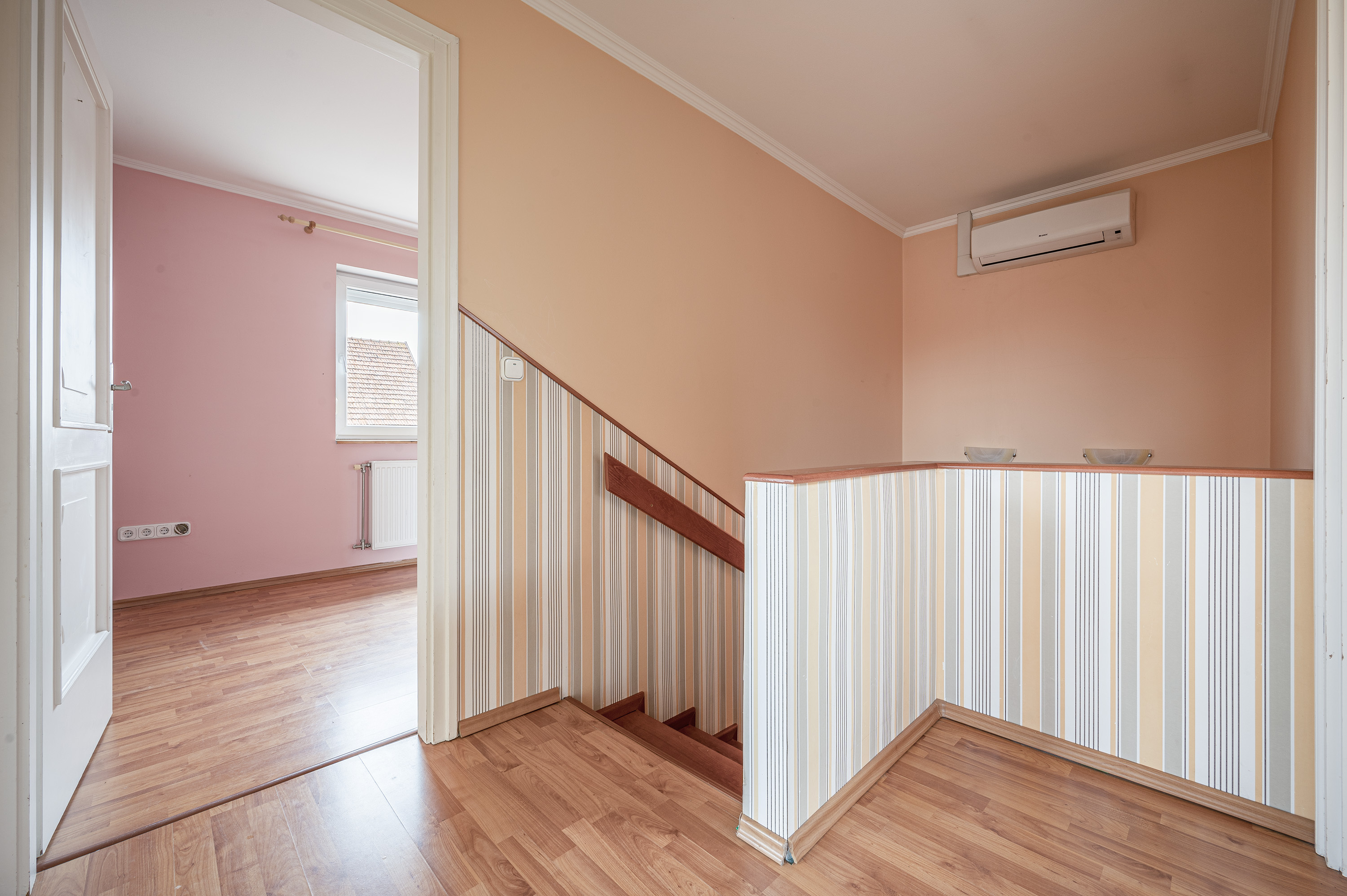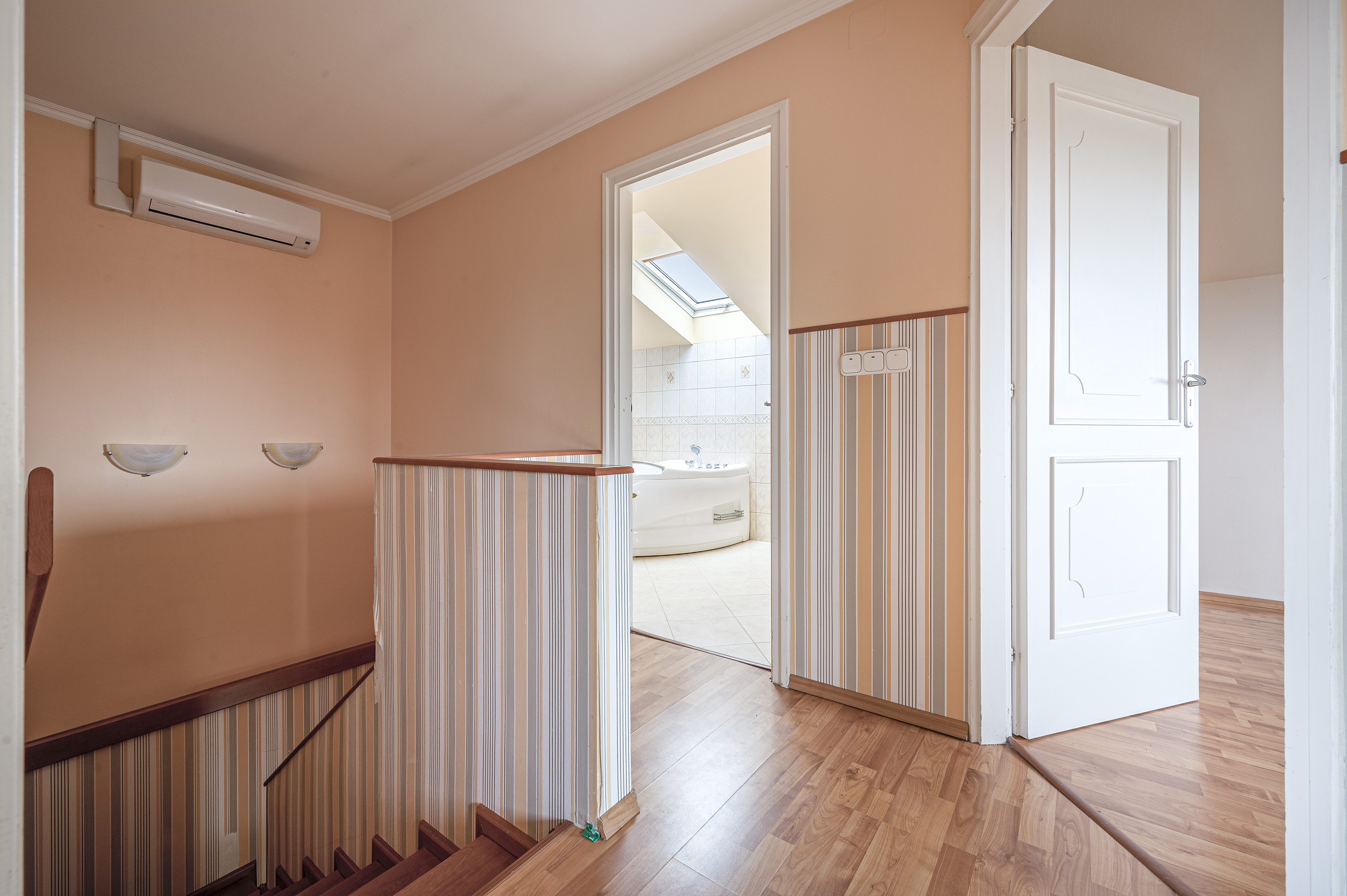 A staircase with real wood panelling by a carpenter leads upstairs, where there are three bedrooms and a bathroom with bathtub.