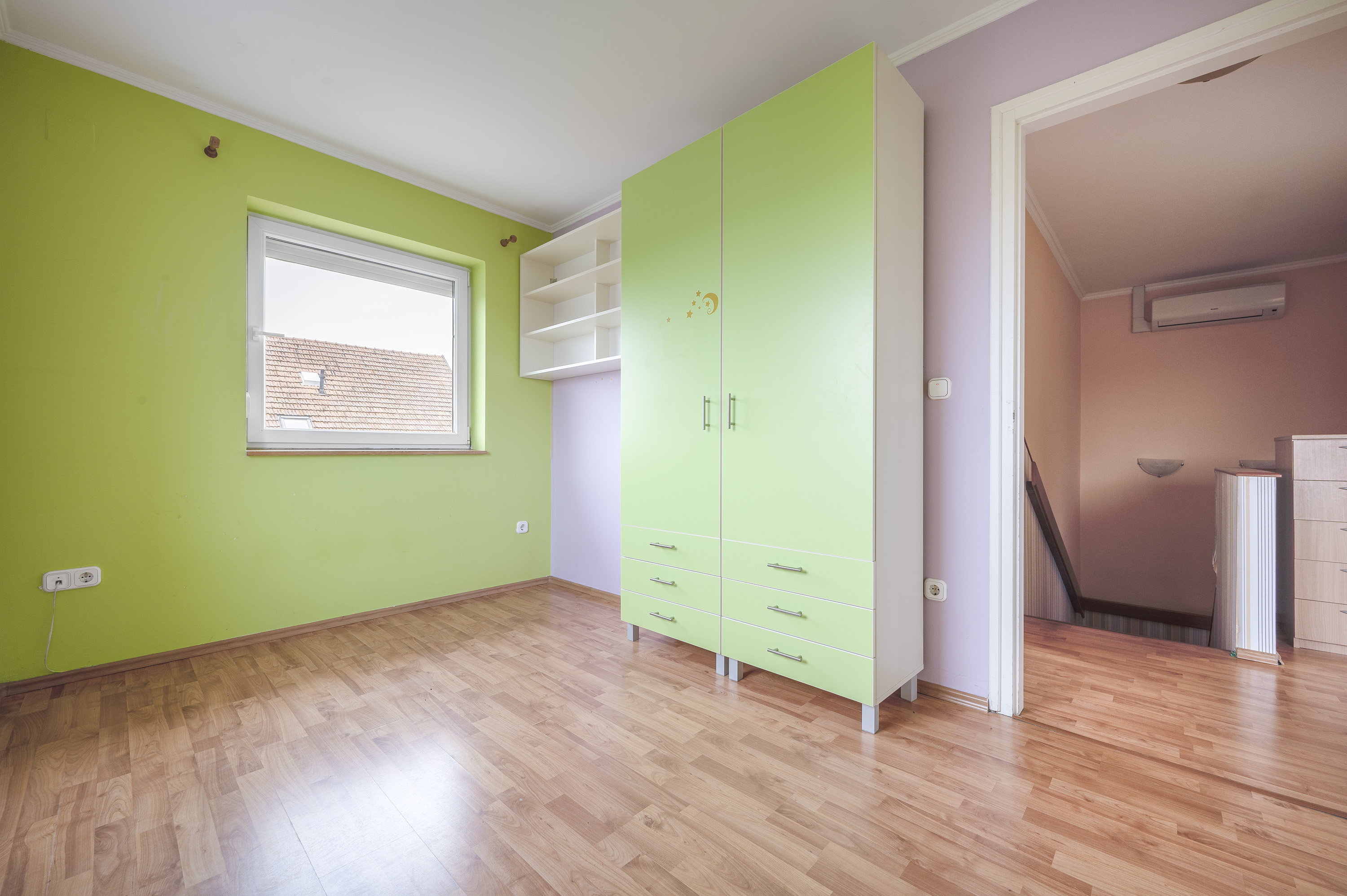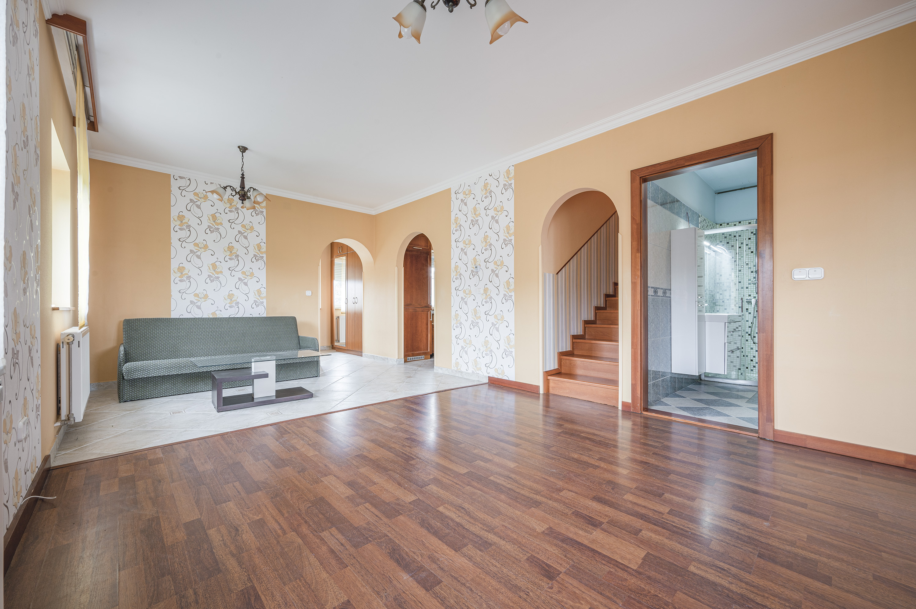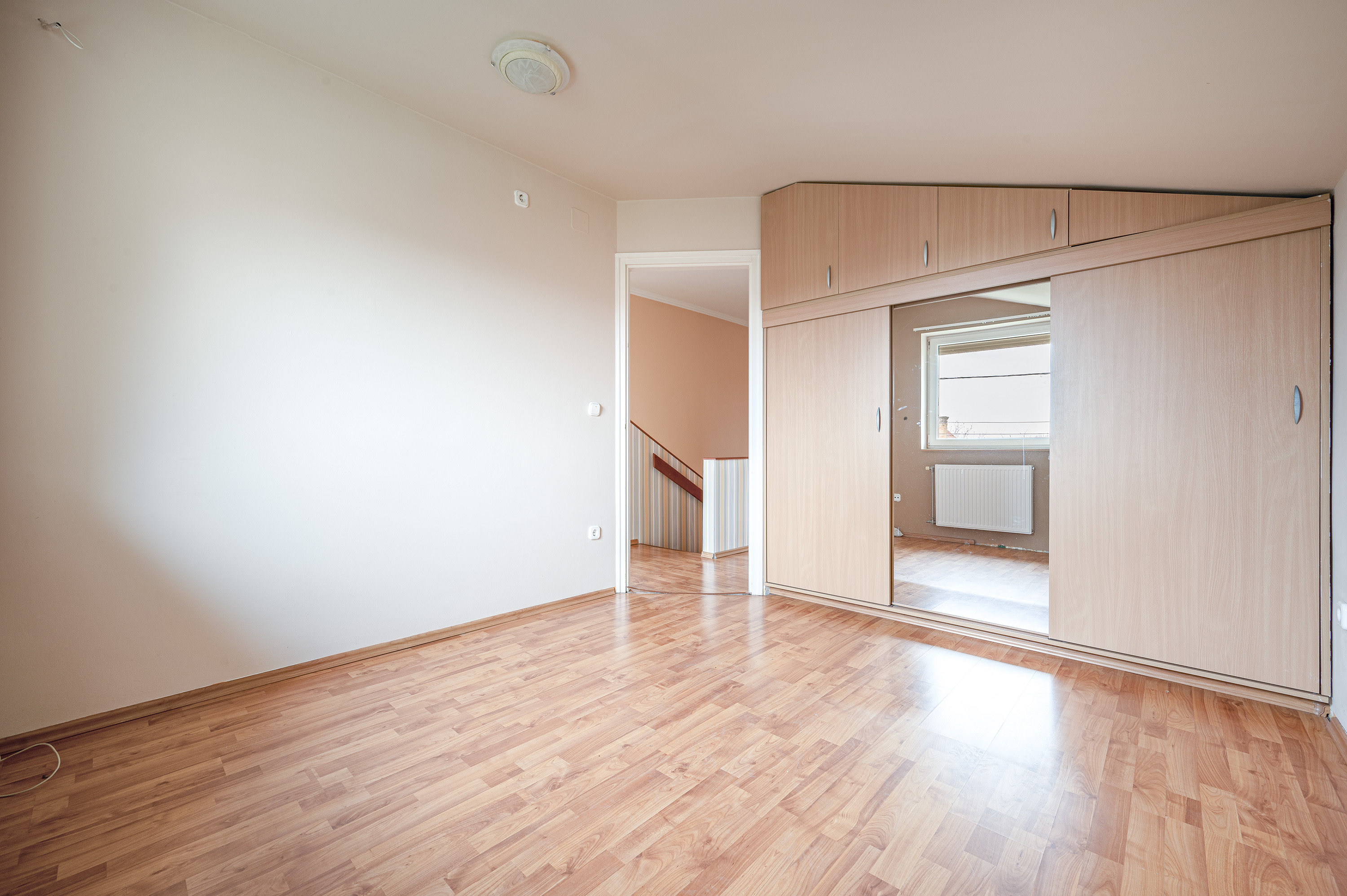 A staircase with real wood panelling by a carpenter leads upstairs, where there are three bedrooms and a bathroom with bathtub.
