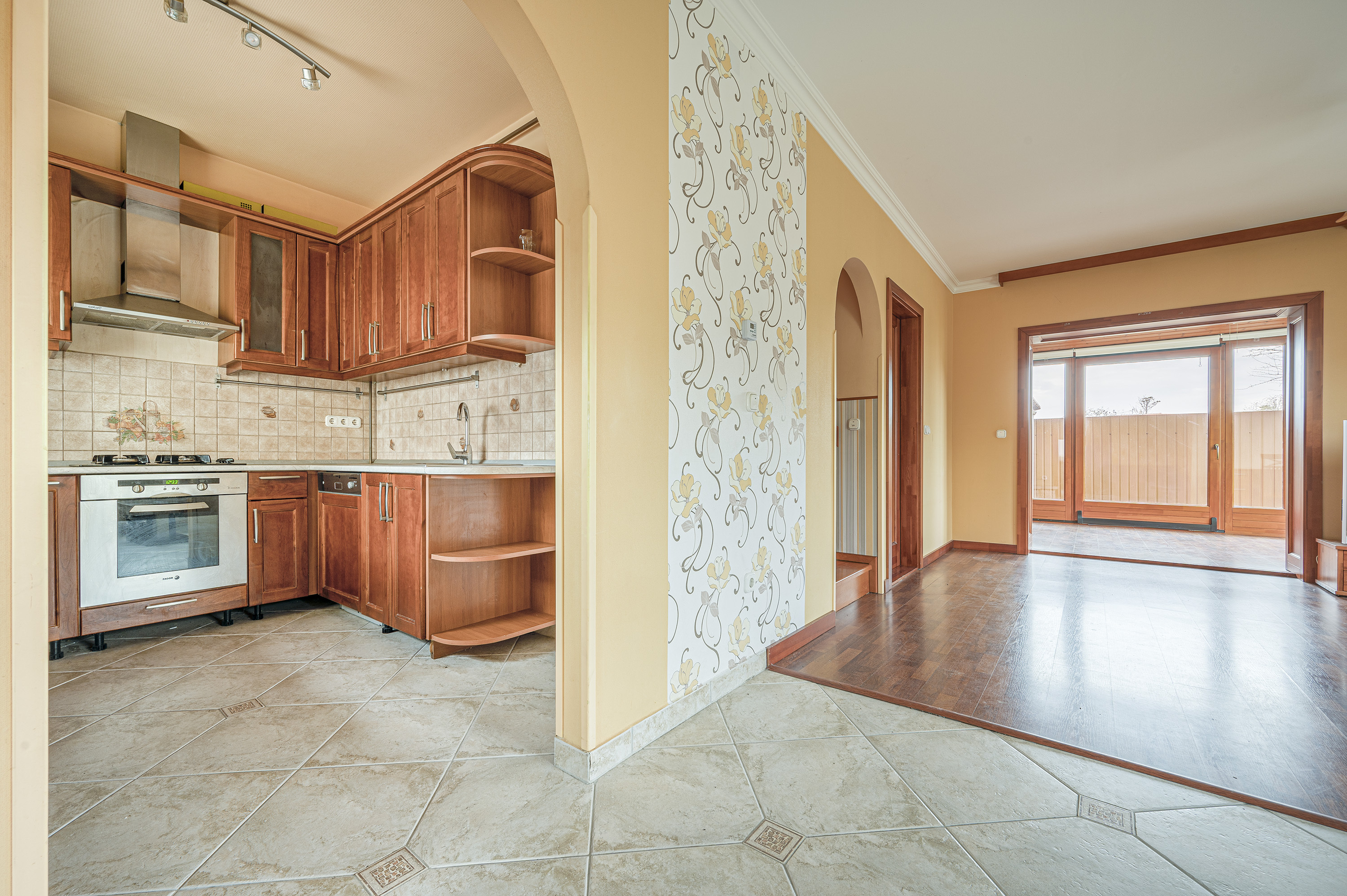 The lower level of the 2-storey 3-bedroom, 2-bathroom property has been replaced by an entrance hall with built-in wardrobe, a fully fitted kitchen with pantry, a bathroom with shower and toilet and a living room.