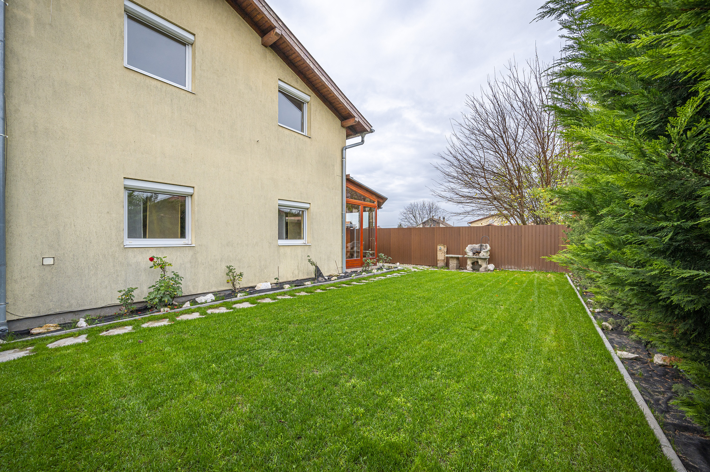 The property is located in a quiet side street, with no through traffic, on a 262 sqm plot. Access to the communal parking area of the townhouse is via an electric gate, where 3 car parking spaces are available exclusively for this property. The garden has a landscaped, well-kept lawn with an electric irrigation system for watering the grass and vegetation. There is also a garden barbecue and a 10 sqm storage room.