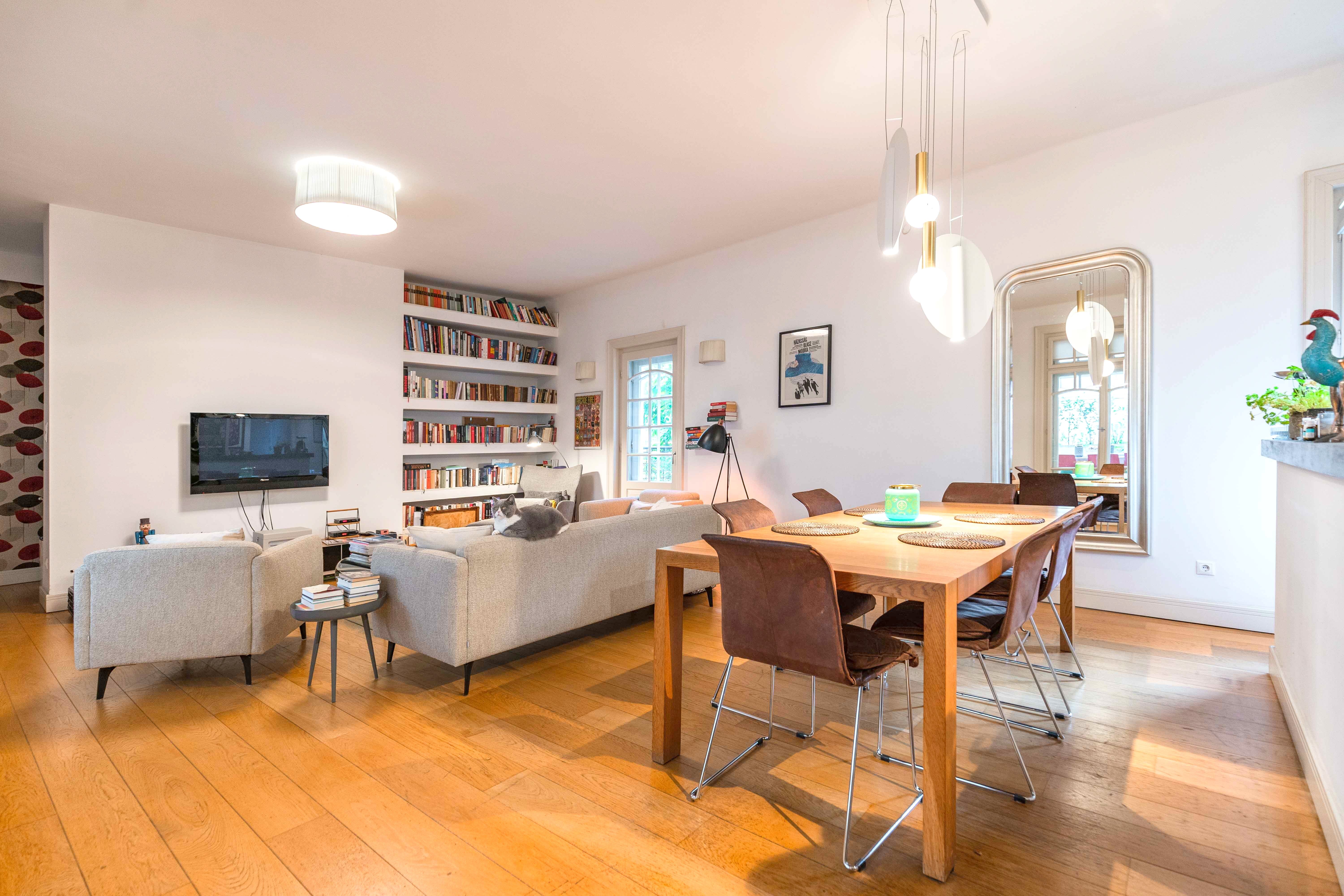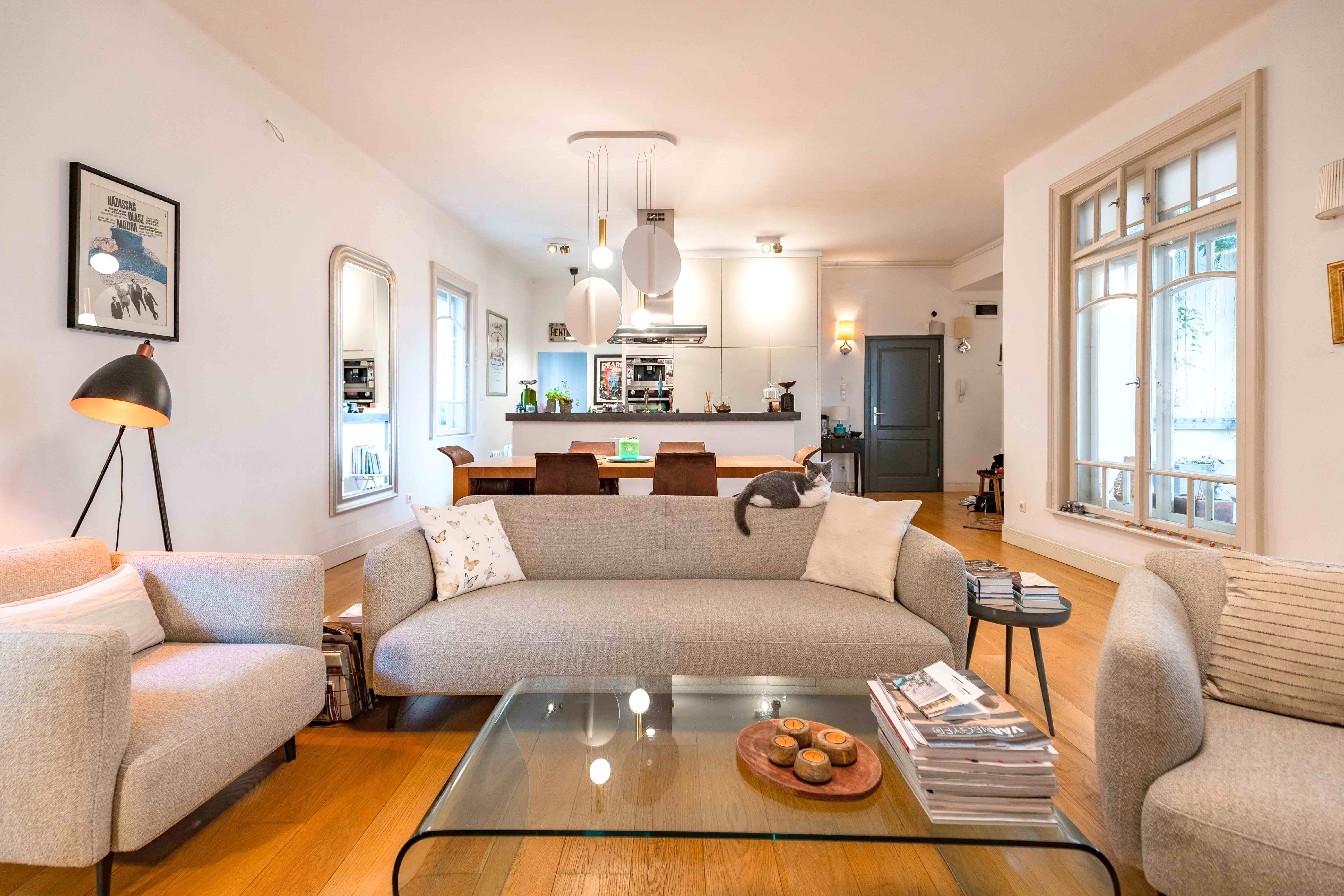 Entering the property, the entrance hall leads directly into an extremely spacious 60 sqm open plan living room with American kitchen. The bourgeois atmosphere of the room has been preserved with floor-to-ceiling, divided, original windows, high ceilings and classic-style wooden skirting boards and accessories. Genuine oak hardwood flooring has been laid throughout the property. The kitchen has been designed with one of the most modern contemporary solutions, IVANKA exposed concrete island.