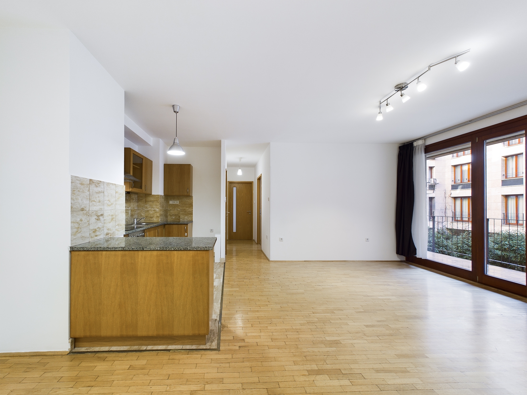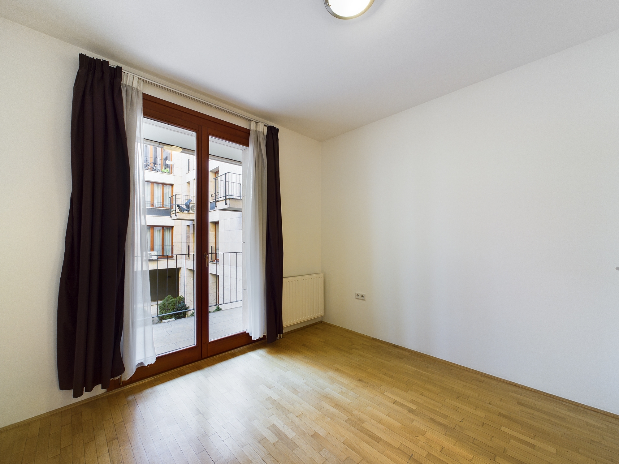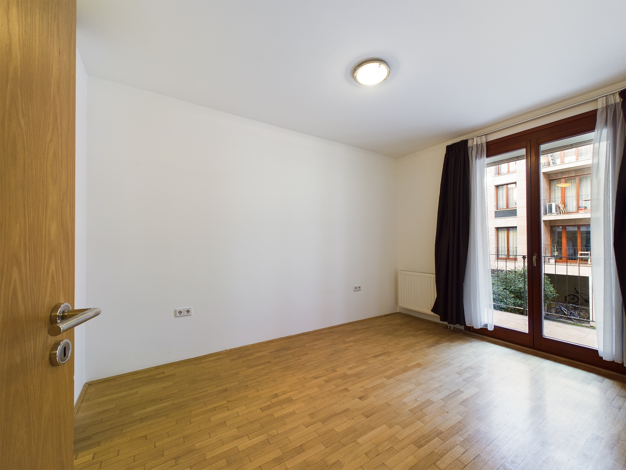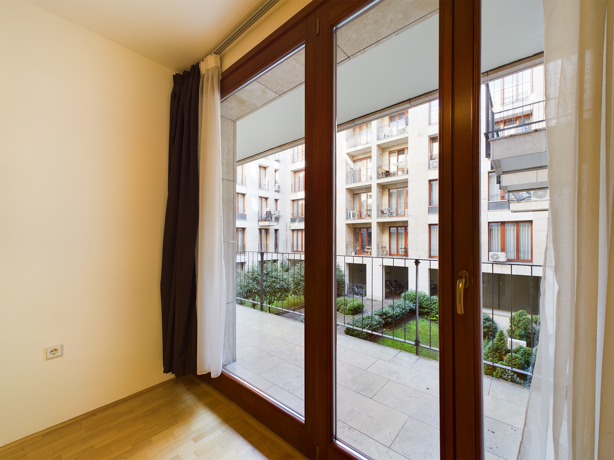 73 sqm // 1st floor apartment with green garden view // living room with American kitchen // 2 bedrooms // walk-in closet // bath with bathtub + guest toilet // 2,7m ceiling height // huge floor-to-ceiling windows // 24h reception and CCTV