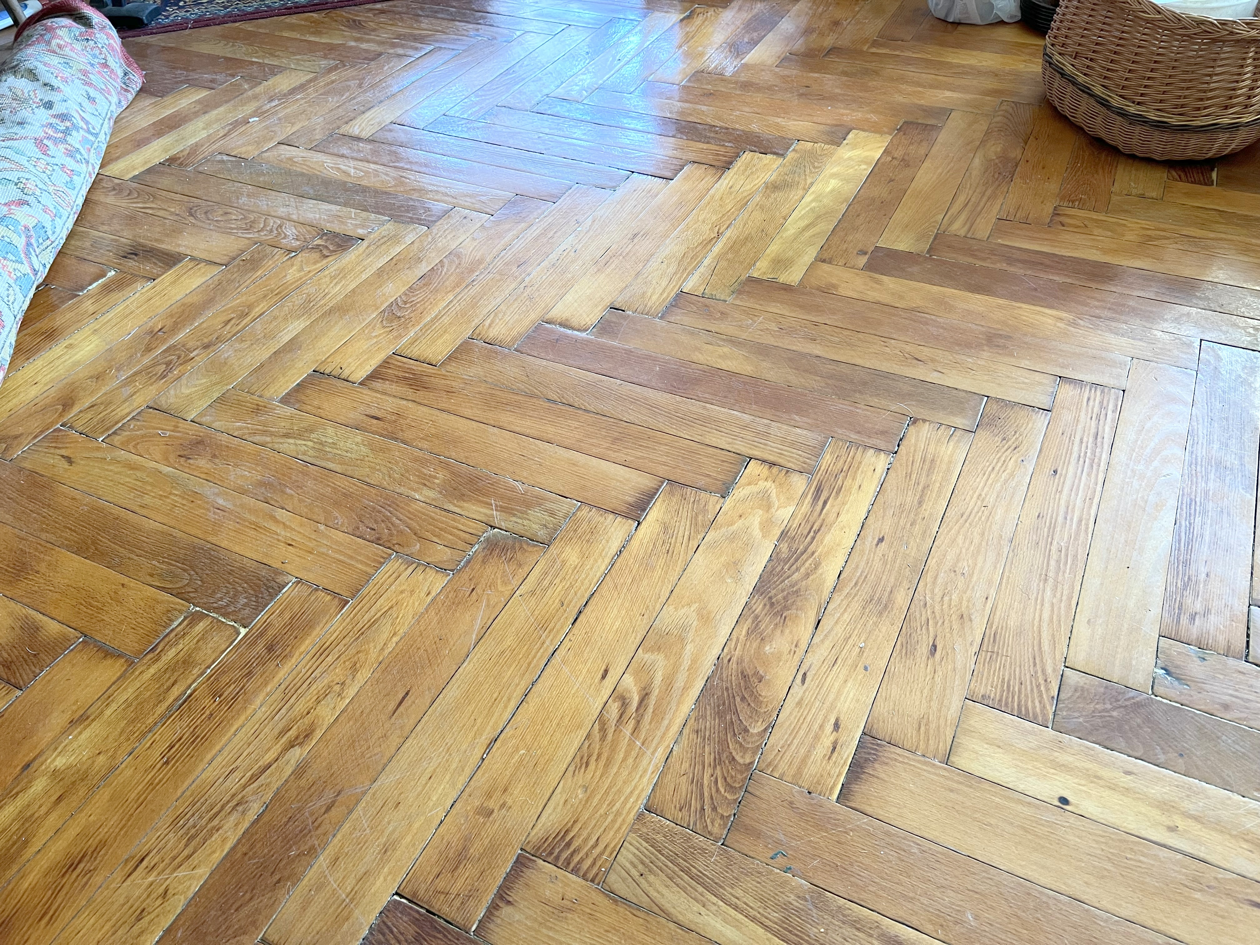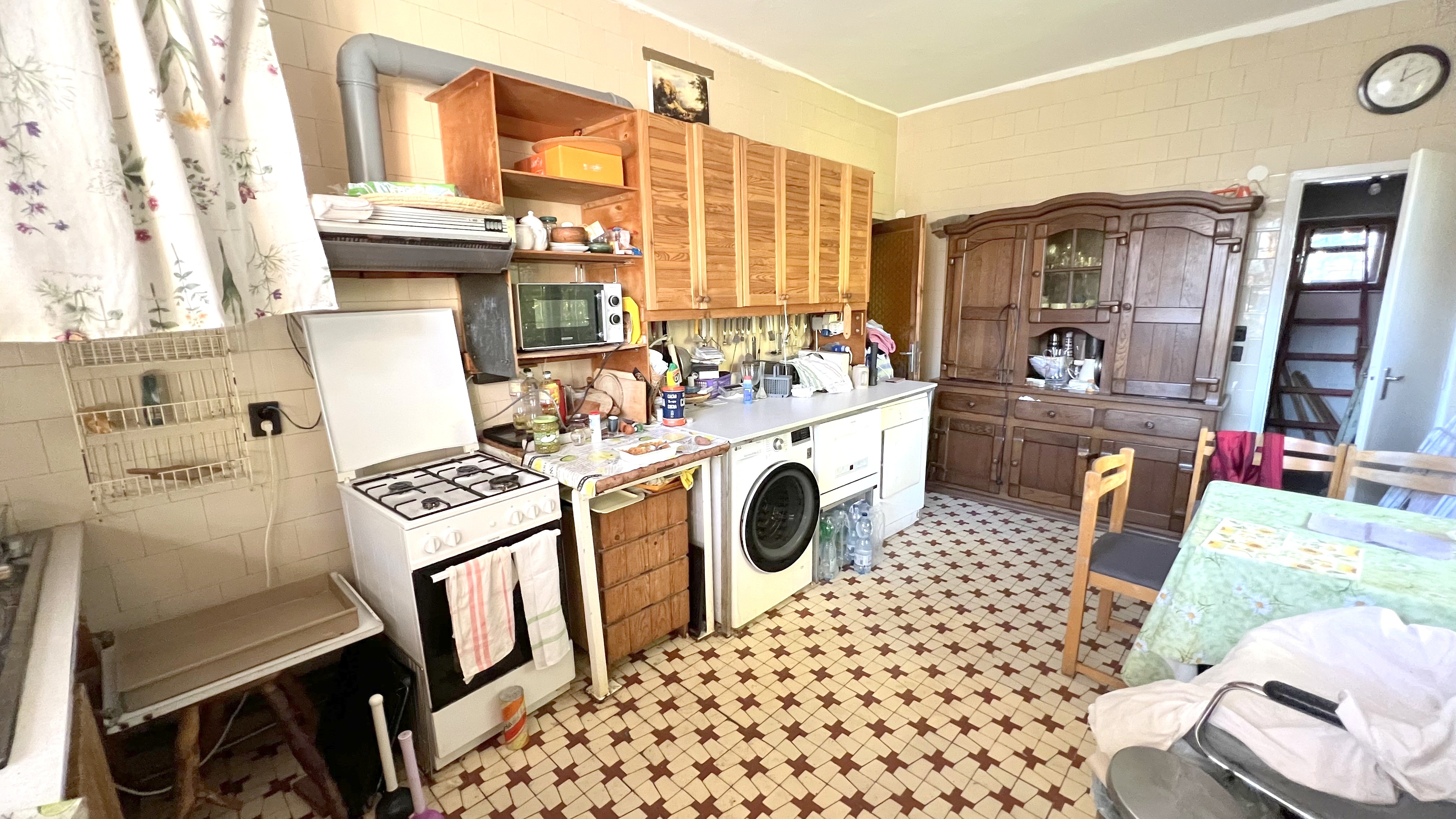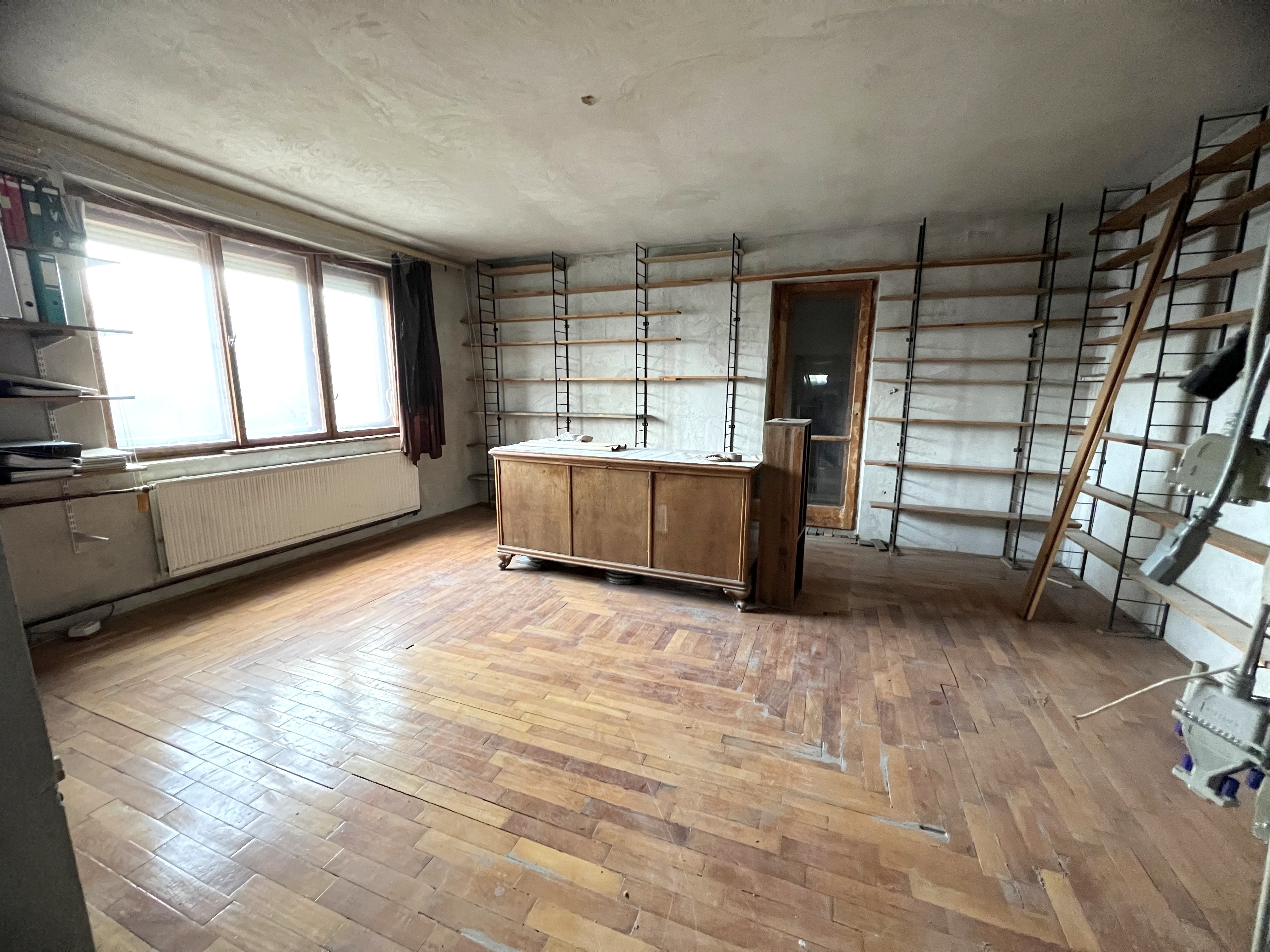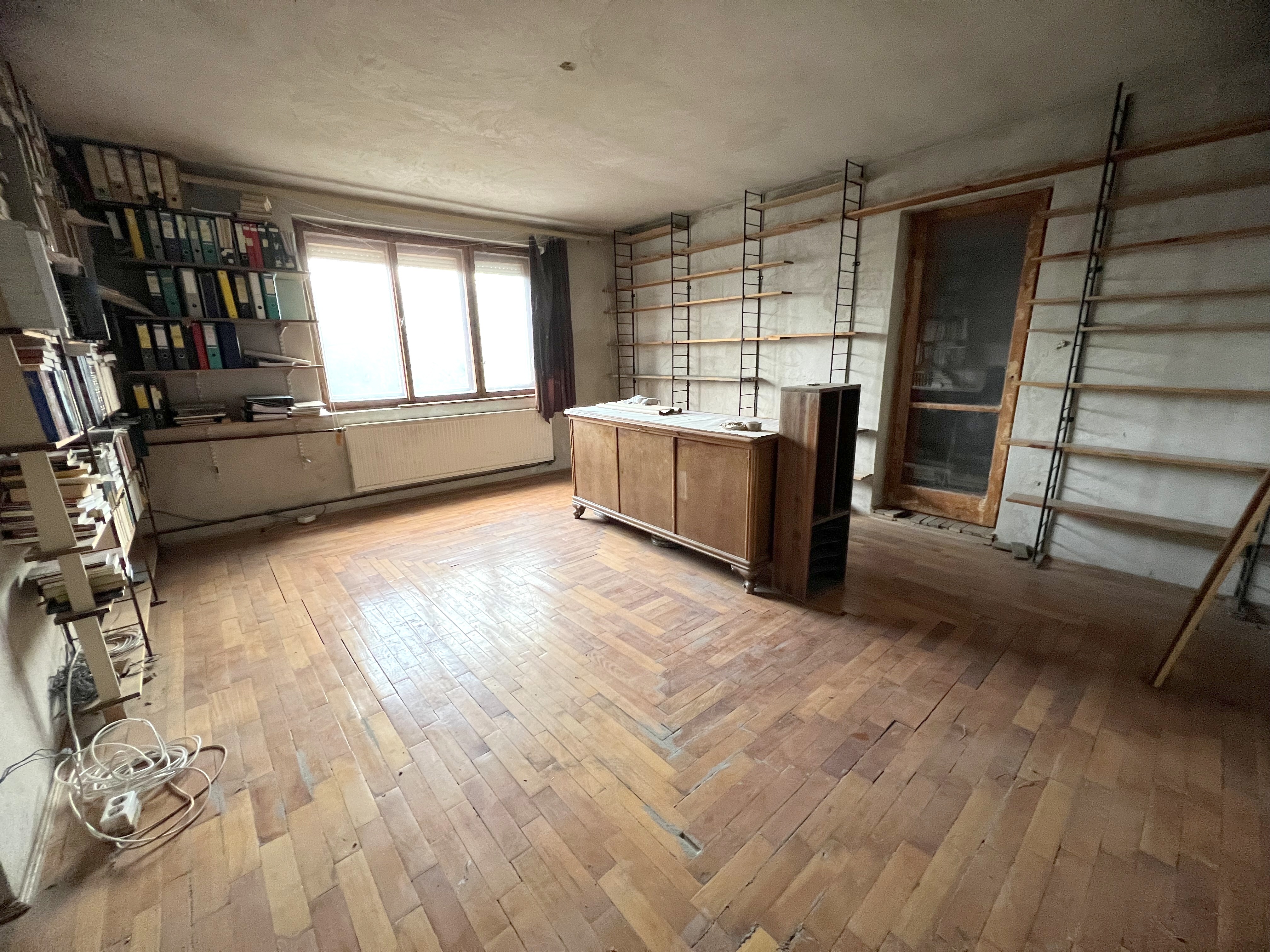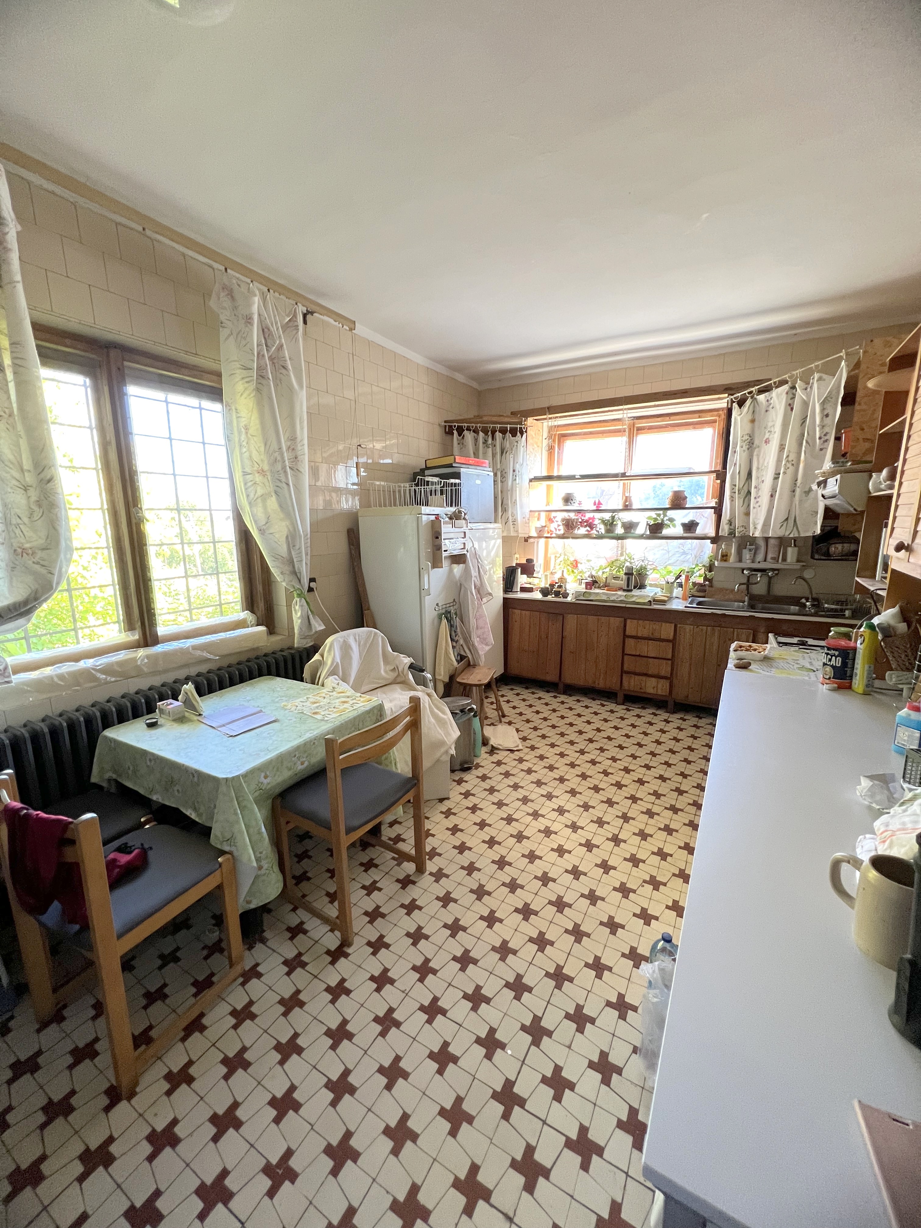 On the ground floor there is a very spacious 40sqm living room with lots of windows, a bourgeois scale and atmosphere. In this room the large herringbone wood parquet flooring is of good quality, does not move, has never been sanded, can be renovated. In addition, a full size bedroom has been added on this level. The kitchen is large with an attached pantry.
