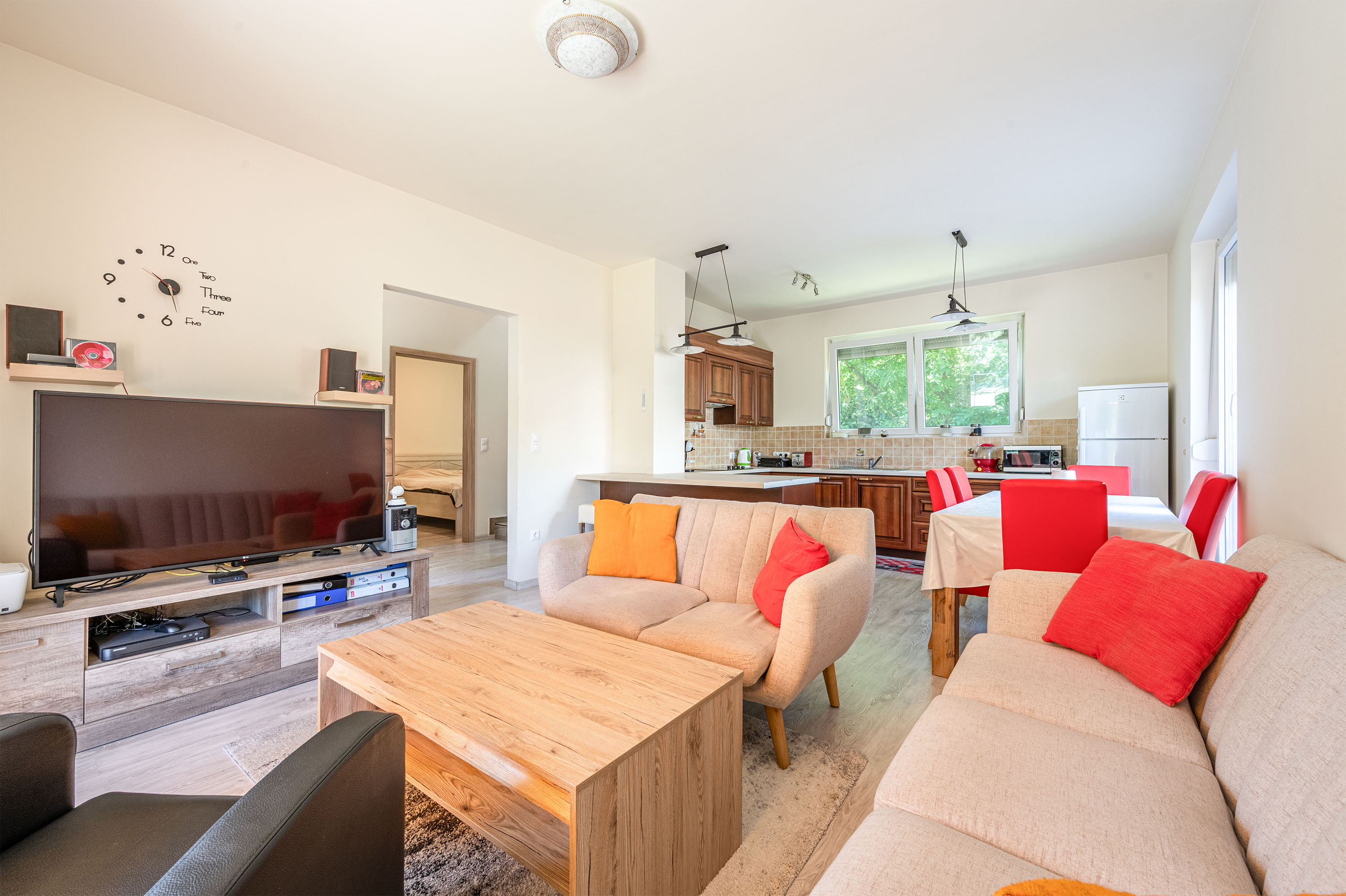 The property features four well-sized bedrooms, two contemporary bathrooms with walk-in showers, and a bright living room perfect for family relaxation. The kitchen is fully furnished and equipped, seamlessly connected to the dining area for convenient daily living.
