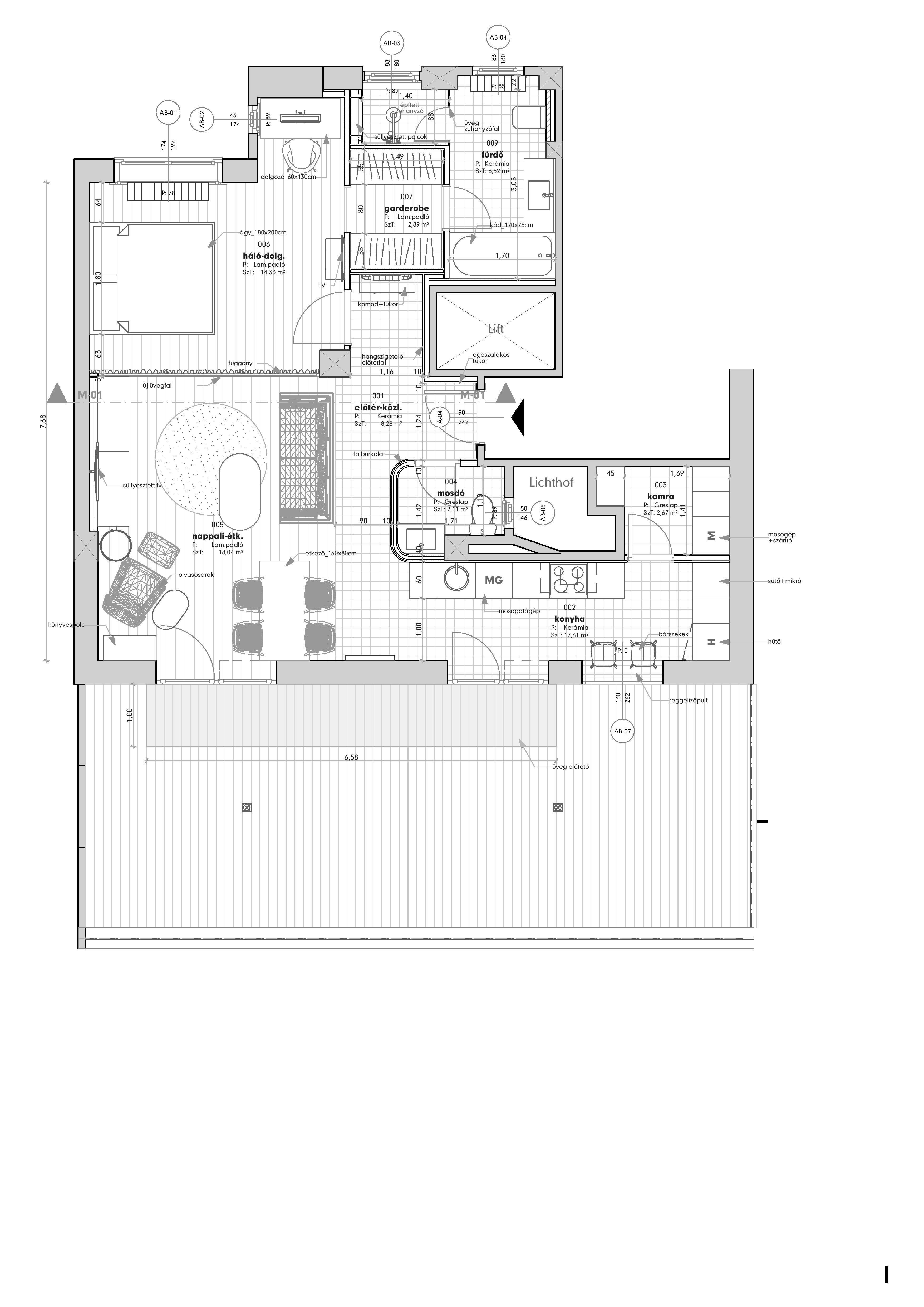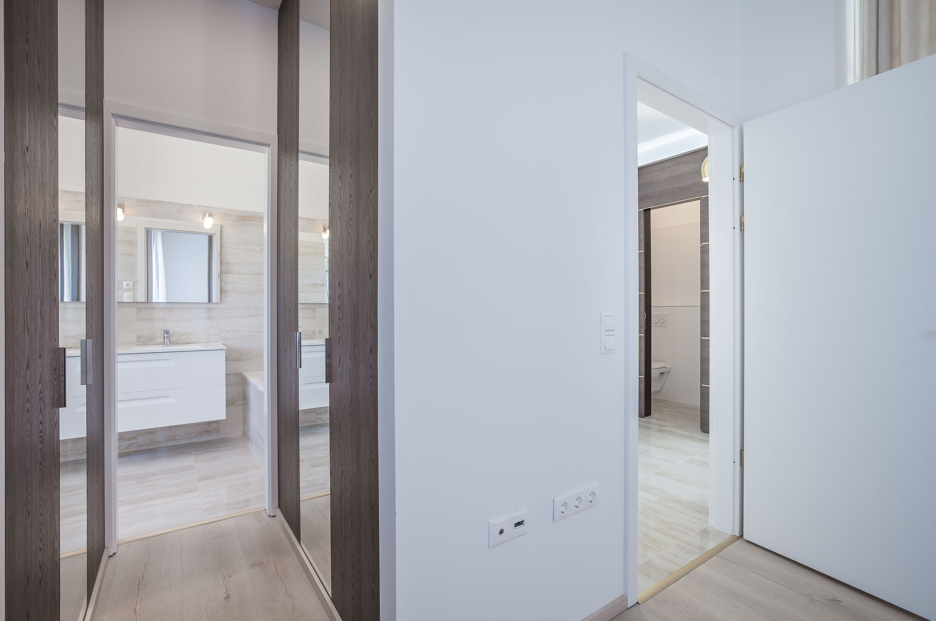 Custom-made designer kitchen with Siemens ceramic hob, oven, extractor hood, built-in microwave, fridge, freezer, and dishwasher. You can store everything in the two ceiling-to-ceiling built-in wardrobes in the bedroom. Once the details of the contract are known, the complete furnishing of the apartment can be negotiated.