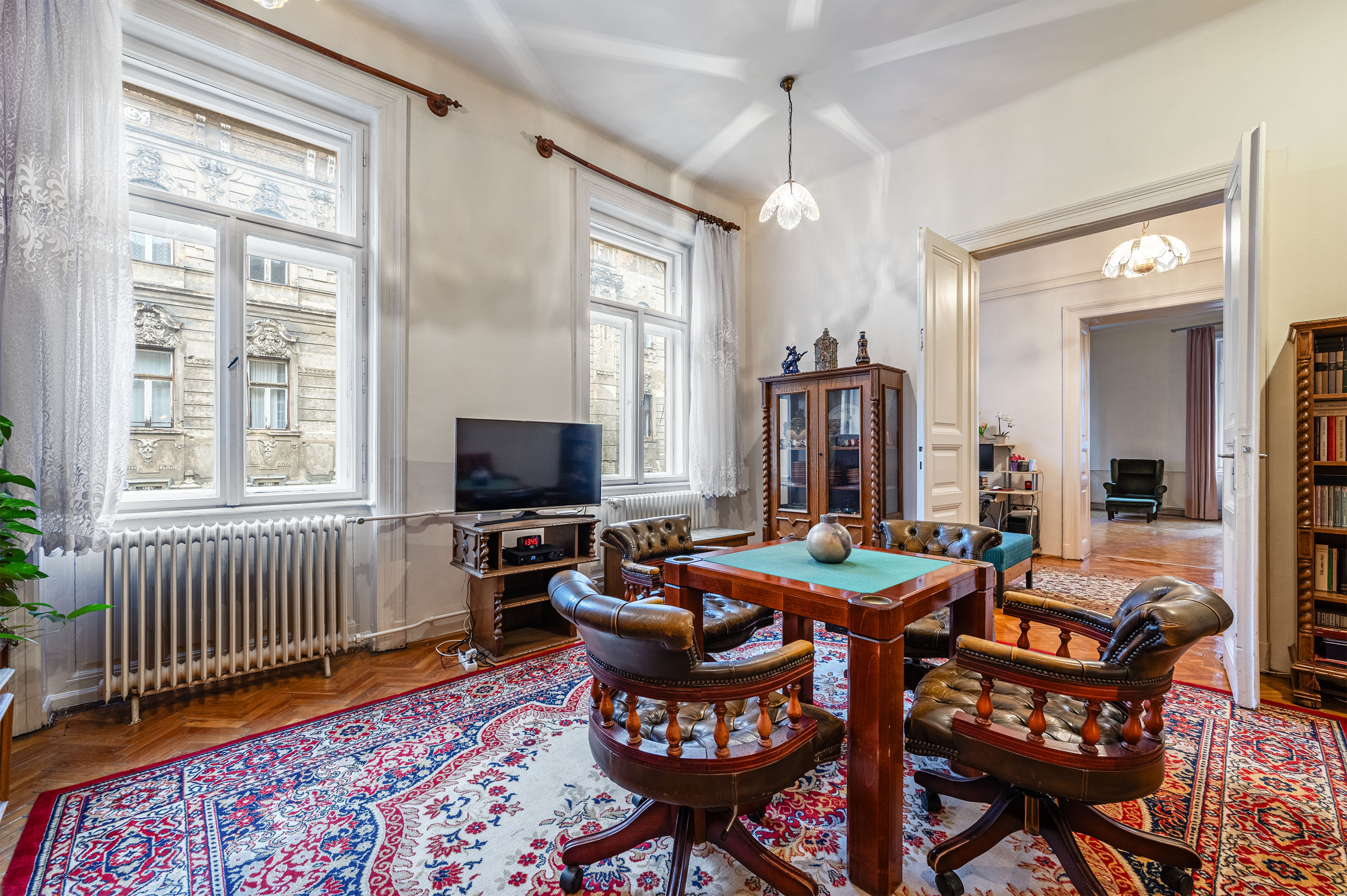 Step into this sunlit, 100 sqm brick-built civil style apartment on the second floor of a classic building in the heart of Budapest's vibrant District VII. Featuring spacious rooms, original parquet flooring, and soaring 3.4-meter interior heights, this property offers both elegant living and a warm, inviting atmosphere.