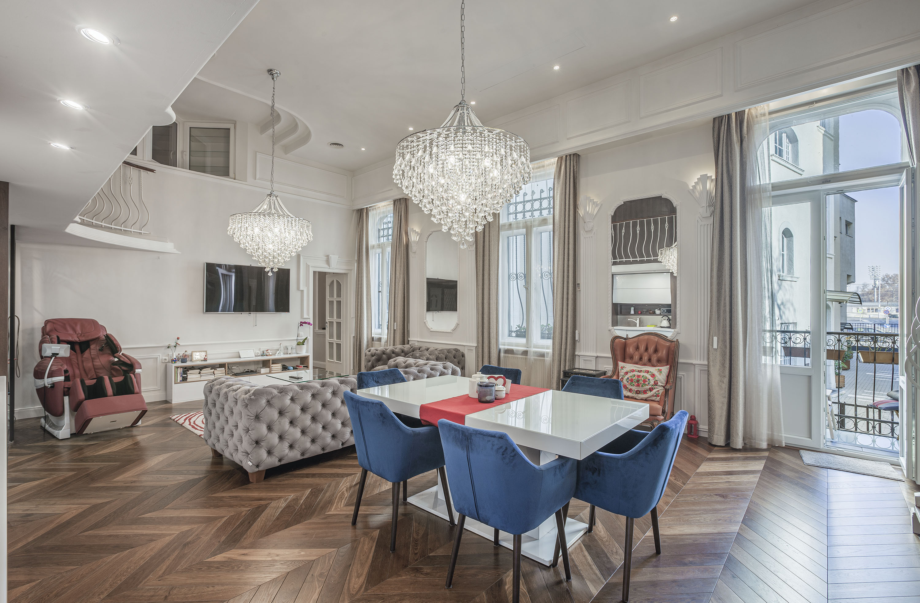 In this villa house with a special atmosphere, I am offering for sale interior two-storey exclusive apartment, in which the patinated details of the apartment are combined with modern elements with a refined sense. According to the apartment's title deed, it is 94 sqm, which is actually 110 sqm, calculated with half of the 33sqm standing gallery. On the lower level, which is 94sqm, we find two bedrooms with private bathrooms, as well as an elegant 48sqm living room with American kitchen. On the upper level, which is 33sqm, we find a study and a third guest bedroom. The apartment is oriented NE, with its windows facing Heroes' Square.