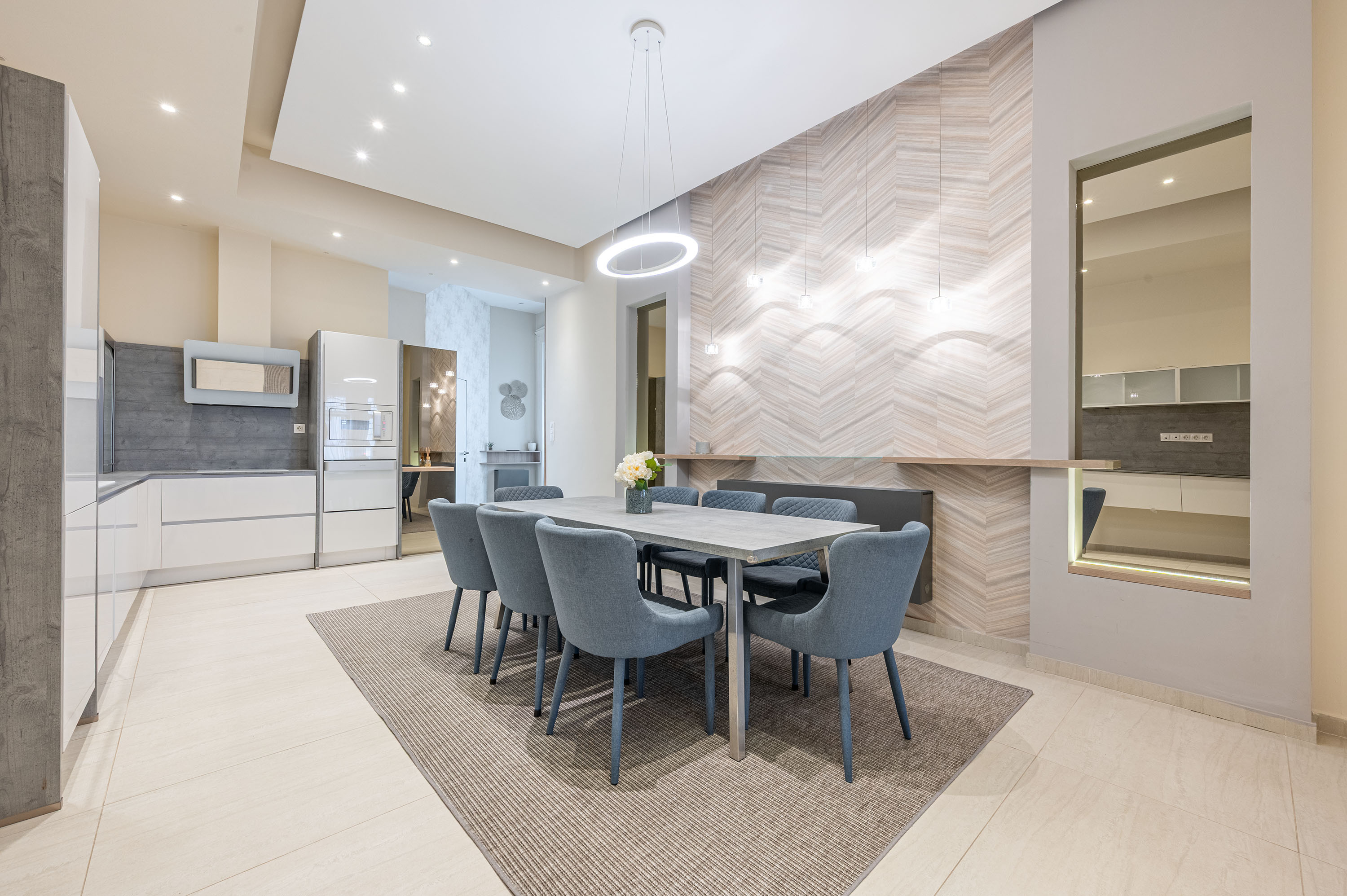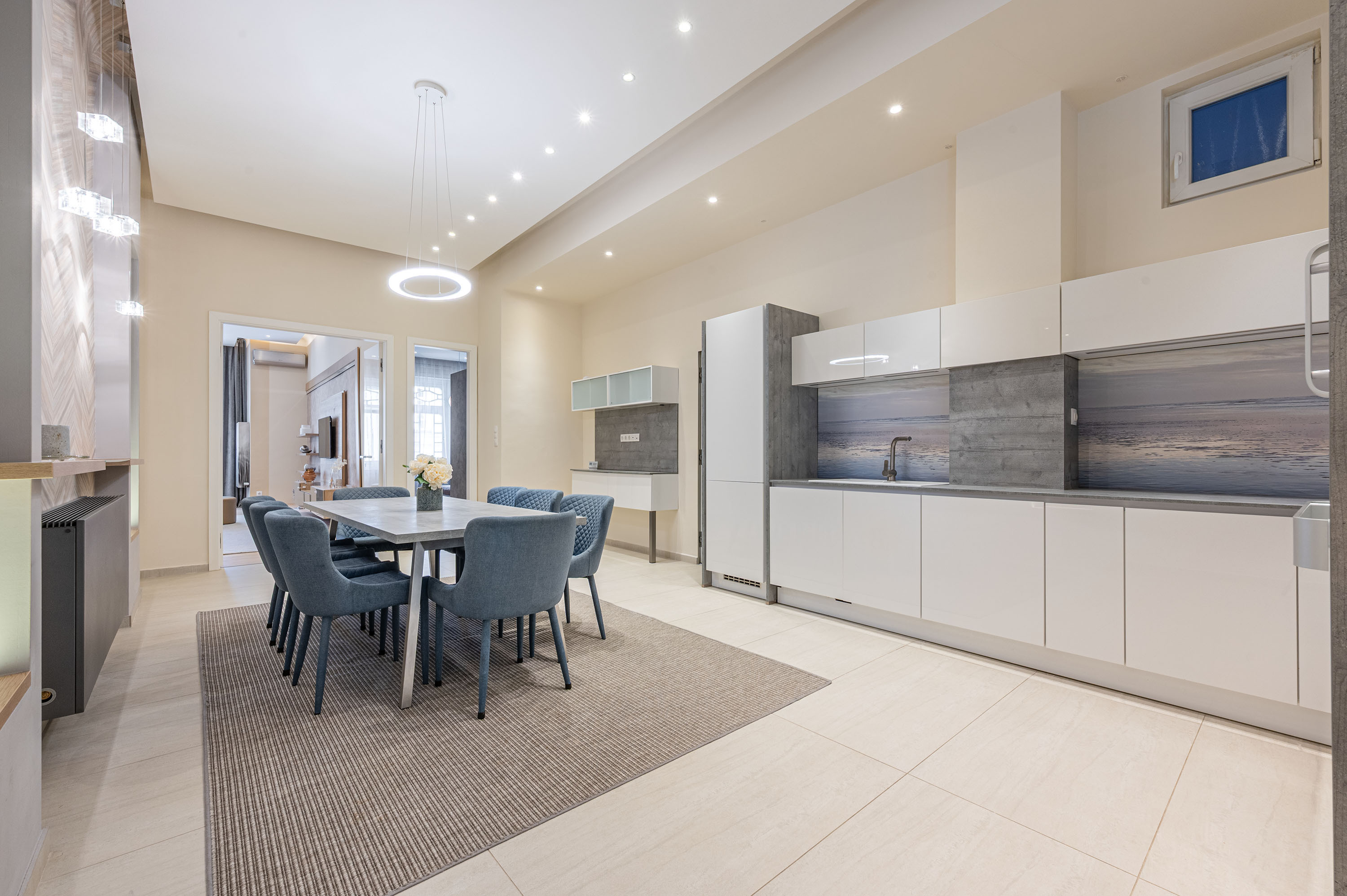 This stunning, fully furnished upstair apartment offers 124 sqm of stylish living space, thoughtfully renovated to combine modern comfort with classic civil style architecture. The home features two spacious bedrooms, each with private bathroom facilities, providing a luxurious level of privacy for residents or guests. The open-plan living and dining areas create a welcoming environment, enhanced by high ceilings and a bright, contemporary design.