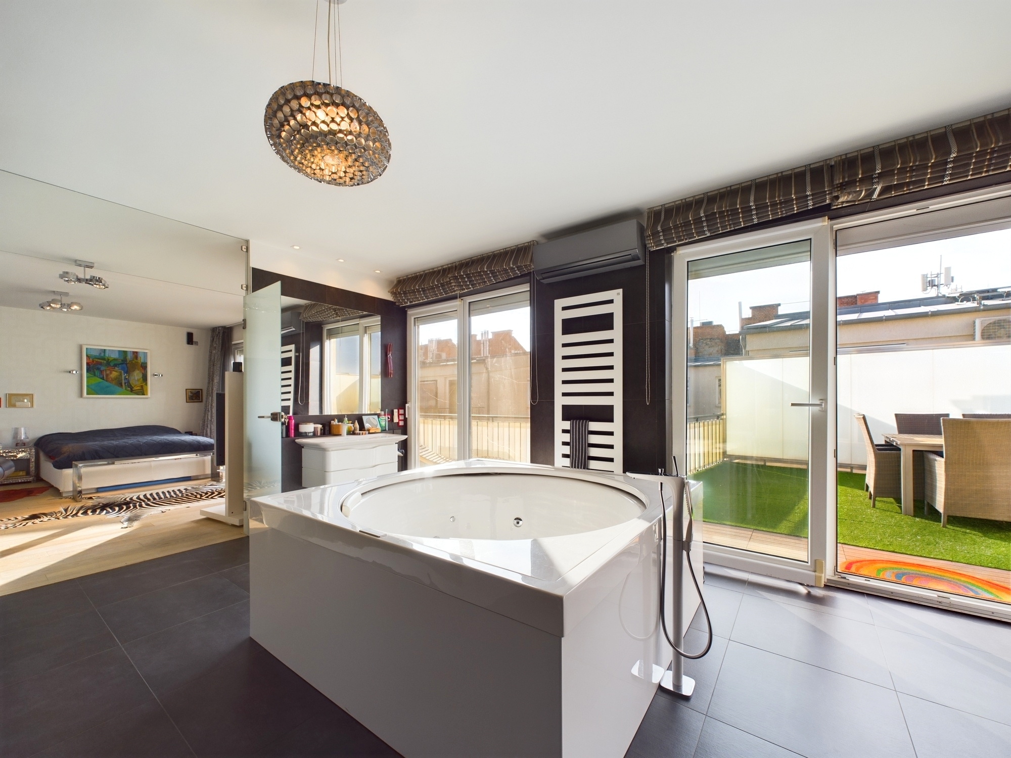 The stairs are loft style black steel stairs. Upstairs there is a guest bedroom with storage and an adjoining large en-suite bathroom with bath, bidet and urinal. This also has access to a terrace. Adjacent is the master bedroom with built in sized closet system. This opens to the separate 20 sqm bathroom with sauna, extra large circular jacuzzi, bidet, urinal. All rooms have access to the large upstairs terrace.