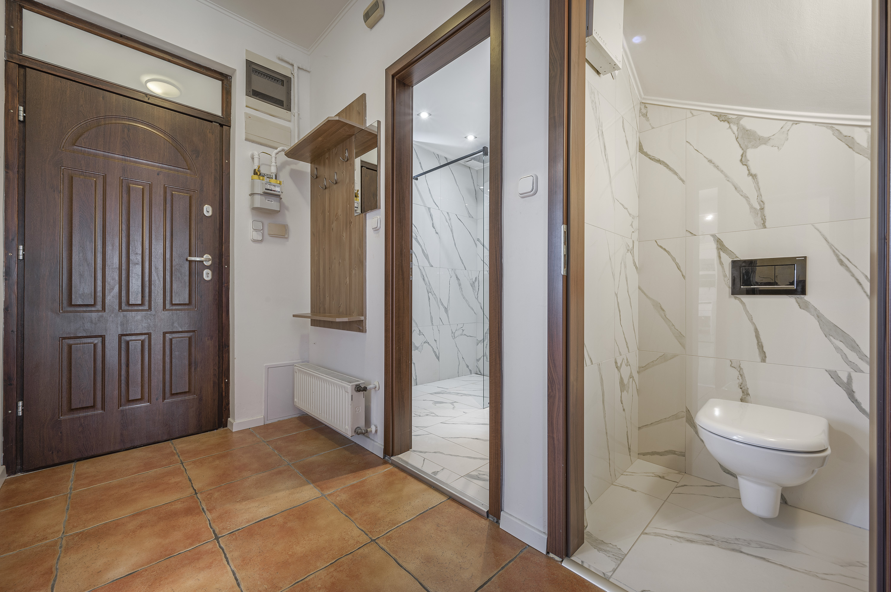 Here in this classy residential 4 apartment row house, I am offering for sale the first apartment on the street front, which was fully renovated in 2021. The apartment is on two levels, on the LOWER FLOOR you will find the spacious living room with American kitchen, dining room, study room off the hallway, and bathroom with shower and separate toilet. From the dining room there is a double sliding patio door to the 20 sqm terrace.