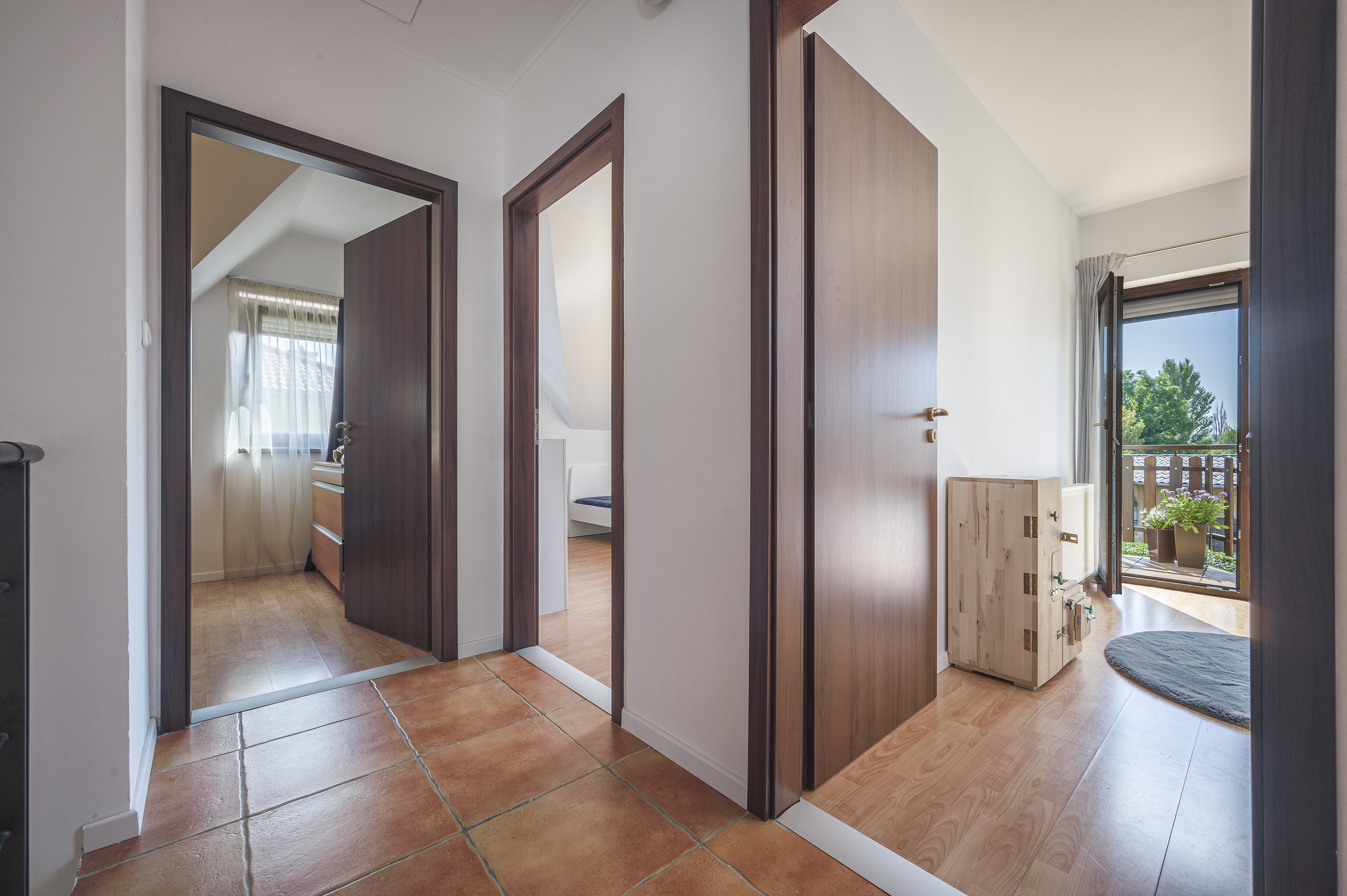 UPSTAIRS there are 3 bedrooms and a bathroom with a bath. The two children's rooms share a balcony, the master bedroom has a large wall-to-wall built-in wardrobe. In the attic, there is a large storage room for out-of-season items.