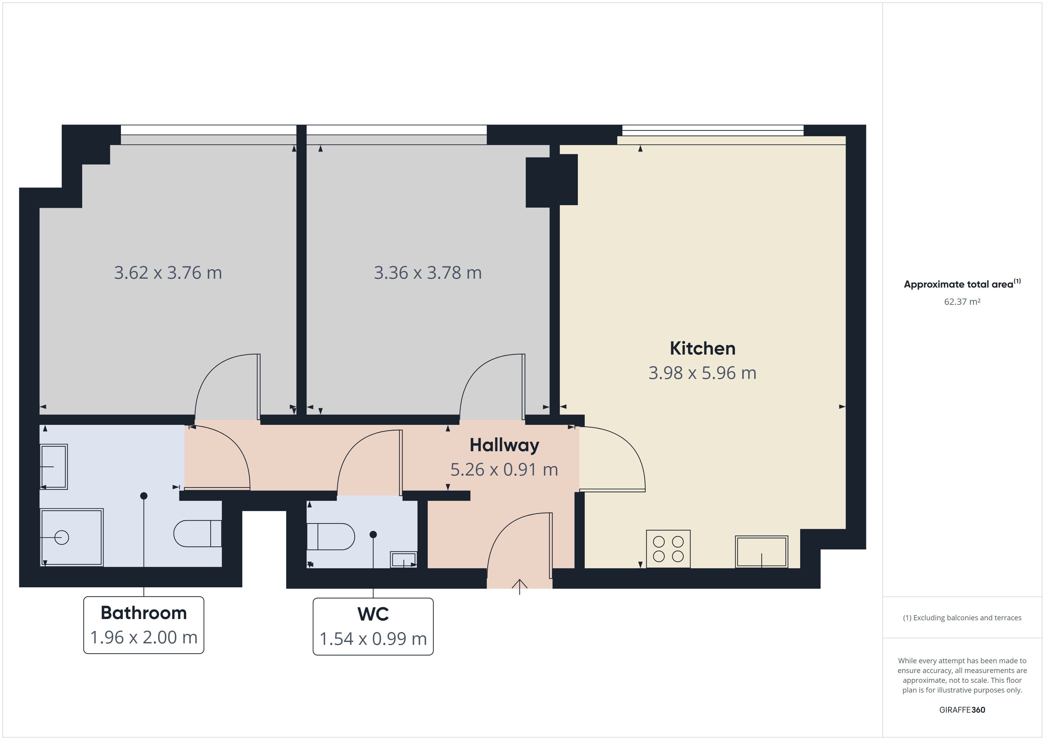 5th floor / courtyard / 61m2 / 2 bedrooms / 1 bathroom / 2 toilets / entrance hall / living room with open-plan kitchen