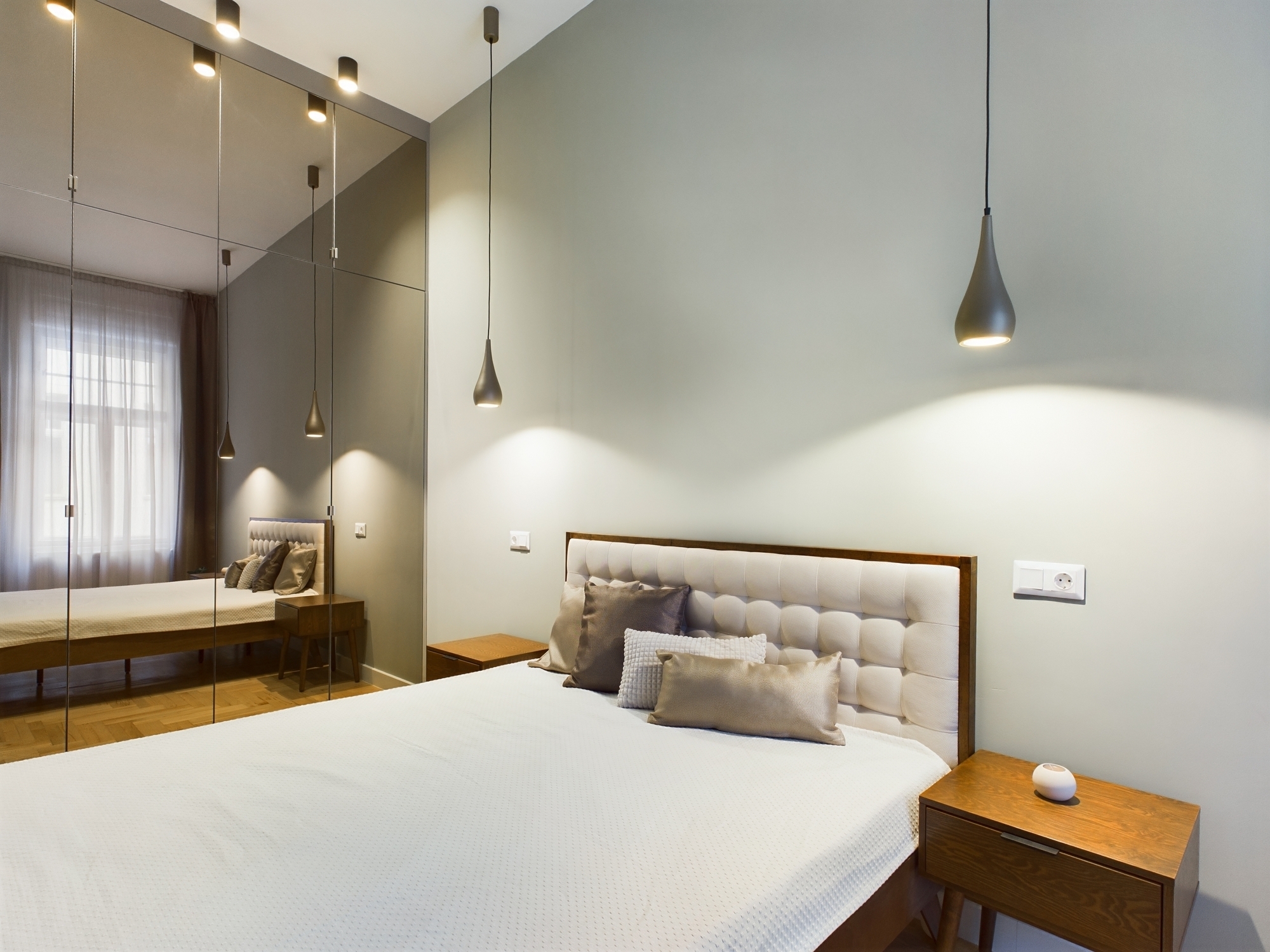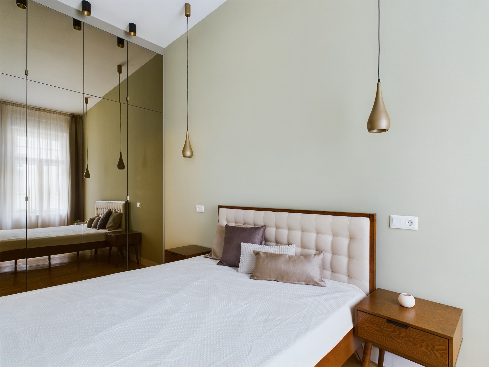 A lakás teljeskörűen fel lett újítva, prémium minőségben. A konyha tágas, Eletrolux gépekkel felszerelt (mosogatógép is). Innen nyílik egy gardróbszoba/tároló, ahol mosó- és szárítógép is helyet kapott. A nappaliban valódi fa padló található, különleges design lámpákkal és bútorokkal berendezett. A hálószobába kettő falba simuló, rejtett ajtón keresztül juthatunk, ahol egy mennyezetig tartó, füstüveggel rendelkező nagyméretű gardróbszekrény is található.