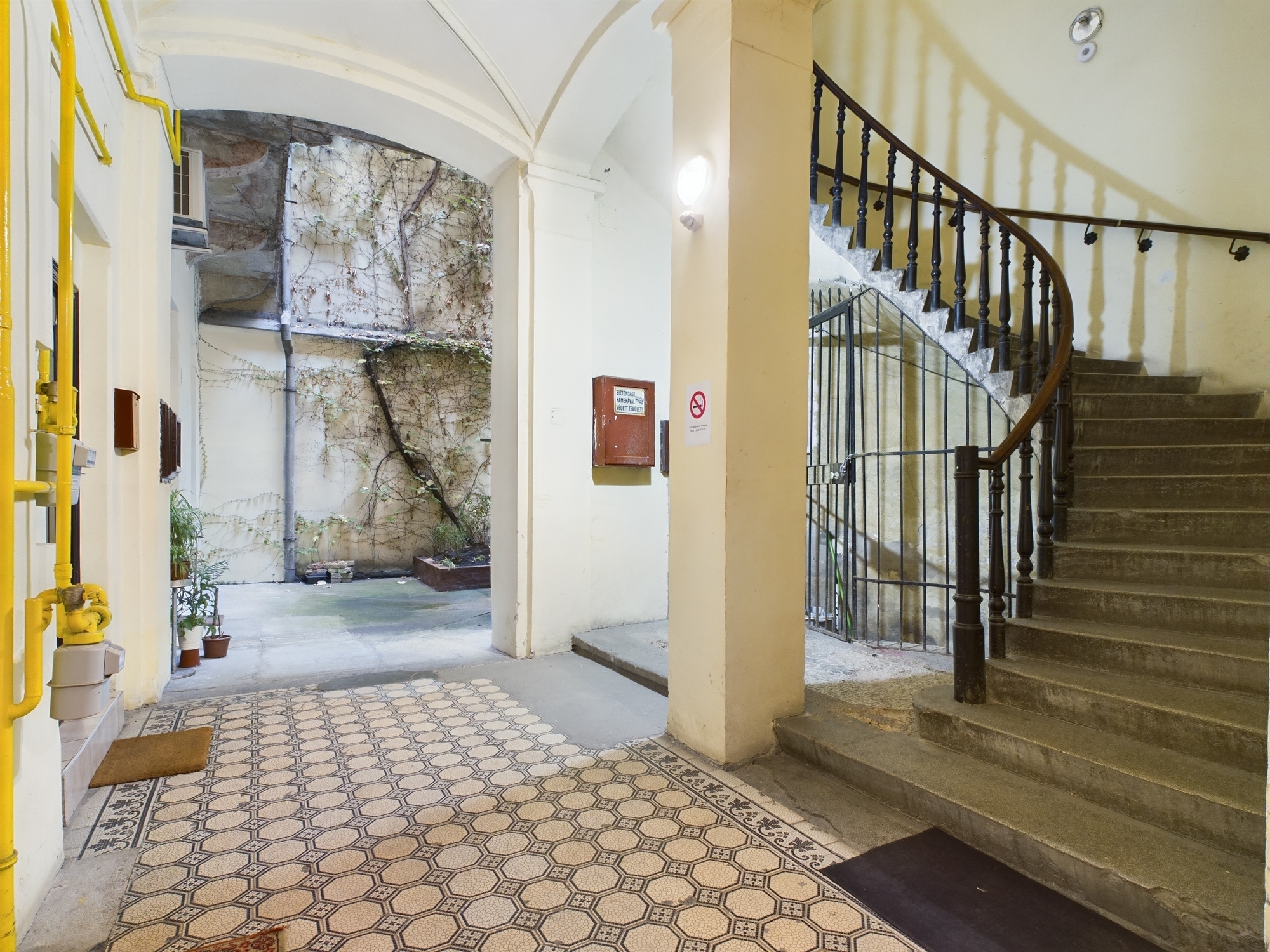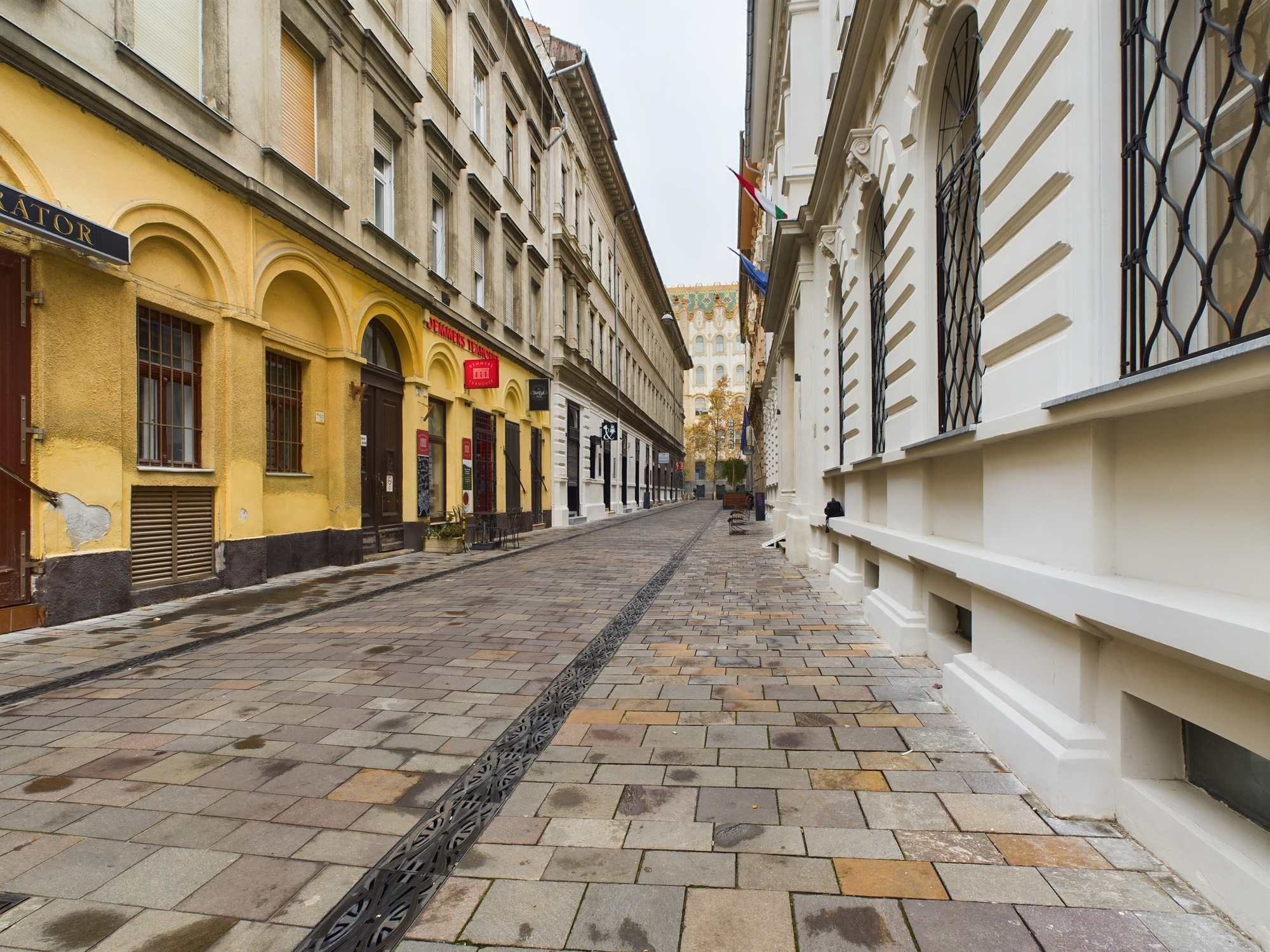 A lakás ablakai sétálóutcára néznek, ahol nincs autóforgalom, kifejezetten csendes és mivel második emeleti lakás, ezért nagyon világos is. Az apartman előtti függőfolyosót csak az itt lakók használják, így oda ki lehet oda ülni egy kávéval, erkélyként is használható.