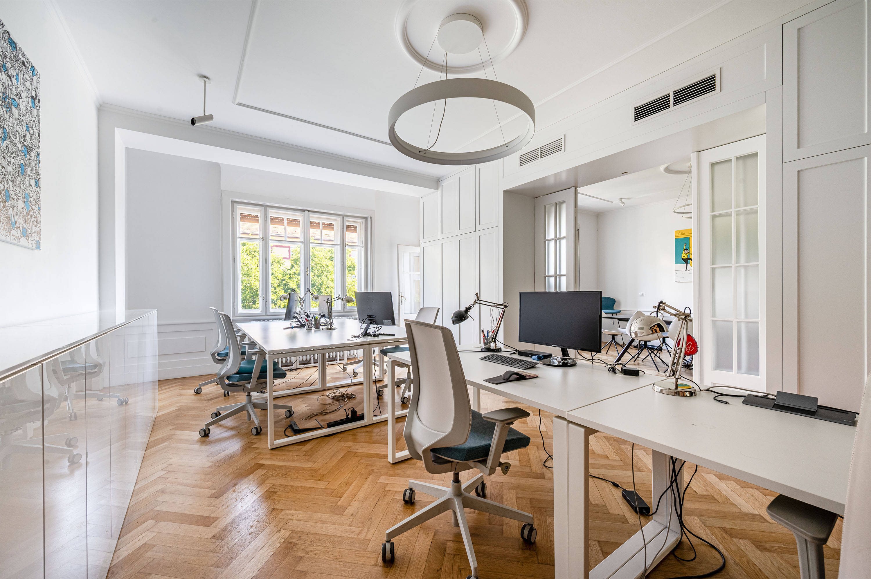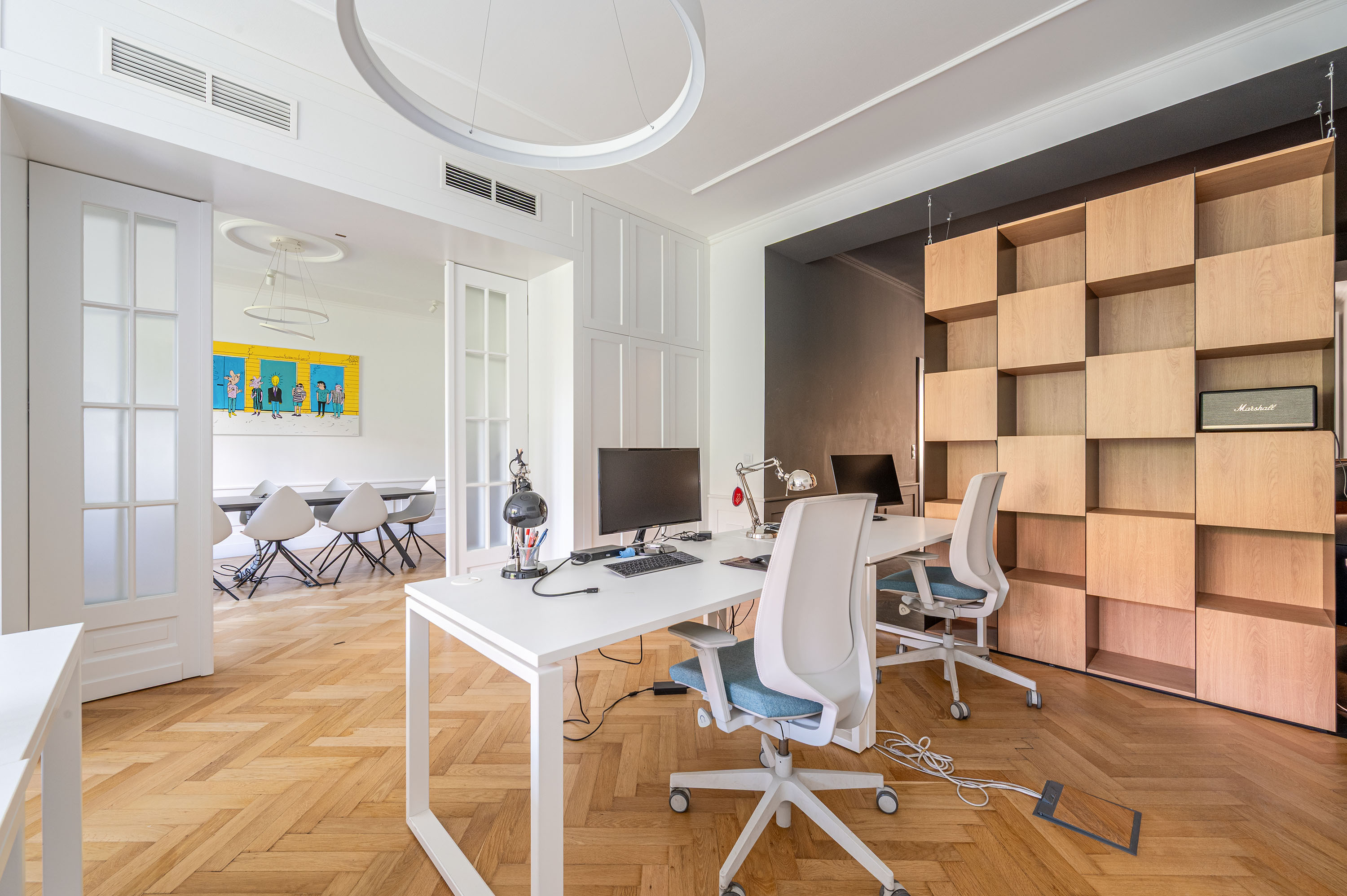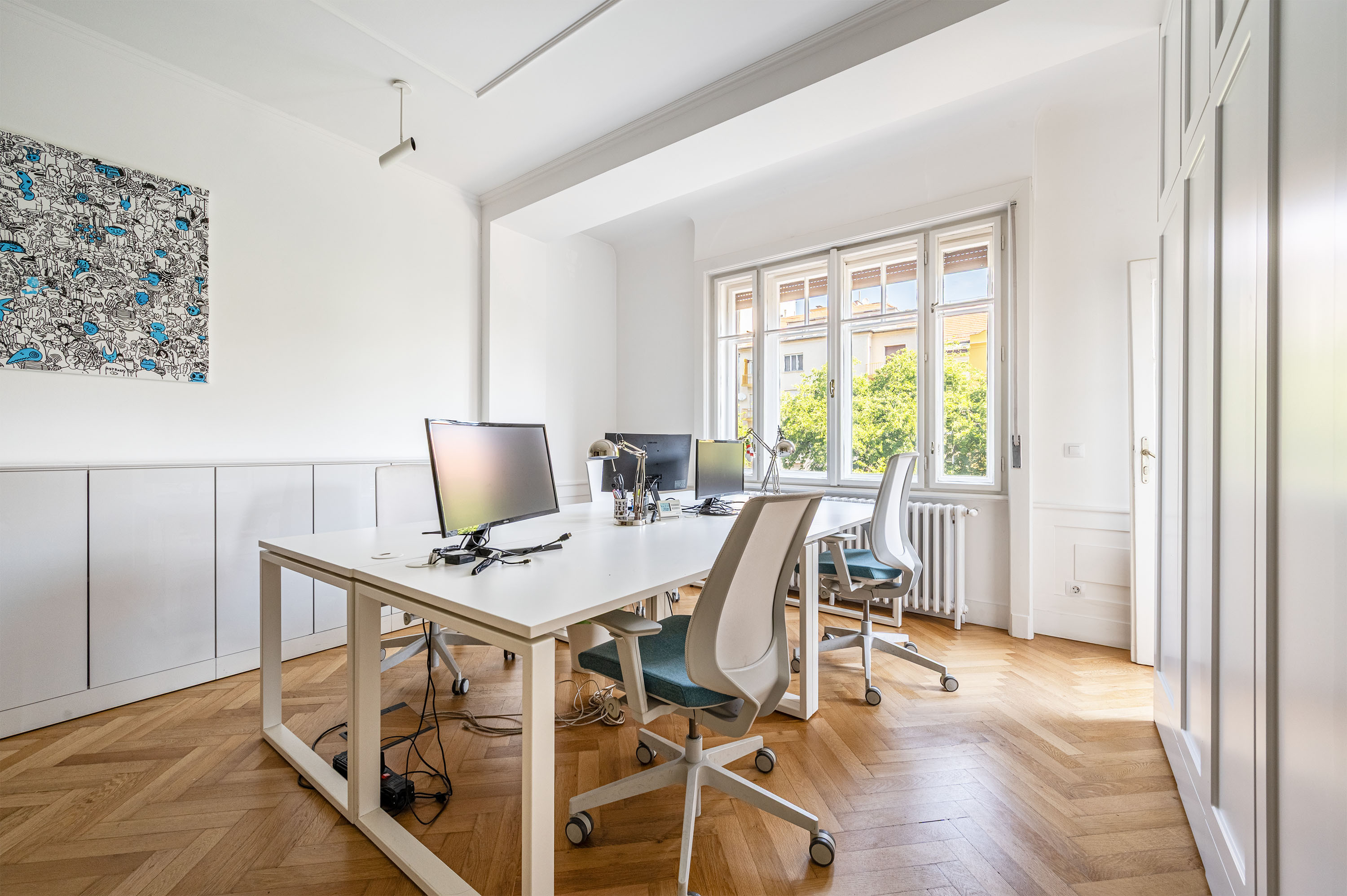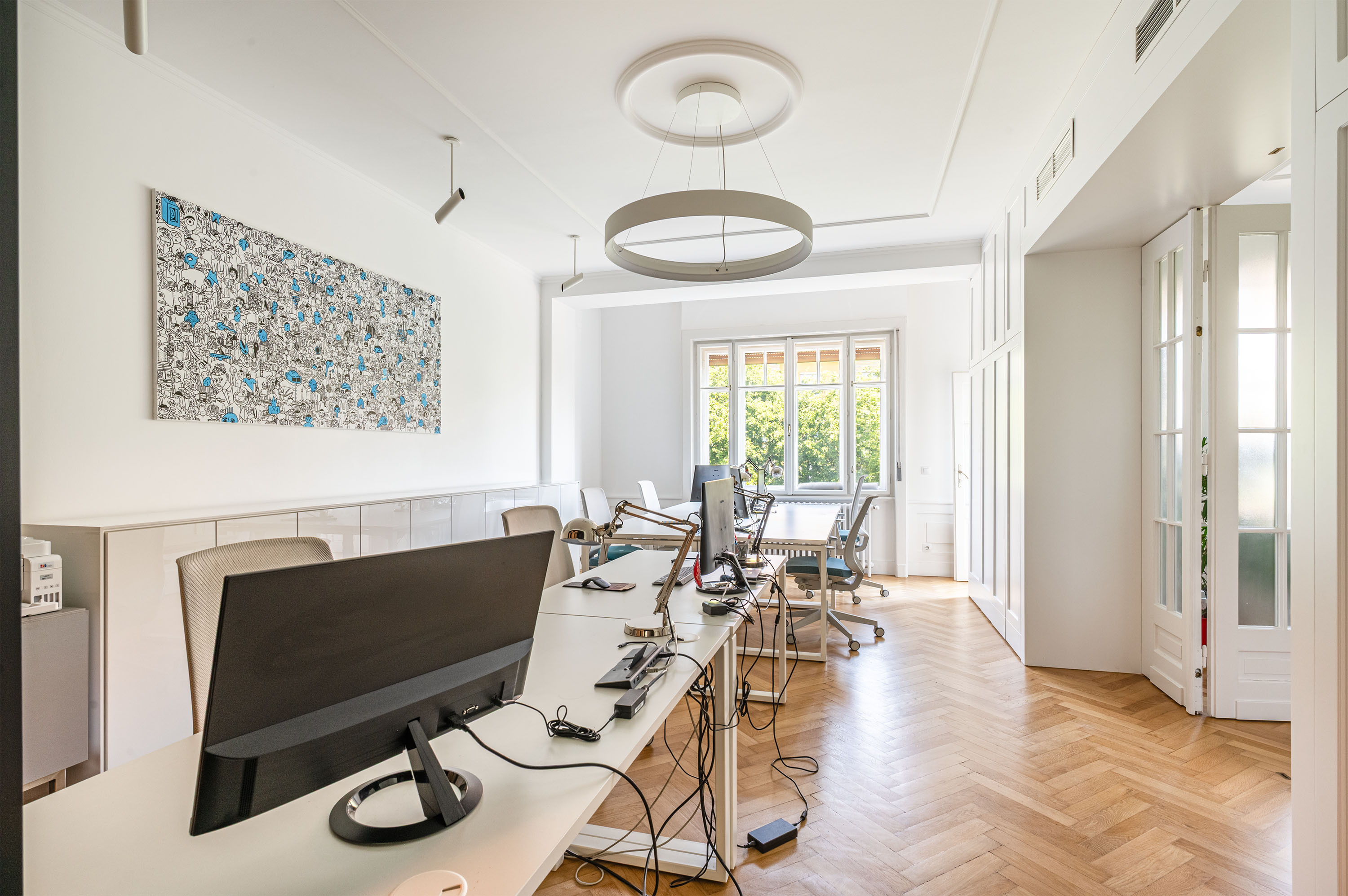 The property is currently used as an office, but it was designed so that a spacious second bedroom can be easily created without demolition or disruption. The apartment has two bathrooms, one with a shower and the other with a bathtub. All sanitary ware is by Villeroy & Boch and Bugnatese.