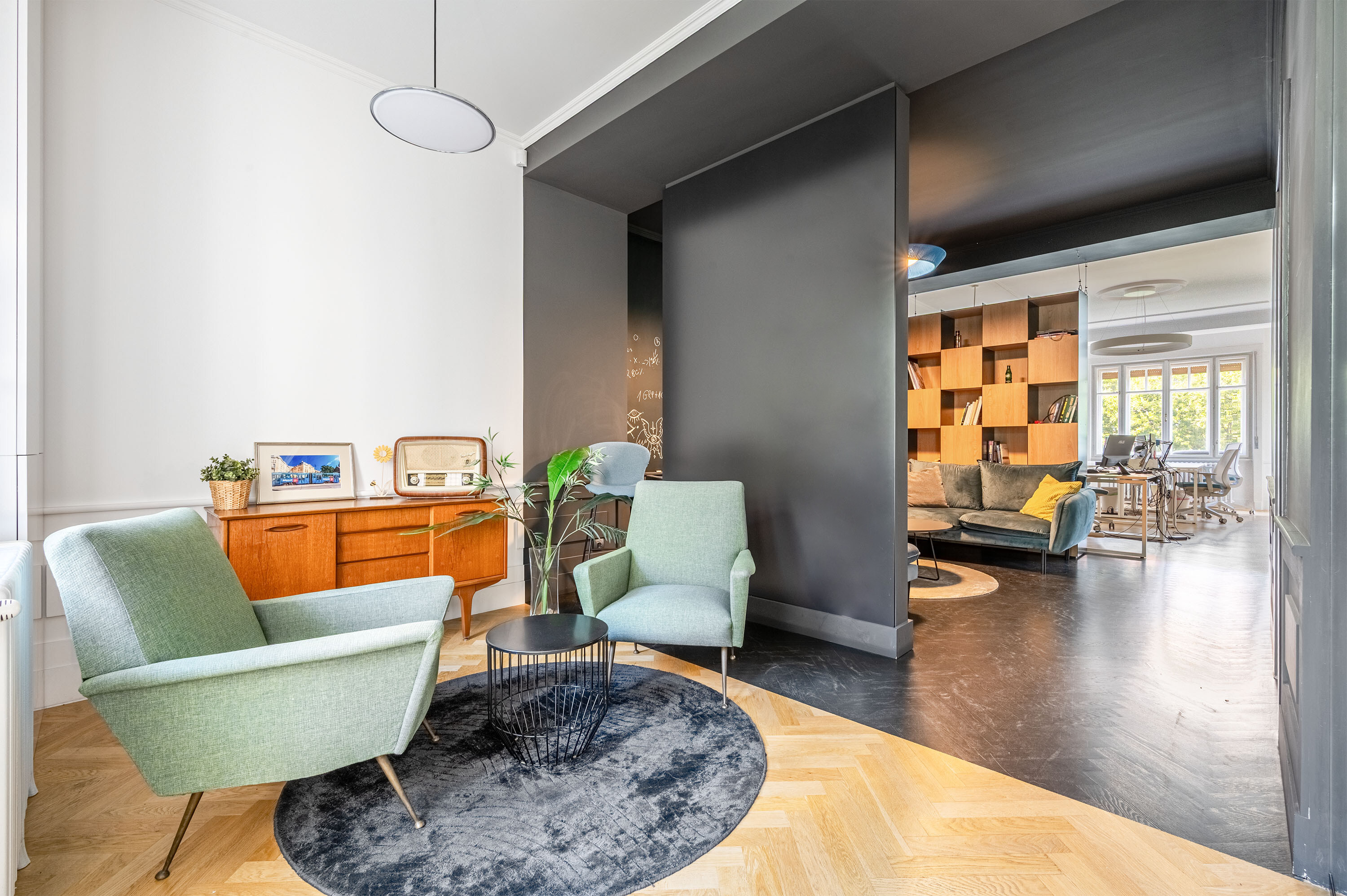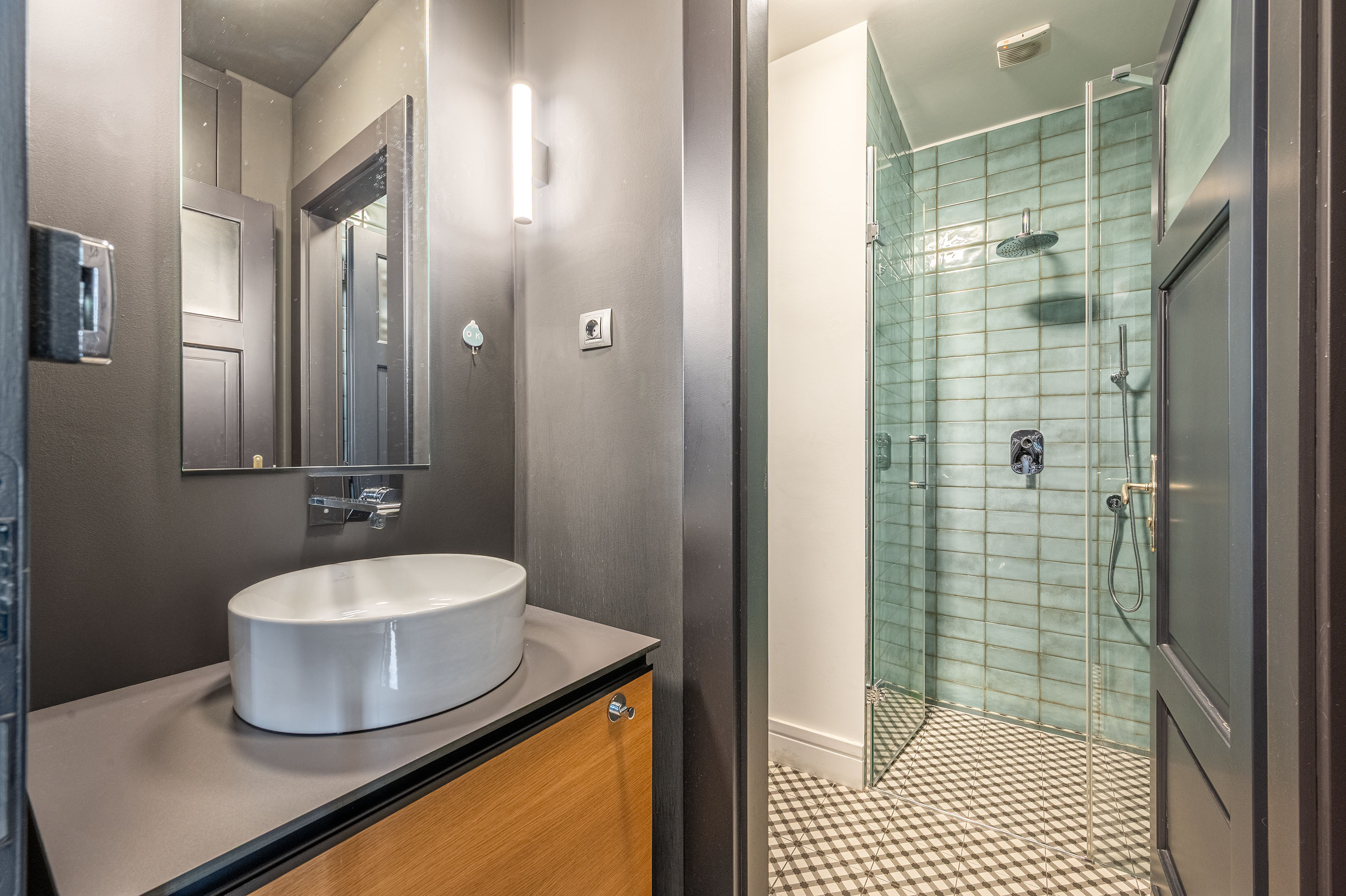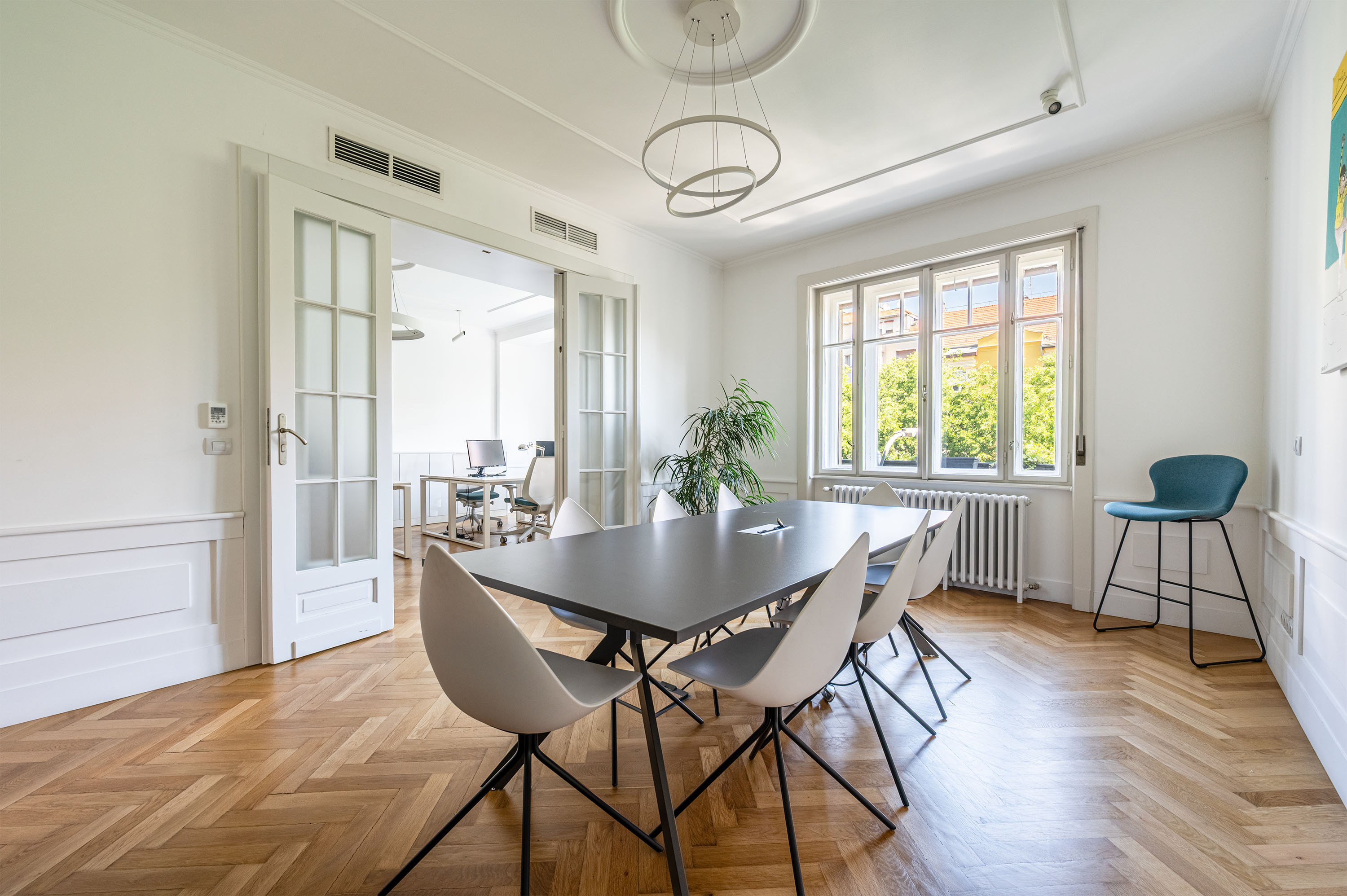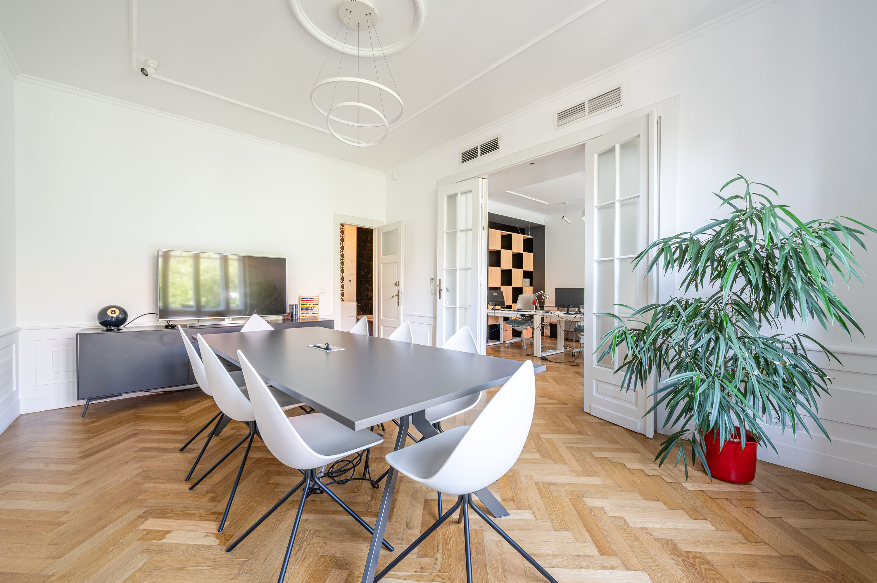 The property is currently used as an office, but it was designed so that a spacious second bedroom can be easily created without demolition or disruption. The apartment has two bathrooms, one with a shower and the other with a bathtub. All sanitary ware is by Villeroy & Boch and Bugnatese.