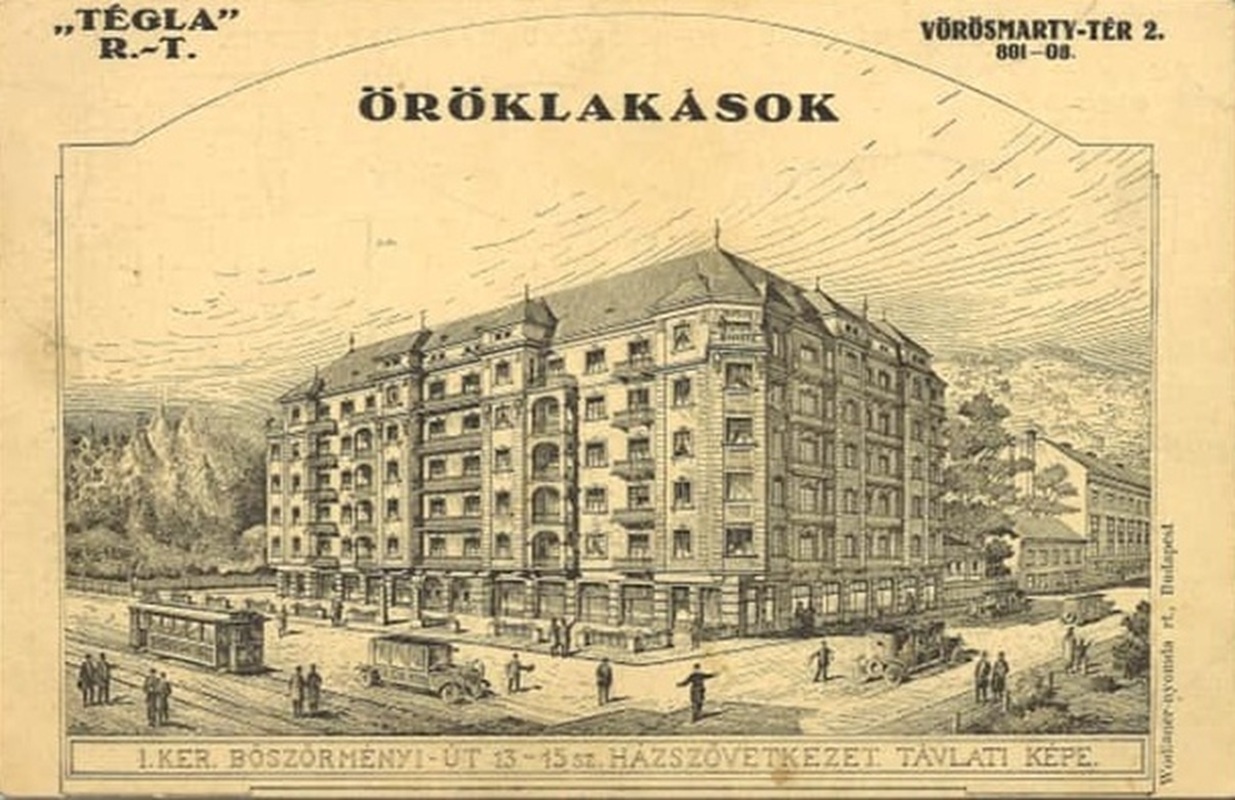 „A Böszörményi út egyik ikonikus épülete a két toronyszerű, csúcsos tetődísszel rendelkező, 13–15. szám alatti, ötemeletes, historizáló palota. Ezt a Házszövetkezet megrendelésére a Tégla Házépítő és Telekvásárló Rt. Műszaki Osztálya építtette 1931–1932-ben. A kivitelező Beta Géza építőmester volt, az építtető pedig a Tégla Házépítő és Telekvásárló Rt. igazgatója, Balogh Jenő Zoltán, aki aztán az öngyilkosságba menekült, miután építkezés közben fogyott elfogyott a vagyona. Az épület befejezetlenül maradt, amit végülbefejezését az egyik későbbi lakó Schmidt Lajos finanszírozott vagyonából. Az épület bokrétaünnepét 1931. szeptember 19-én rendezték. A földszint utcafrontján számos üzlethelyiség jött létre, volt itt az idők folyamán cipészet, órás, tejüzlet, húsbolt, kalapkészítő;, egyenruha-, sapka- és ruházatifelszerelés-bolt, vasüzlet, papírbolt, drogéria, takarékpénztár, rendelőintézet, bank, könyvtár, festékek és háztartási cikkek üzlete, és még sorolhatnánk. Budapest ostroma idején a ház pincéje óvóhelyként üzemeltszolgált, és bár folytak itt harcok, az épület nem szenvedett komolyabb károsodásokat. Nem tudni, hogy ekkor sérültek-e meg a toronysisakok, de az biztos, hogy valamikor megváltoztak. Az épület tetőszerkezete 2000-ben felújításon esett át, a kivitelező kicserélte a régi palafedést. Mindenesetre – sok más budapesti épülettel ellentétben – a Böszörményi út 13–15. alatti házon jelenleg is megtekinthető a közel százéves torony dísz.” (Forrás: hegyvidek pont hu és Fortepan)
