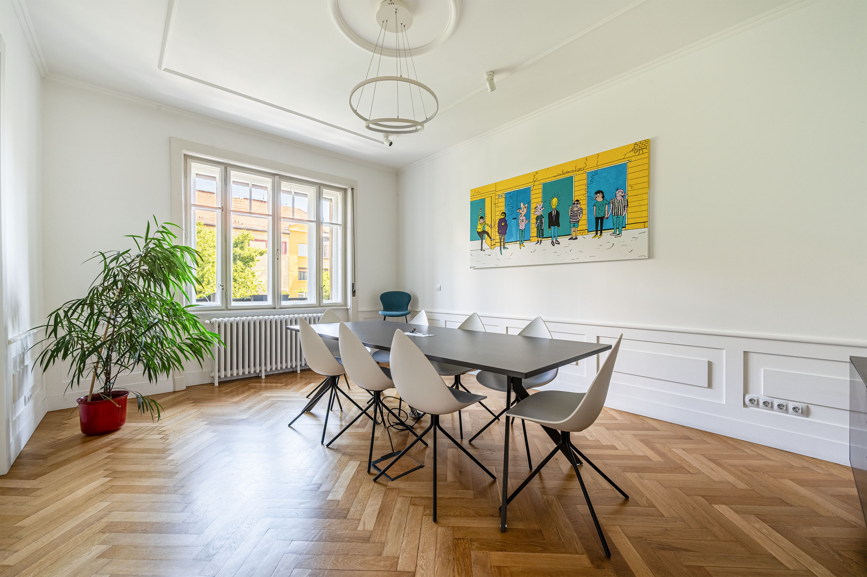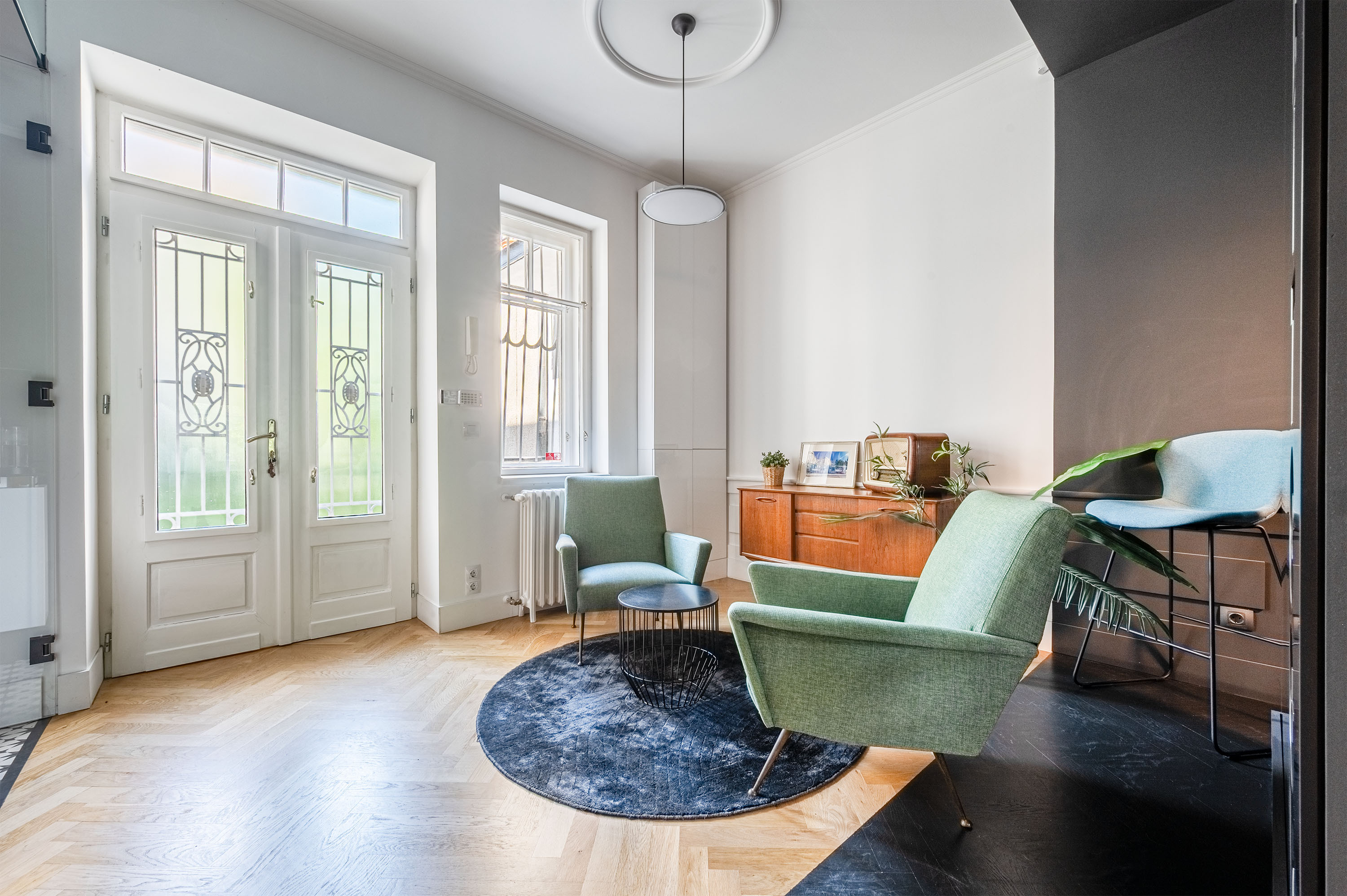 A truly outstanding and costly part of the renovation was that the entire parquet flooring, joists, and screed were removed, the entire apartment was releveled, and the original wooden parquet flooring was reinstalled, thus preserving its traditional value. This is almost unparalleled, as renovations usually cut corners in this area.
