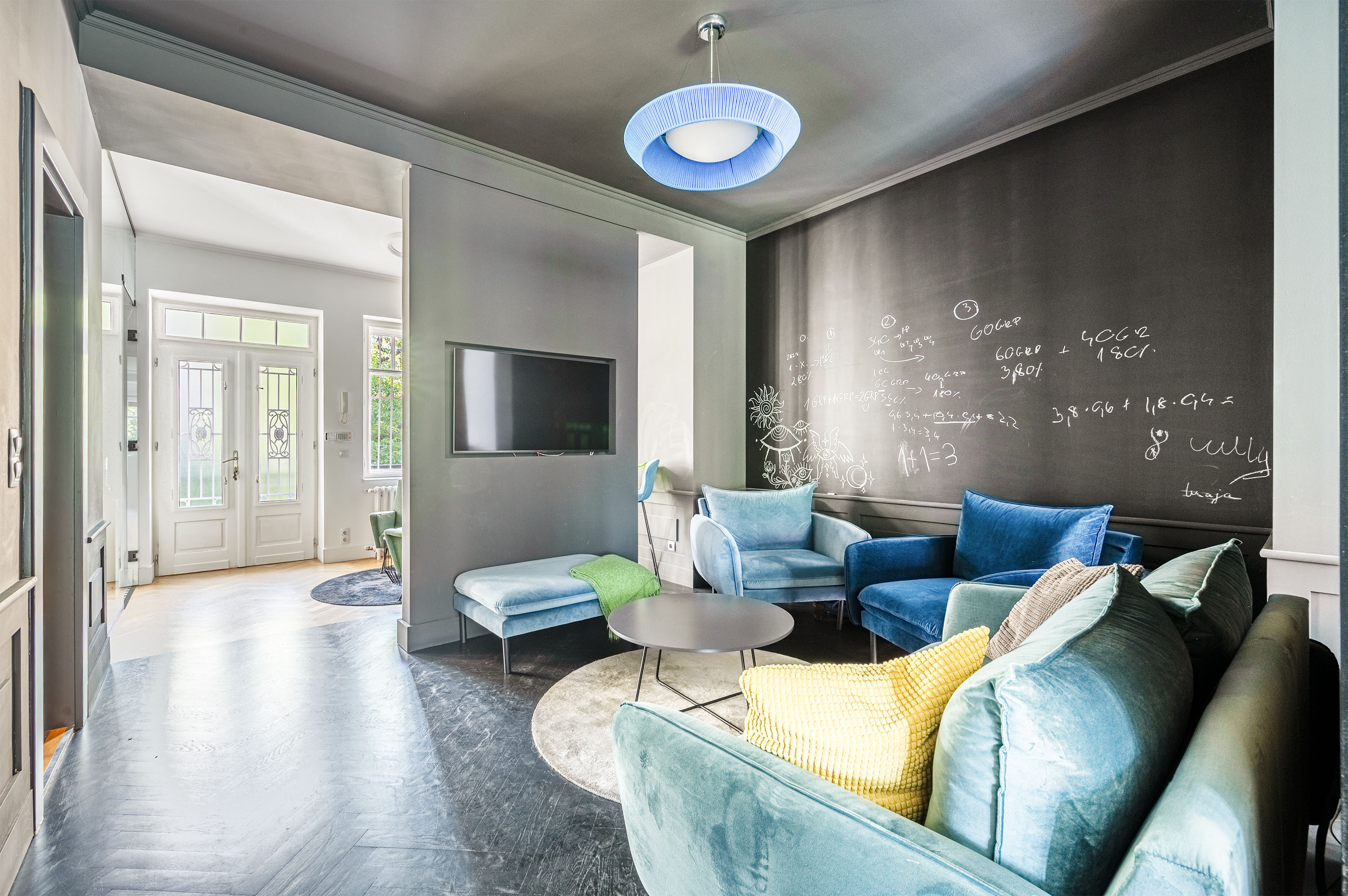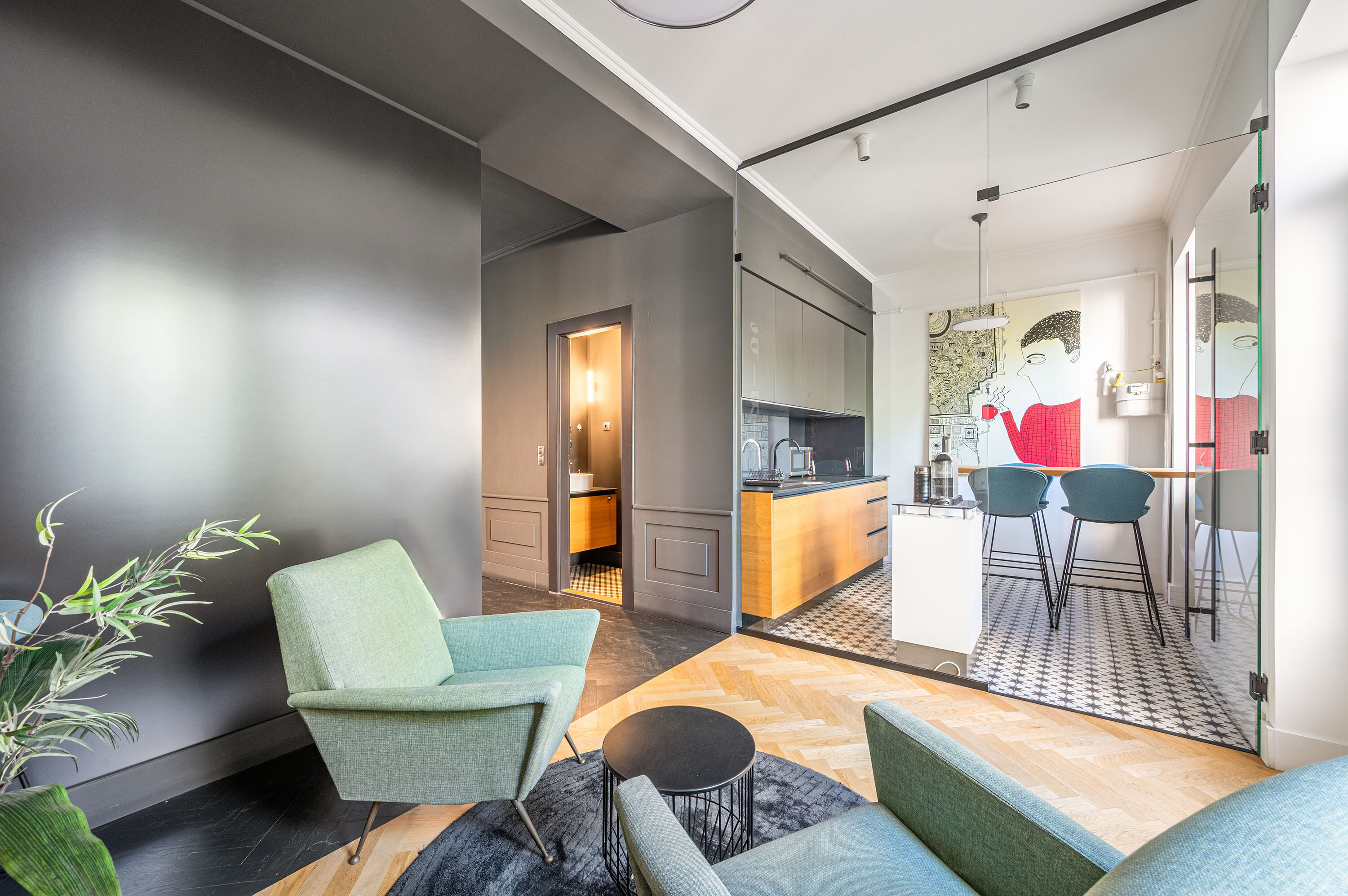 The property features many playful and creative solutions. The side walls are soundproofed, with cassette wall panels in some places, lots of built-in furniture and details. The apartment's air conditioning units have also been concealed, thus preserving the overall aesthetic effect.