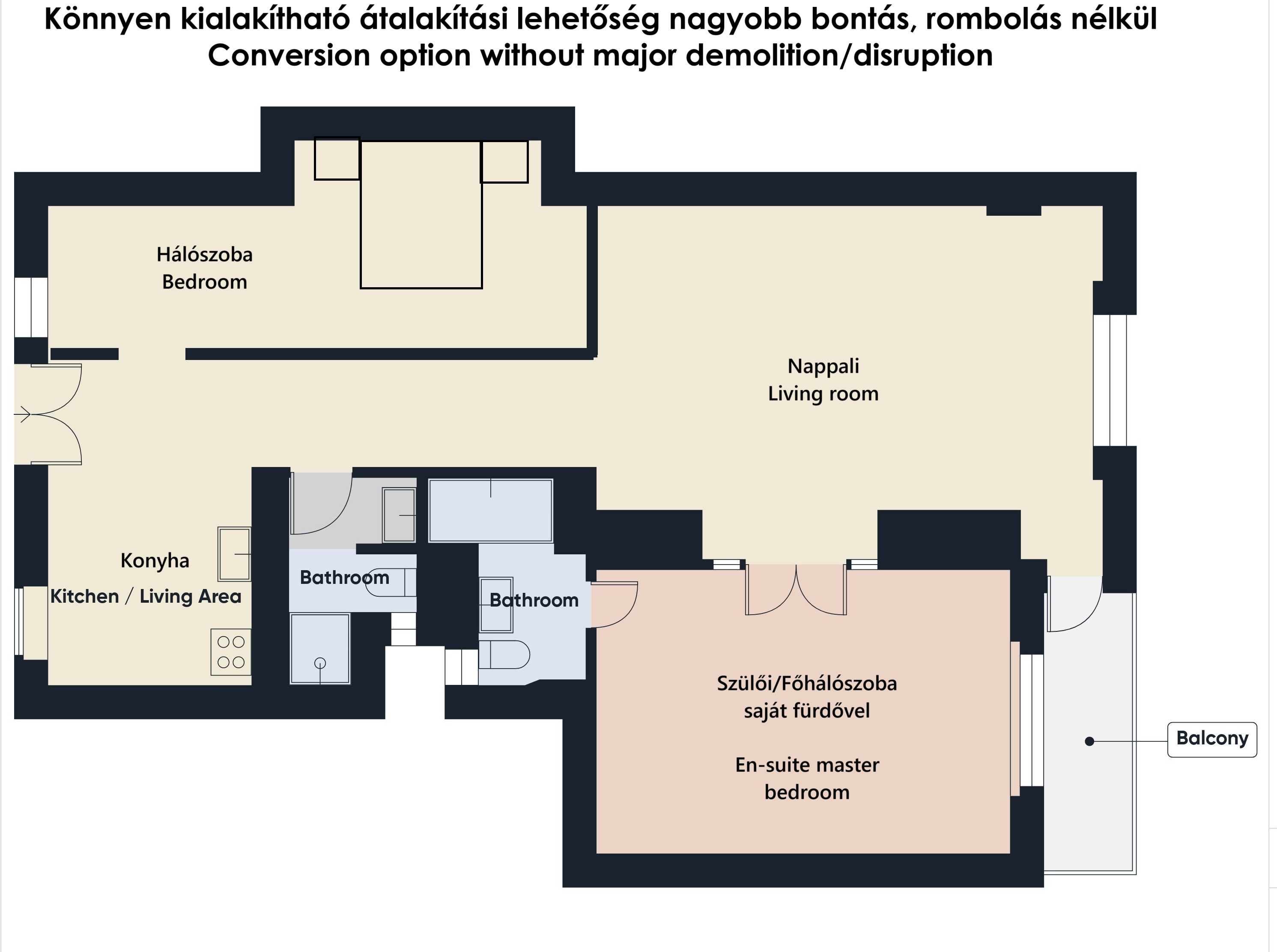Az ingatlan jelenleg irodaként van használva, azonban úgy tervezték, hogy rombolás és felfordulás nélkül, könnyedén kialakítható egy tágas 2. hálószoba is. A lakásban 2 fürdőszoba is megtalálható, egyik zuhanyzós, másik kádas. Az összes szaniter Villeroy & Boch és Bugnatese.