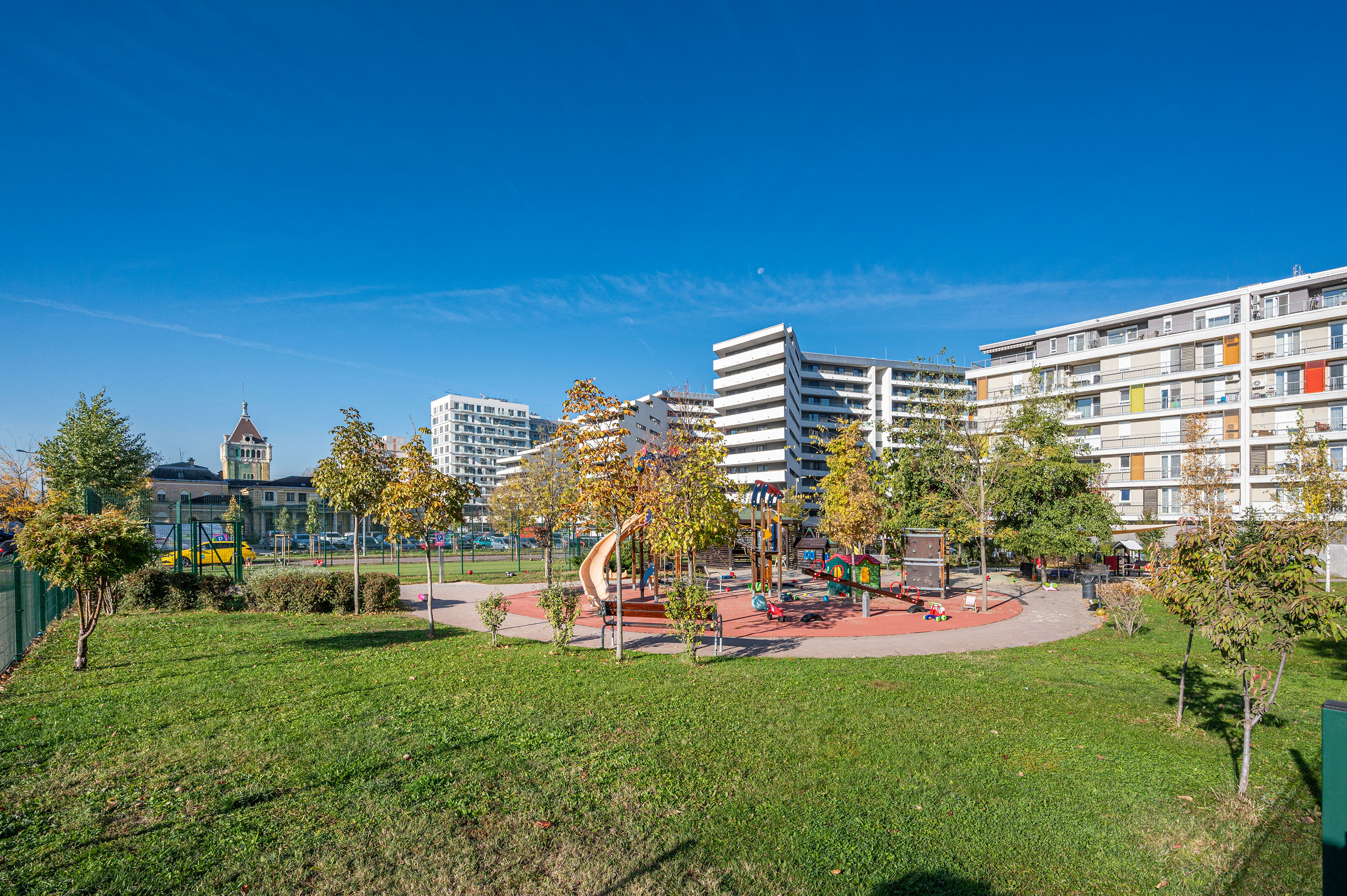 Csak az itt lakók használhatják a kerítéssel körbevett játszóteret és parkot.