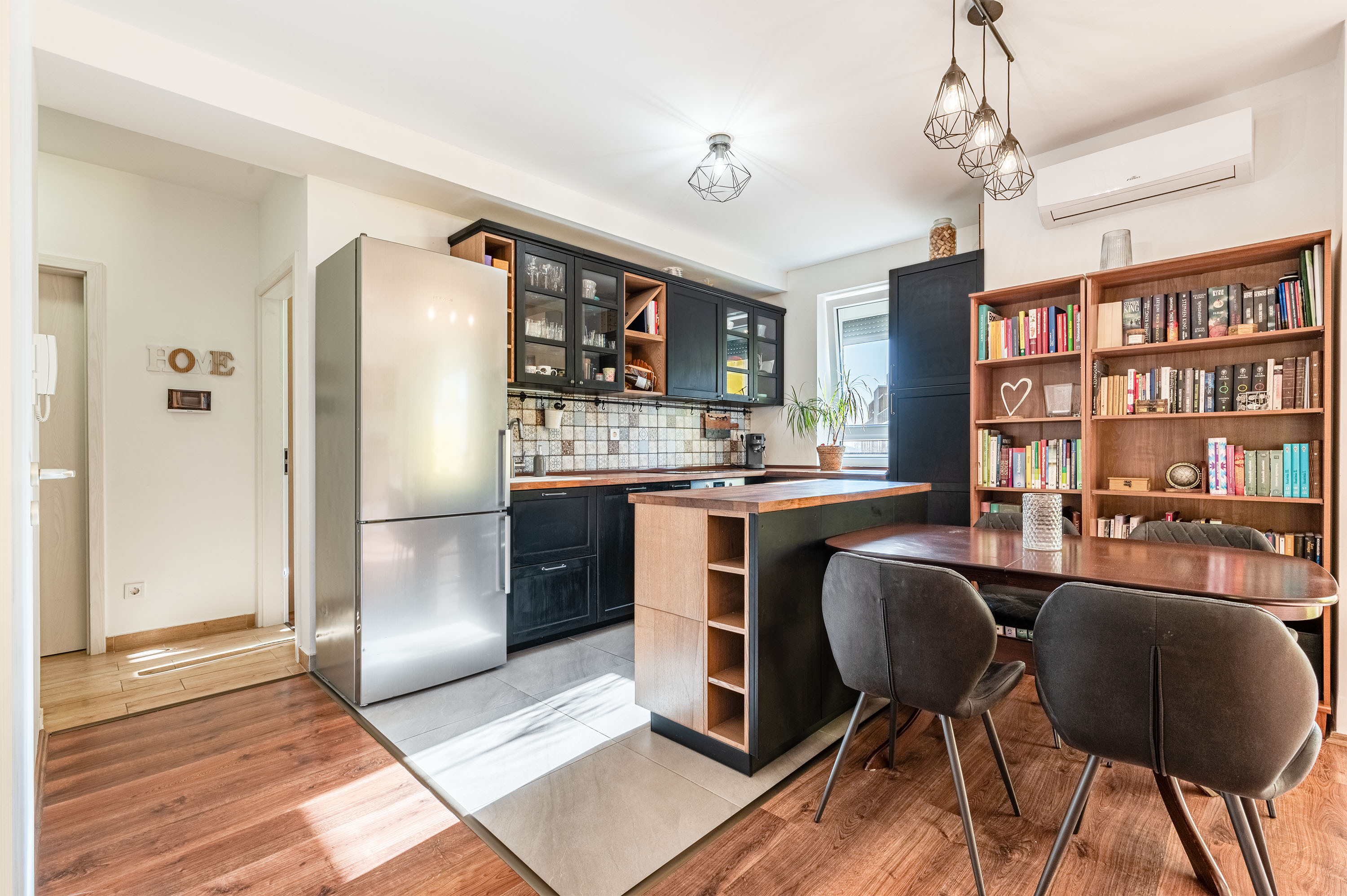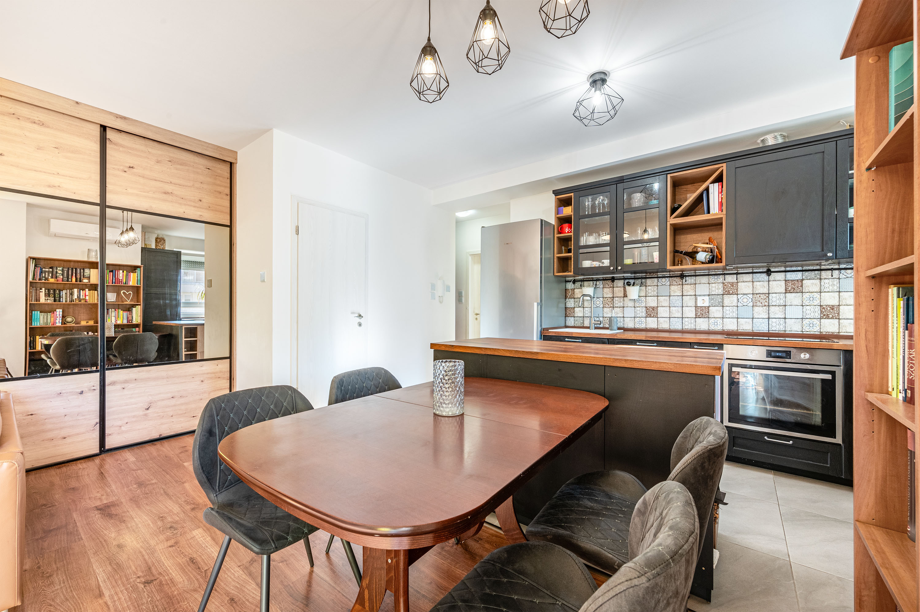 - 35nm nappali-konyha egyben, fa frontú IKEA konyhaszekrény diófa munkalappal, fiókos tárolókkal, magas minőségű gépekkel, konyhaszigettel