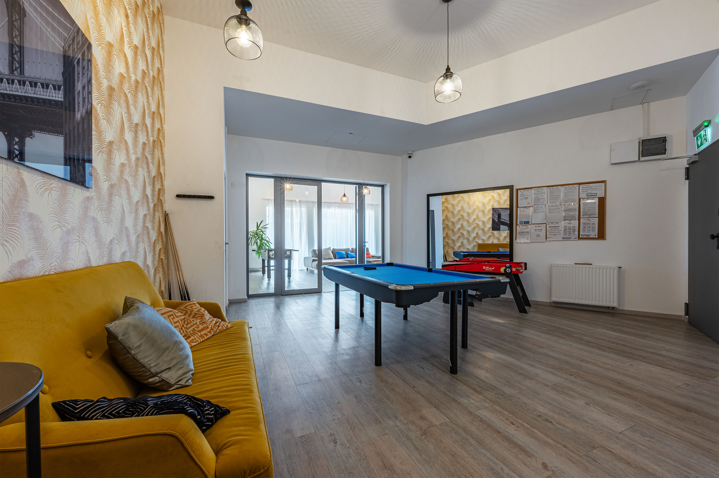 A közösségi térnek köszönhetően, ha kikapcsolódásra és sportra vágyunk, akkor csak a liftig kell elmennünk, ugyanis a földszinten edzőterem és klubhelyiség billiárdasztallal vár Minket.