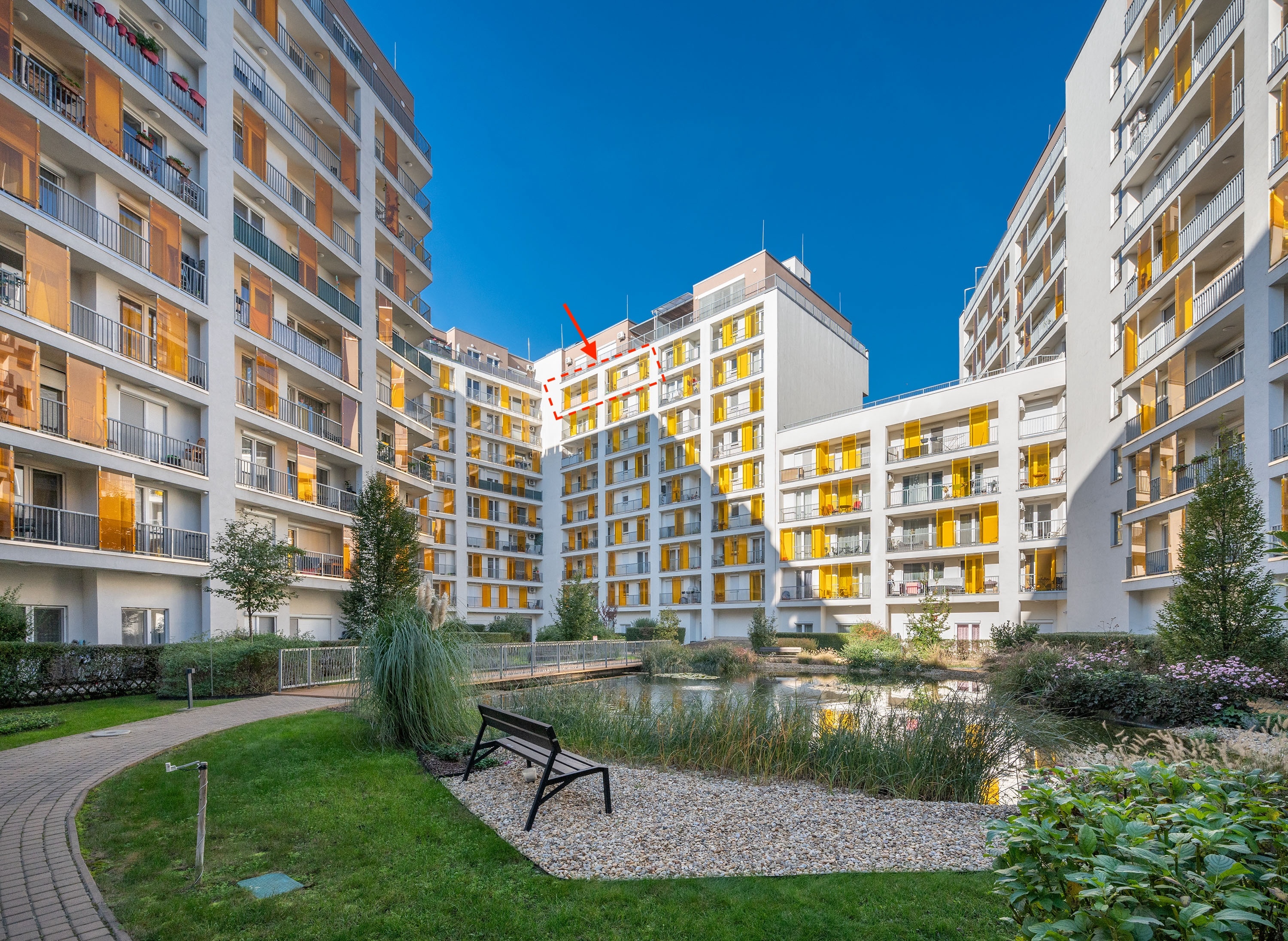 Elrendezése a legkényelmesebb, magasságnak és nagy üvegfelületeknek köszönhetően szemet gyönyörködtető napfényáradatban lehet részünk, amely télen melegen tartja a lakást. Másik fénypontja a lakásnak a rendezett park és kerti tó, amelyre a teraszról rálátni.