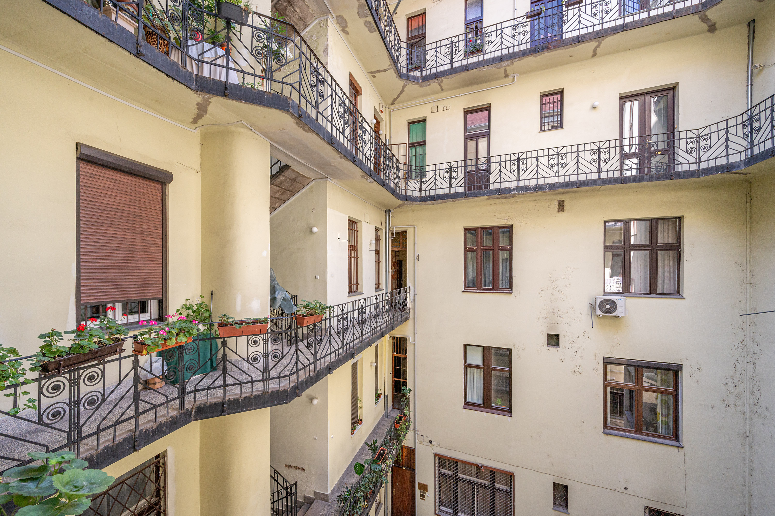 A társasház homlokzata kívül és belül is jó állapotban van, a lépcsőház rendezett és tiszta. A társasház lakóközössége csendes, az anyagi helyzete kiegyensúlyozott. A beton aljzatú pince rendezett, pincehelység kialakítására terület igényelhető. Az Airbnb a házban megengedett, valamint szabályozott, azonban az V. kerület szabályozása értelmében telitett a ház.