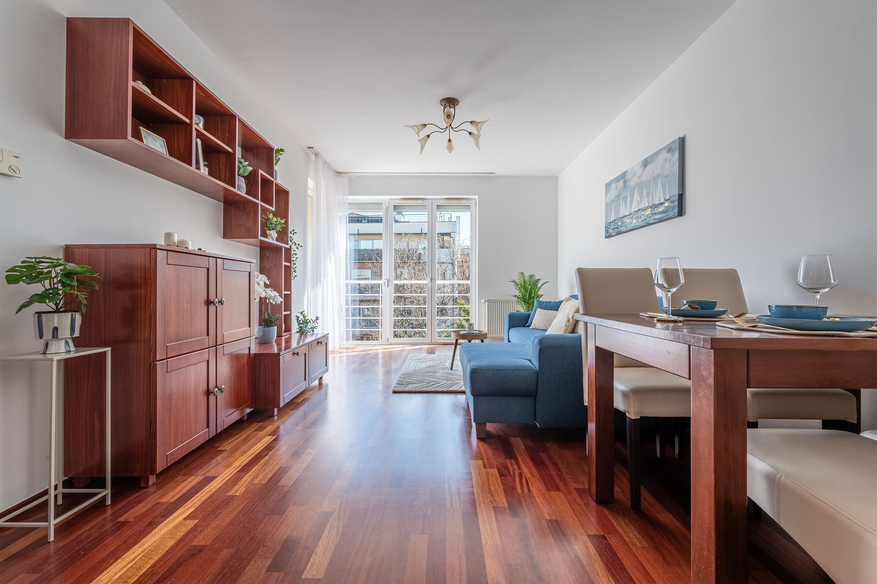 The apartment consists of a normal sized entrance hall, a large living room with fitted kitchen, 2 separate bedrooms (one larger and one smaller), 1 bathroom with bathtub, a guest toilet and 1 balcony. The apartment has individual heating by circulator.