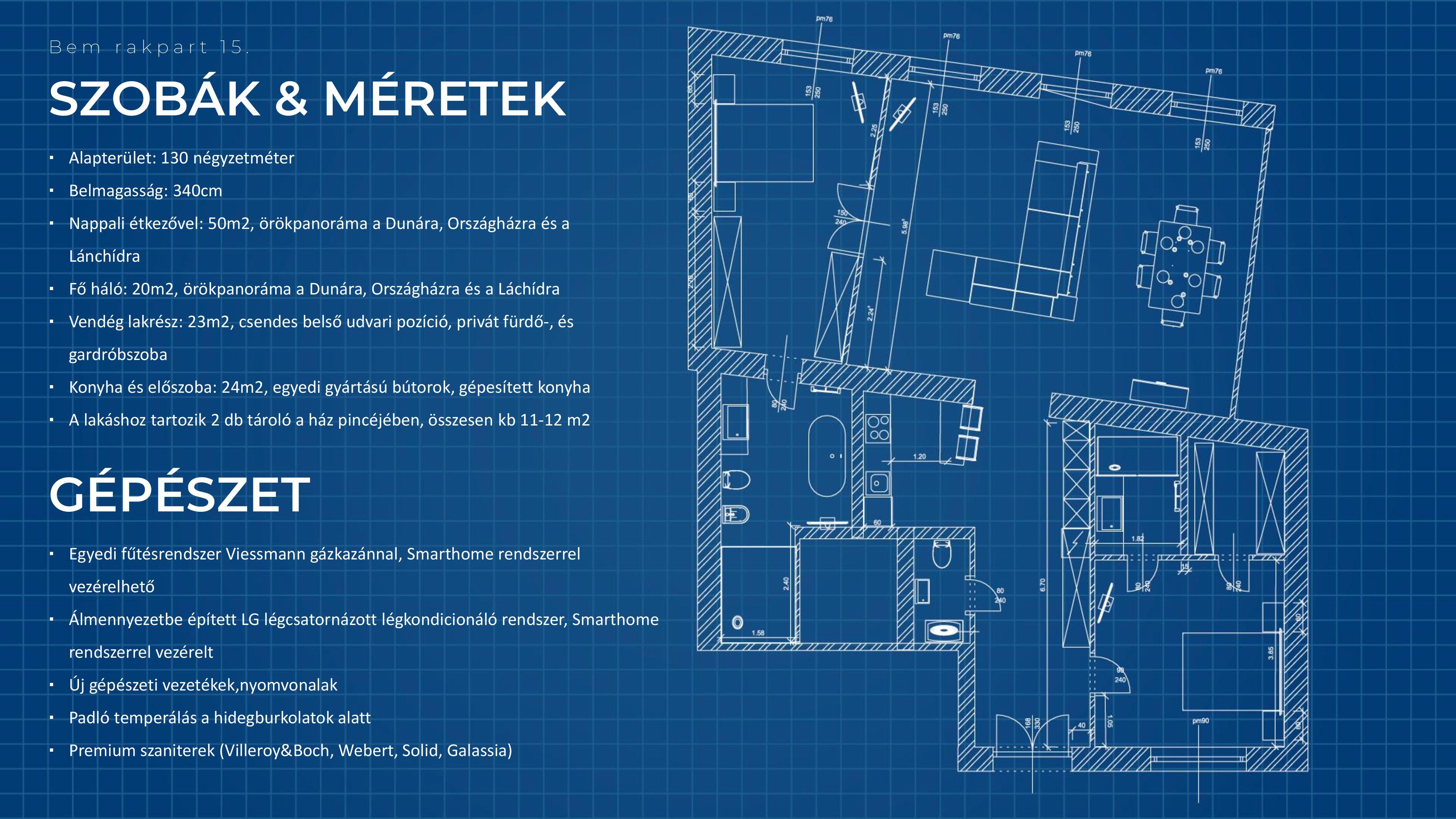 50nm étkezős nappali // 2 nagy háló // 2 fürdő // gőzkabin // gardrób //4 nagy ablaka a Dunára, Parlamentre panorámás // KNX Smarthome rendszer és Amazon Alexa hangvezérlés // prémium minőségű kivitelezés és anyaghasználat.