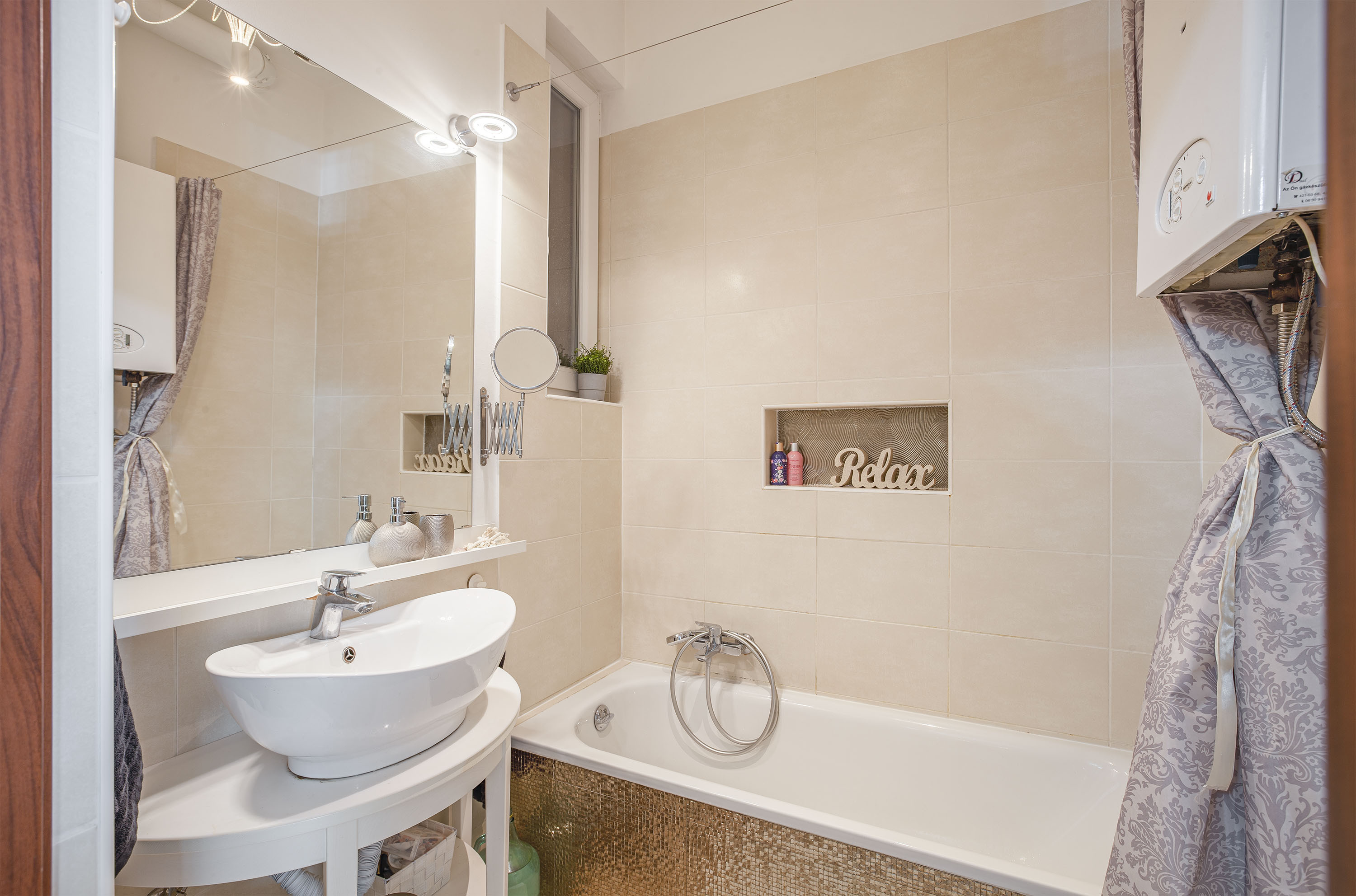Ízléses burkolatok, nagy ablakok és magas minőségű bútorok gondoskodnak a kellemes, exkluzív hangulatról. A fürdőszoba modern és tágas, a külön WC tovább növeli a komfortot.