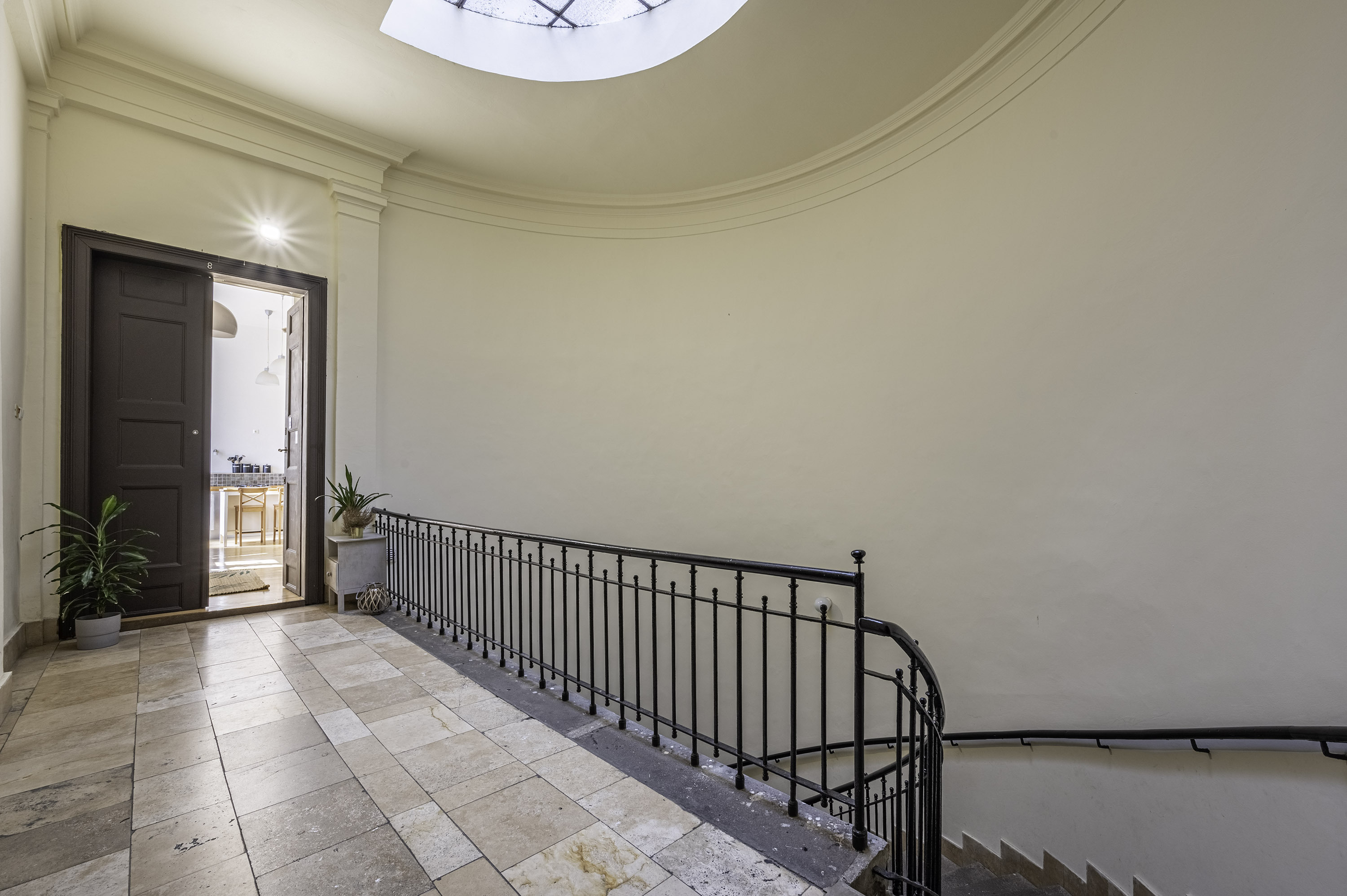 A lakás az Erkel utcai épületszárny végében található, a hátsó lépcsőházból közelíthető meg. Itt emeletenként két lakás található. A szép állapotban lévő lépcsőházat egy belső fás kerten áthaladva közelíthetjük meg. A kert hangulata ámulatba ejtő. A lakás körbenapozott.