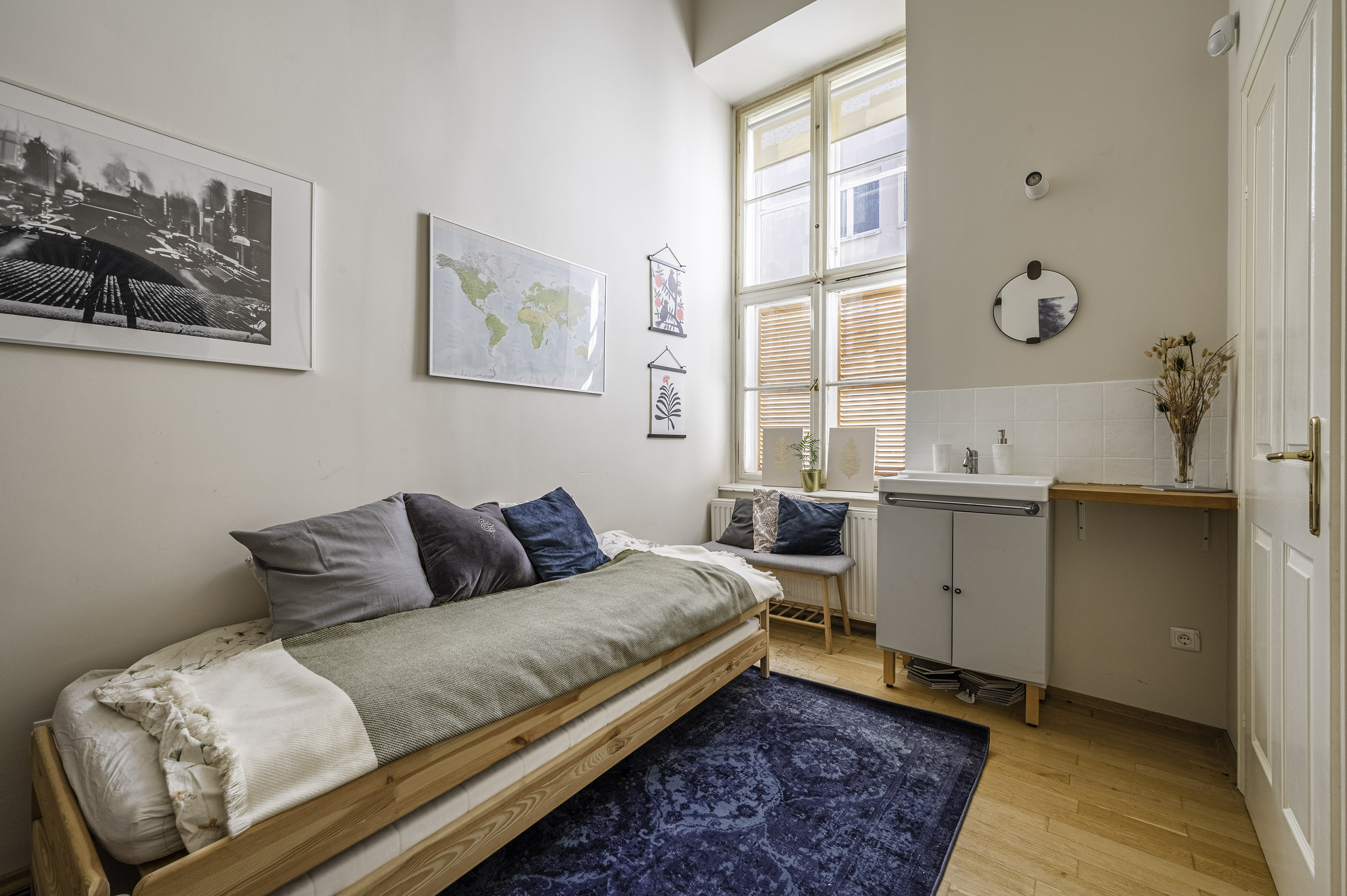 - a nappali és a tágas szülői háló ÉNy fekvésű, nagy ablakain eredeti fa spaletták