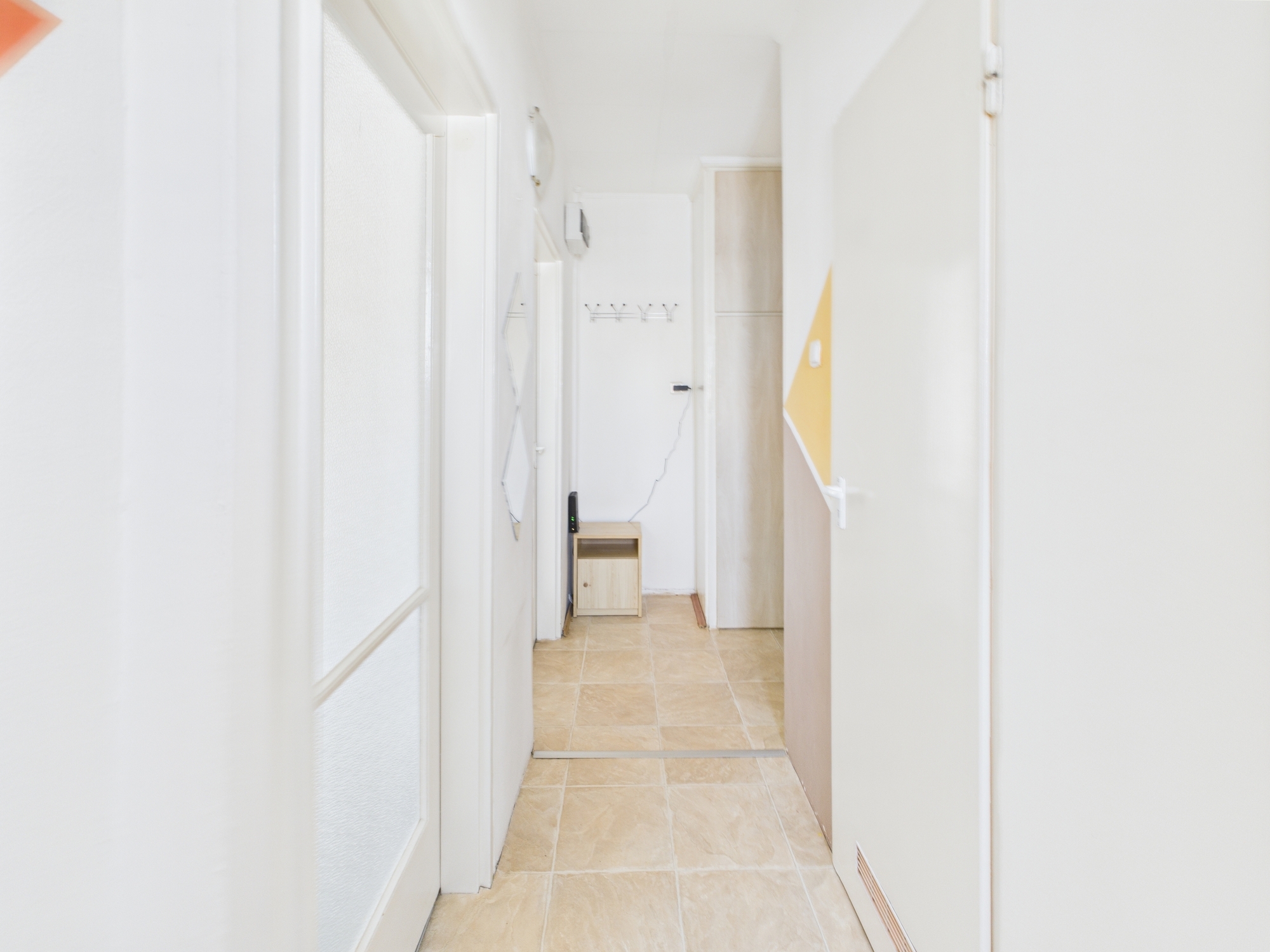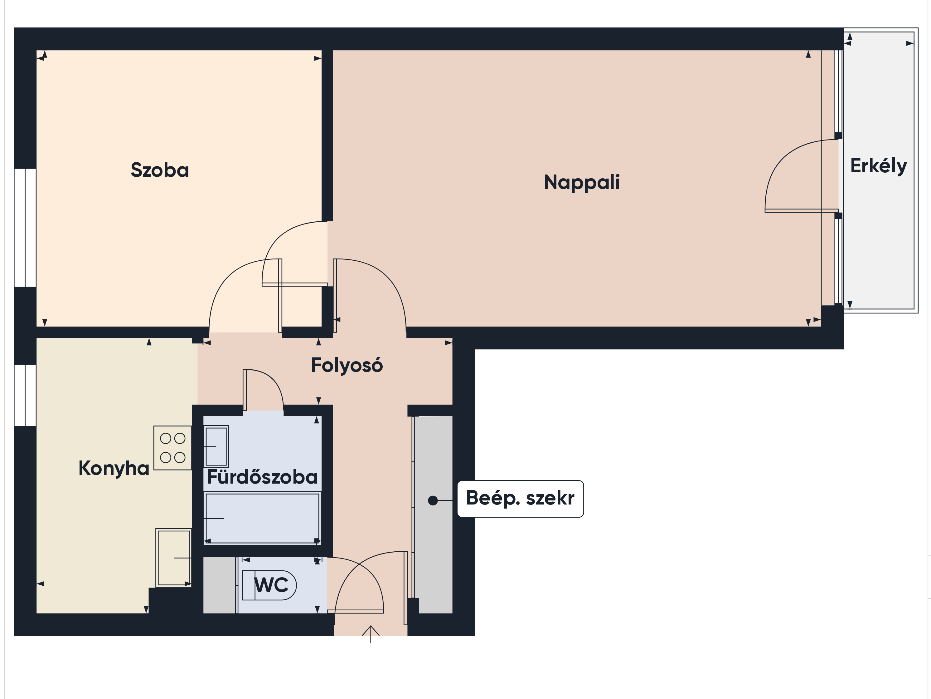 A nappali mellett egy kényelmes hálószoba, kádas fürdőszoba, különálló WC és a folyosón beépített tárolók szolgálják a lakók kényelmét. A lakás jó állapotú, minden szükséges komforttal felszerelt.