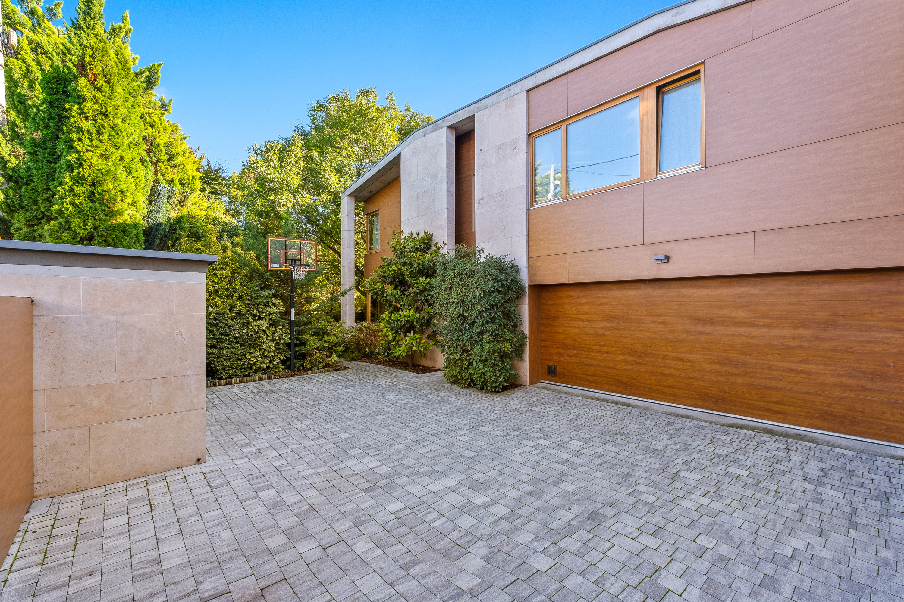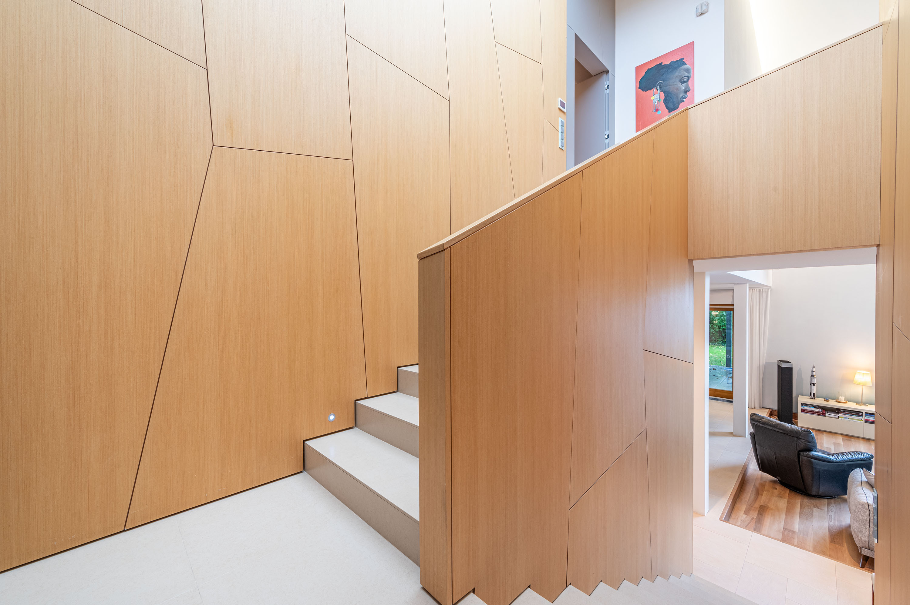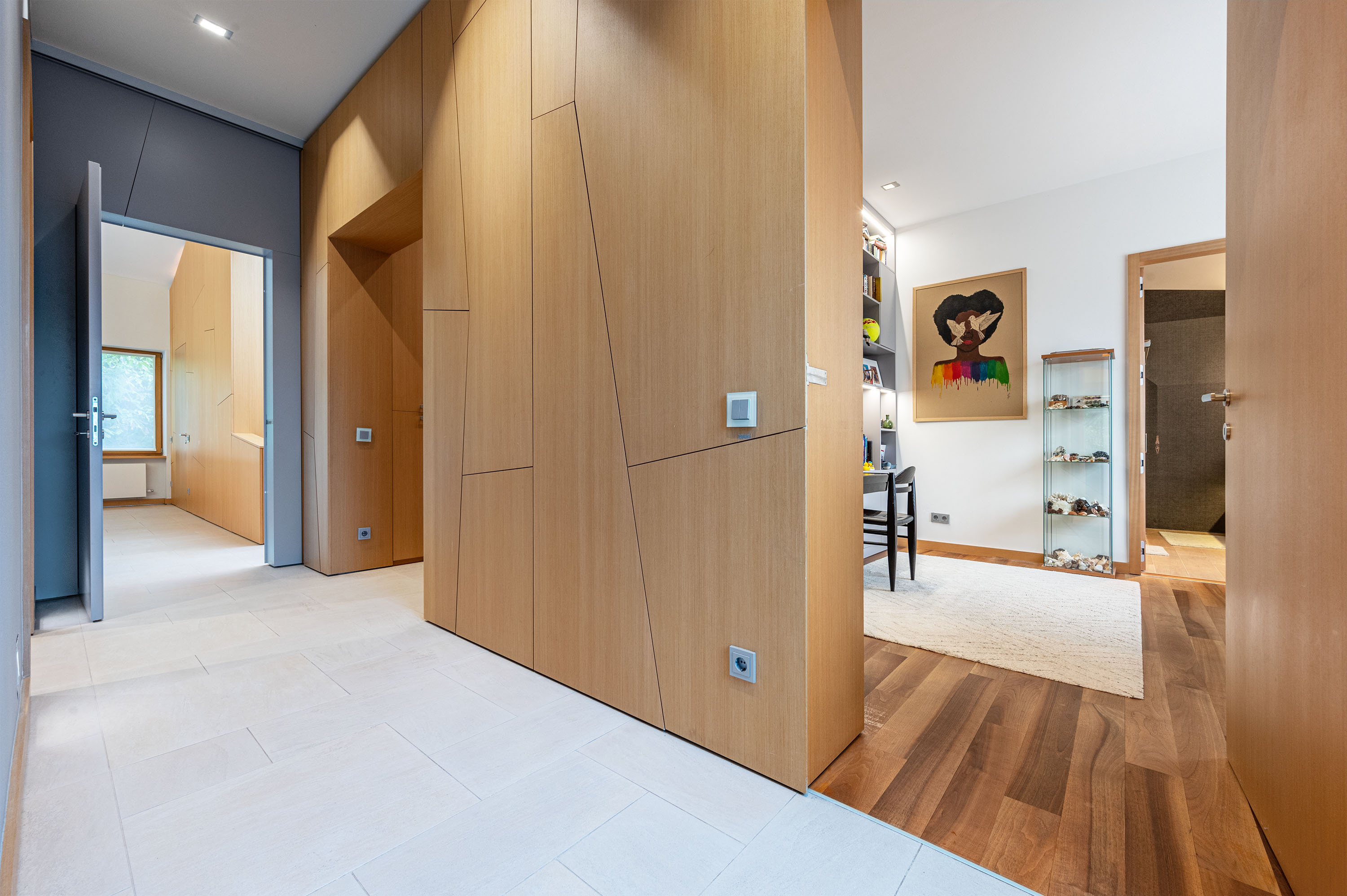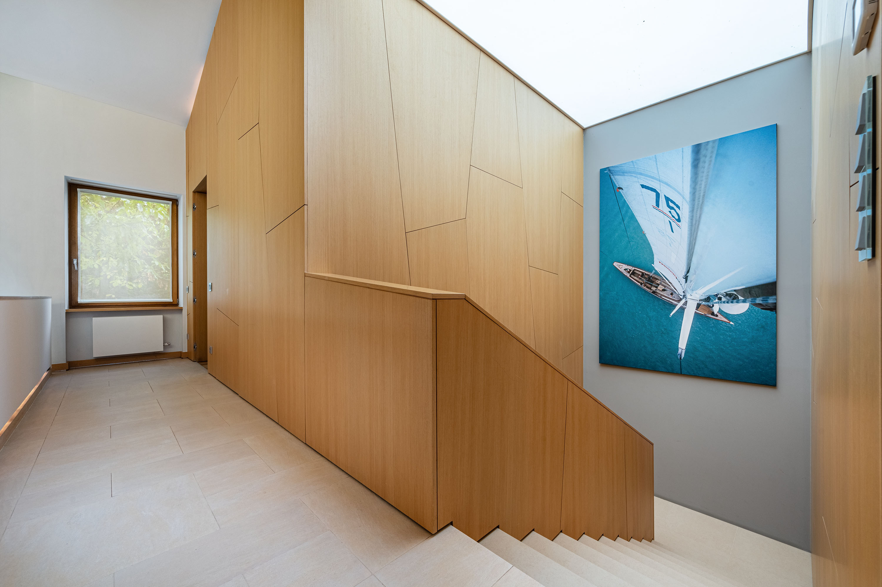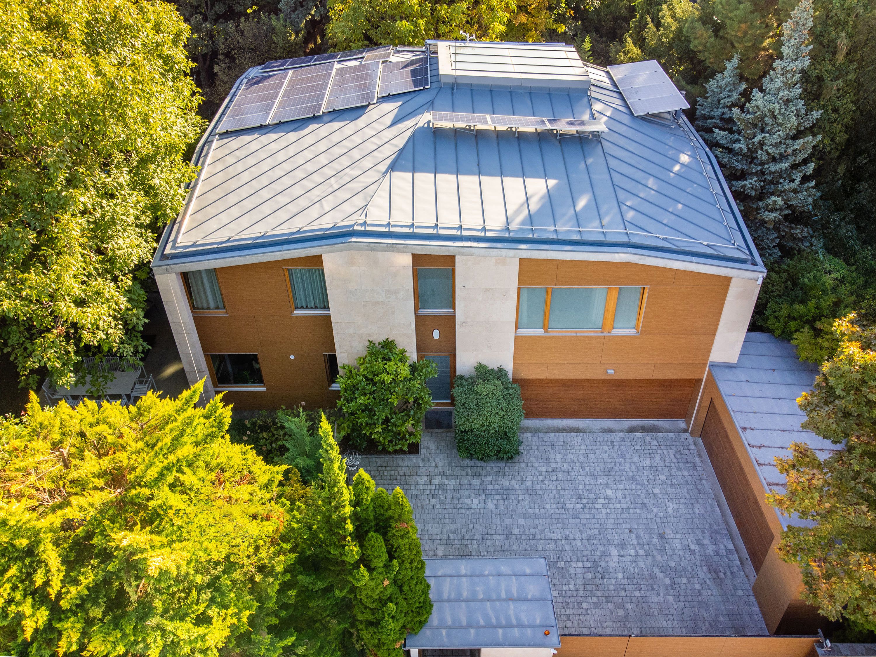 Az épület egészén végigfutó, fa falburkoló elemek geometrikus formában záródnak, ezzel izgalmas struktúrát teremtve a letisztult falakon, elegyítve a beton, travertin naturális színeivel. Az épület egészén a letisztult formák, színek, anyaghasználat koncepciózusan fut végig, ezzel megteremtve a skandináv funkcionális, minimalista esztétikát.