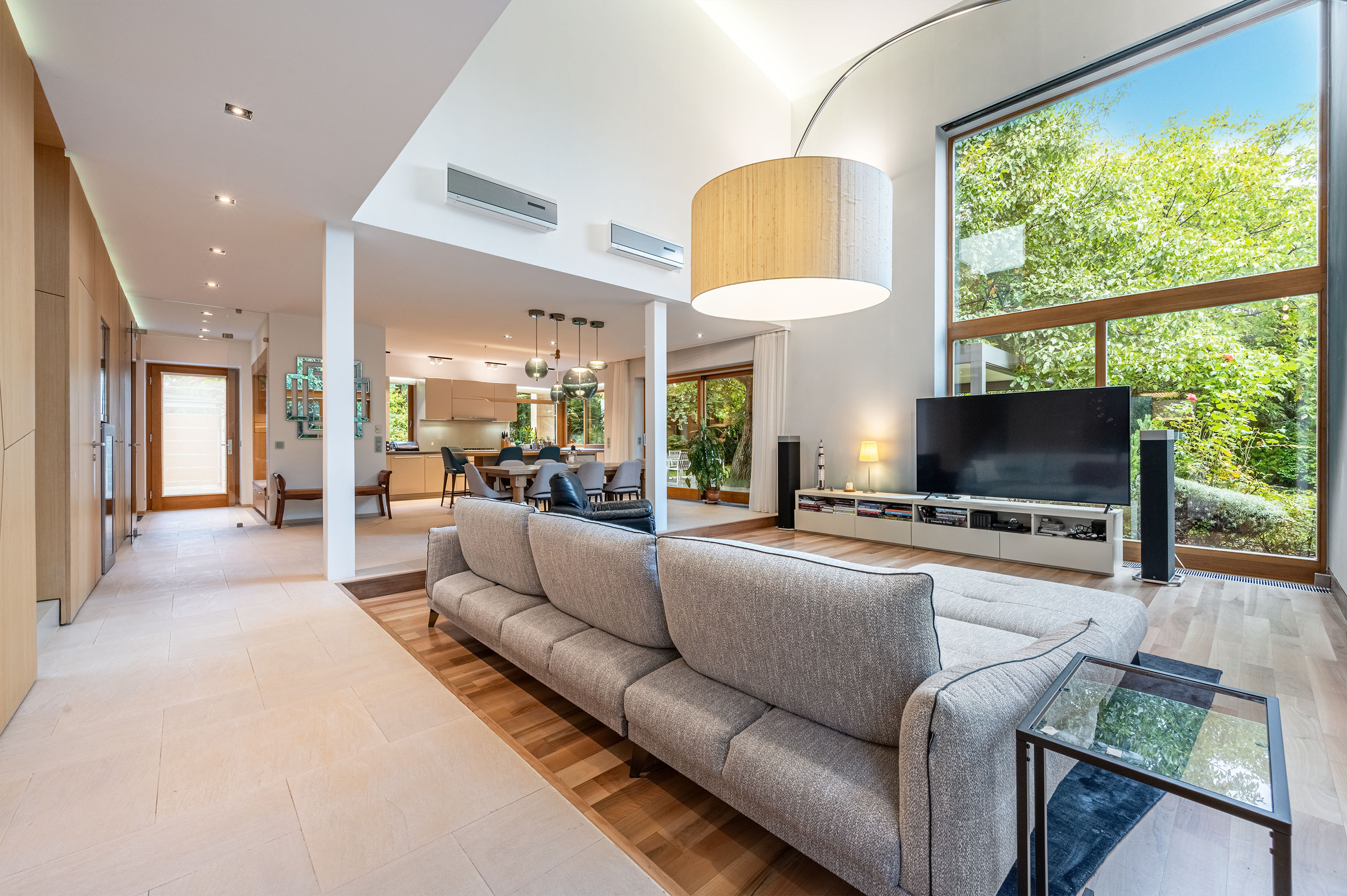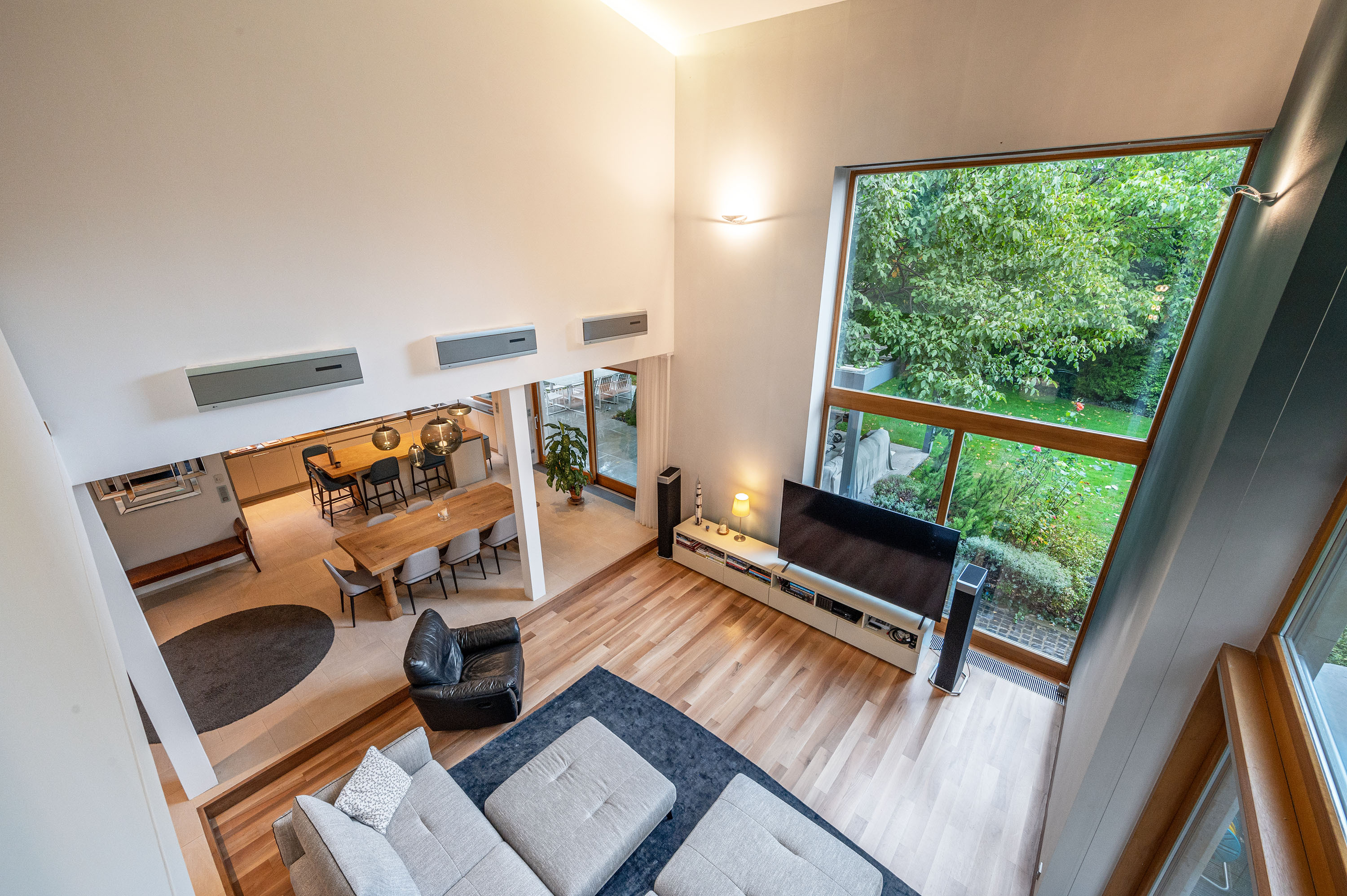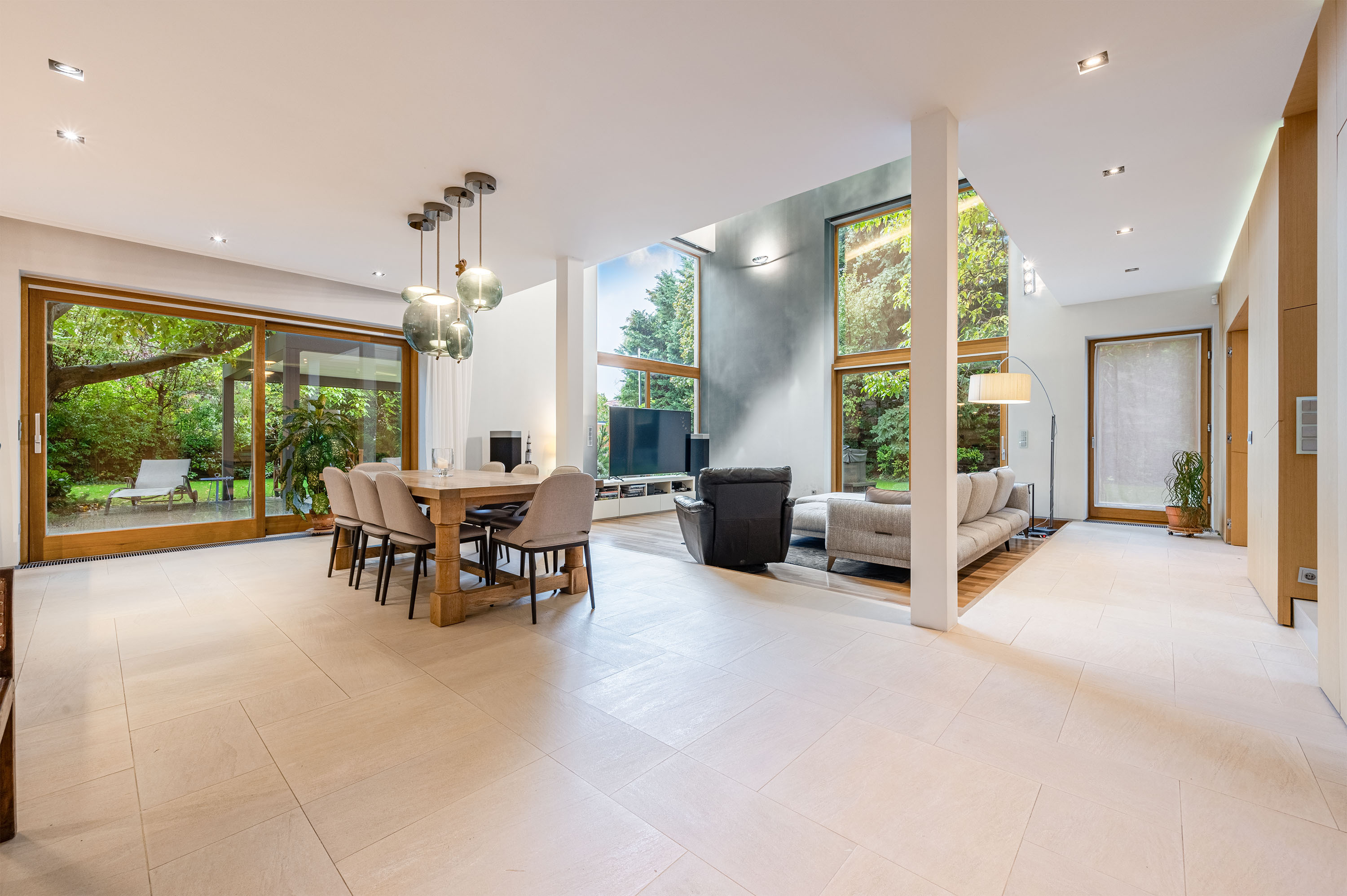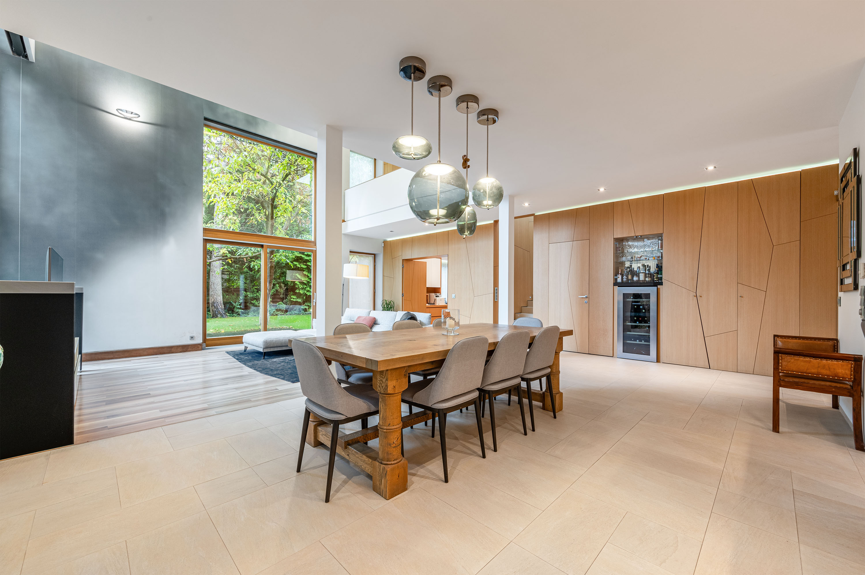The living room of the house has an imposing ceiling height of more than 7 metres, with large glass surfaces facing the garden, creating a contrast between the homogeneous colours inside and the vibrant green of the garden.