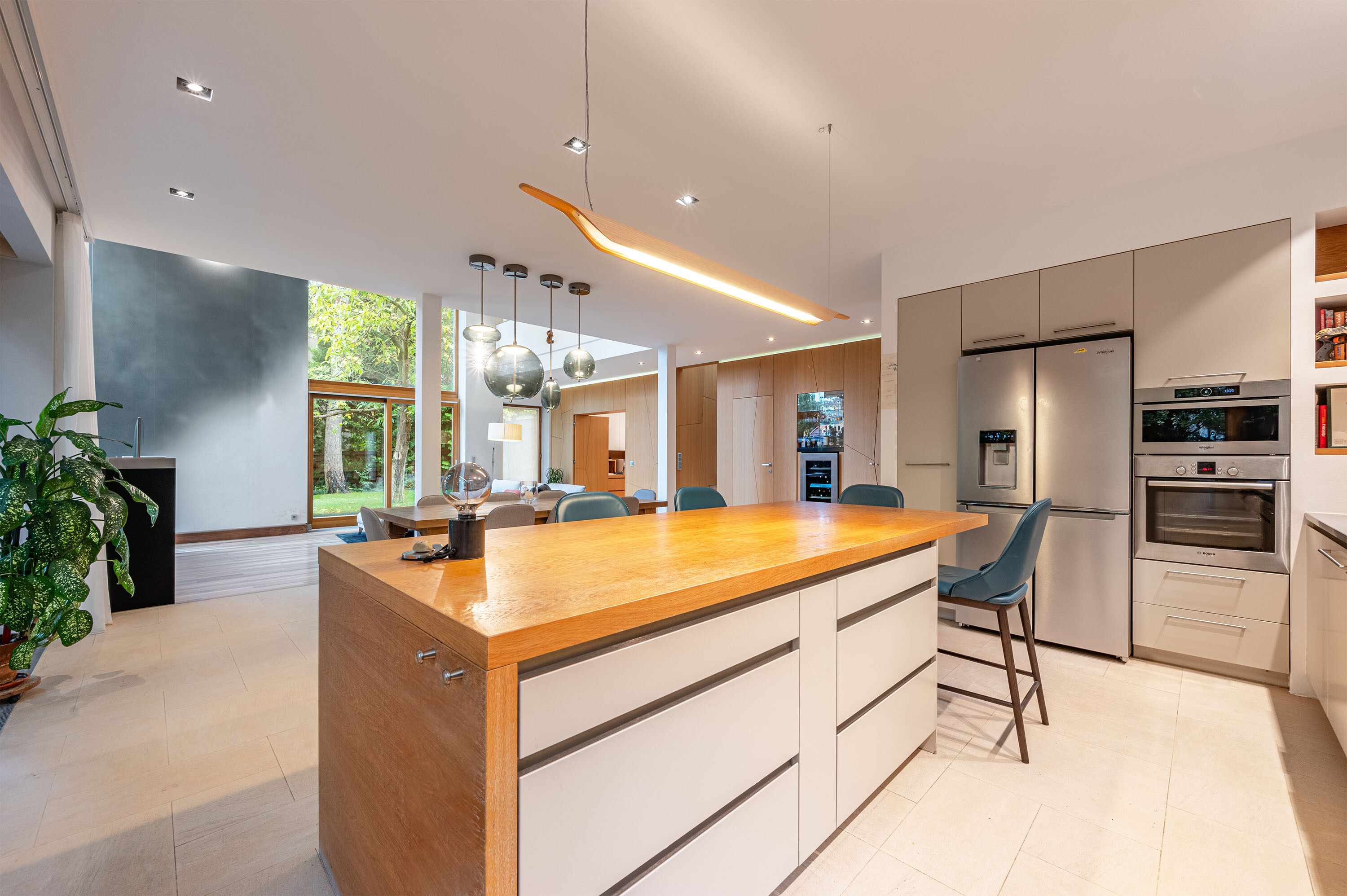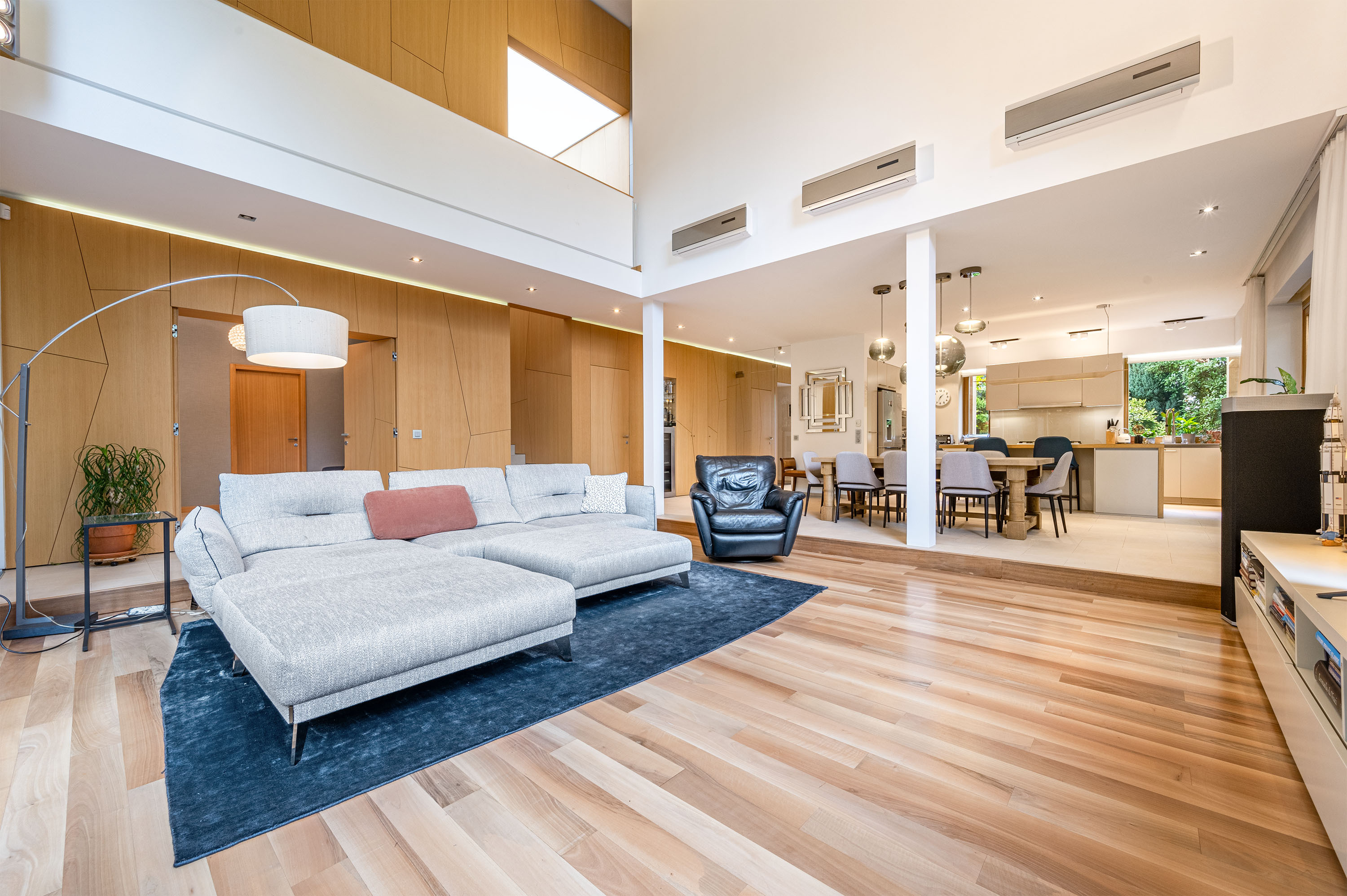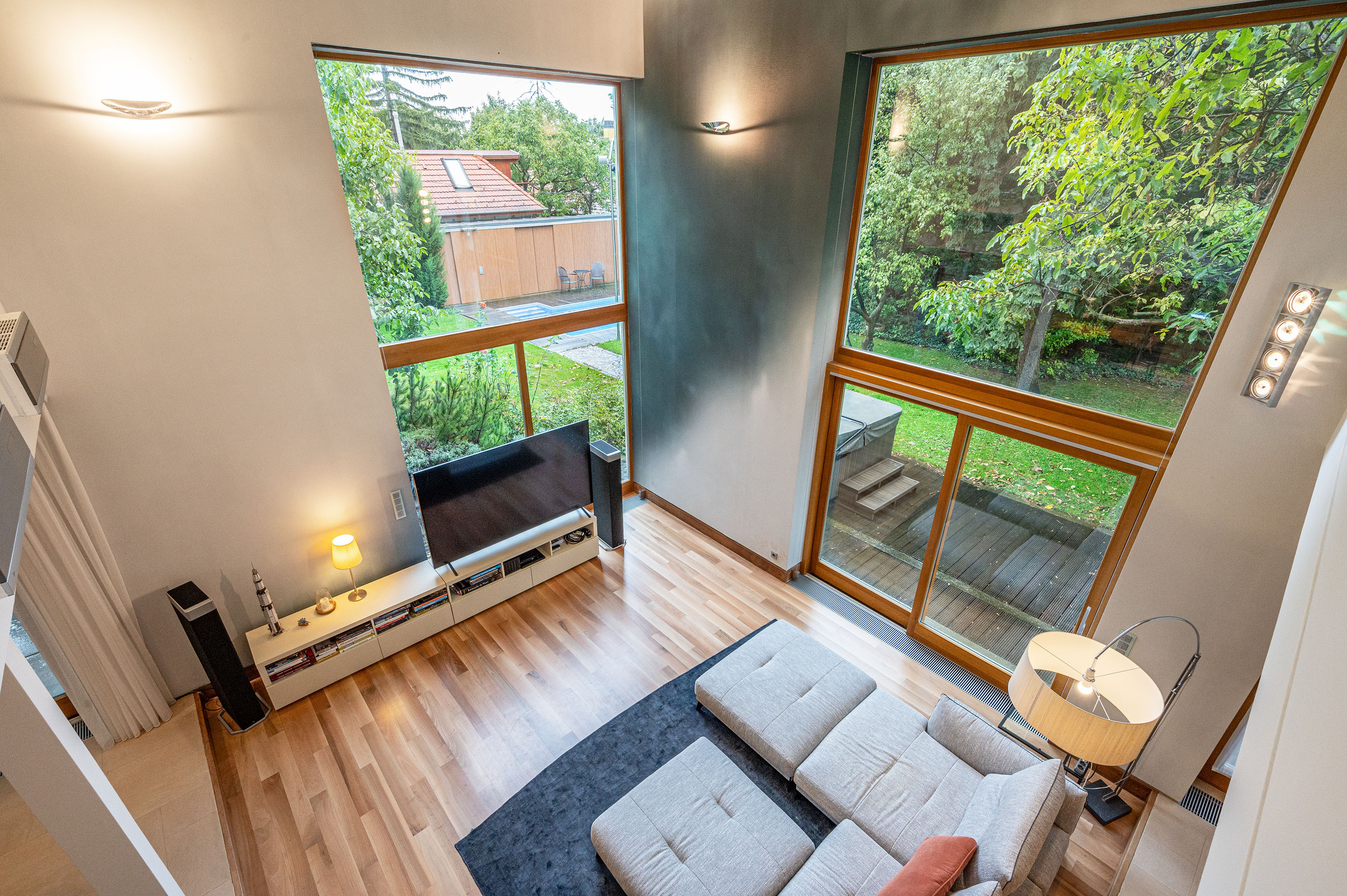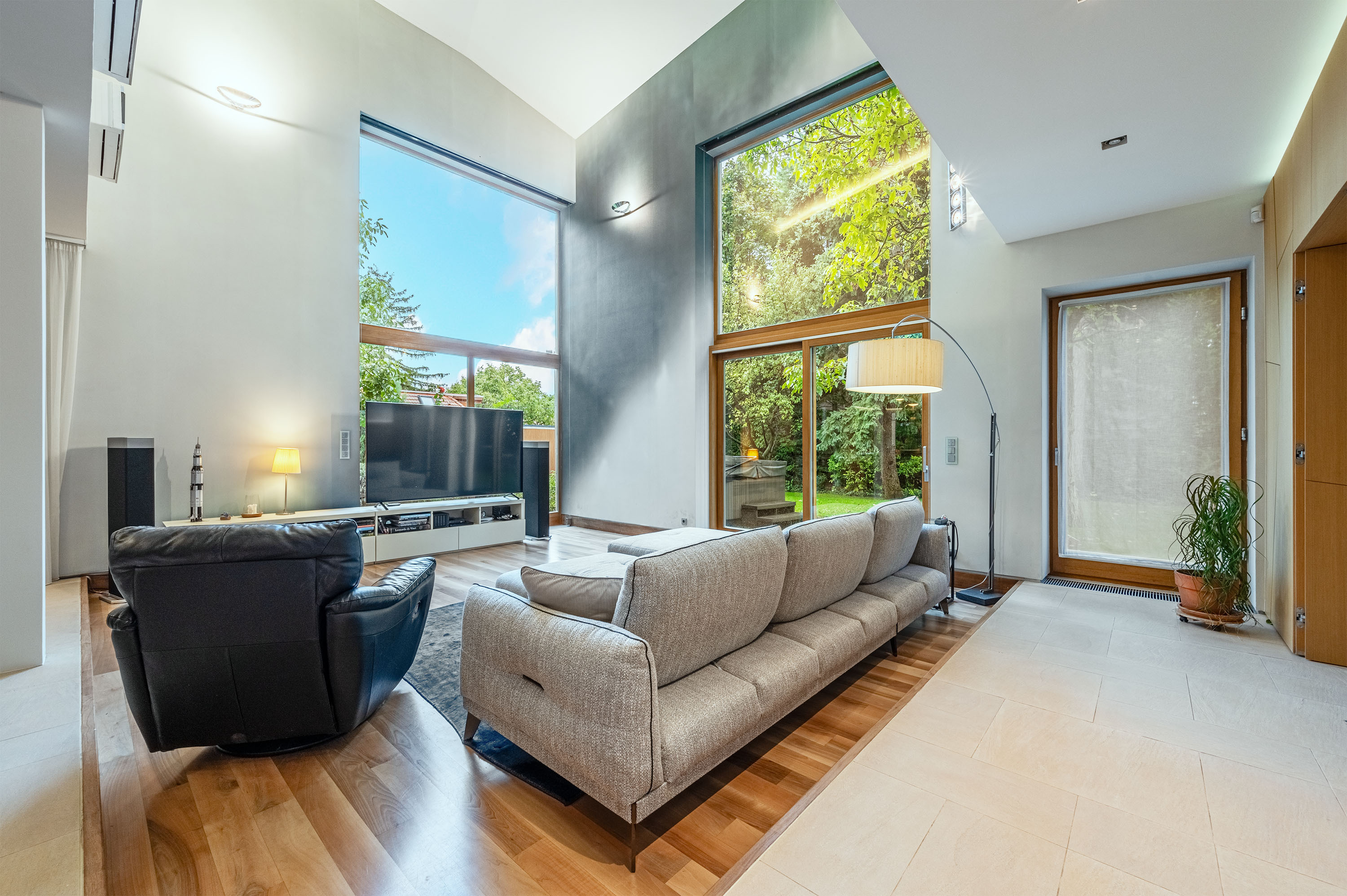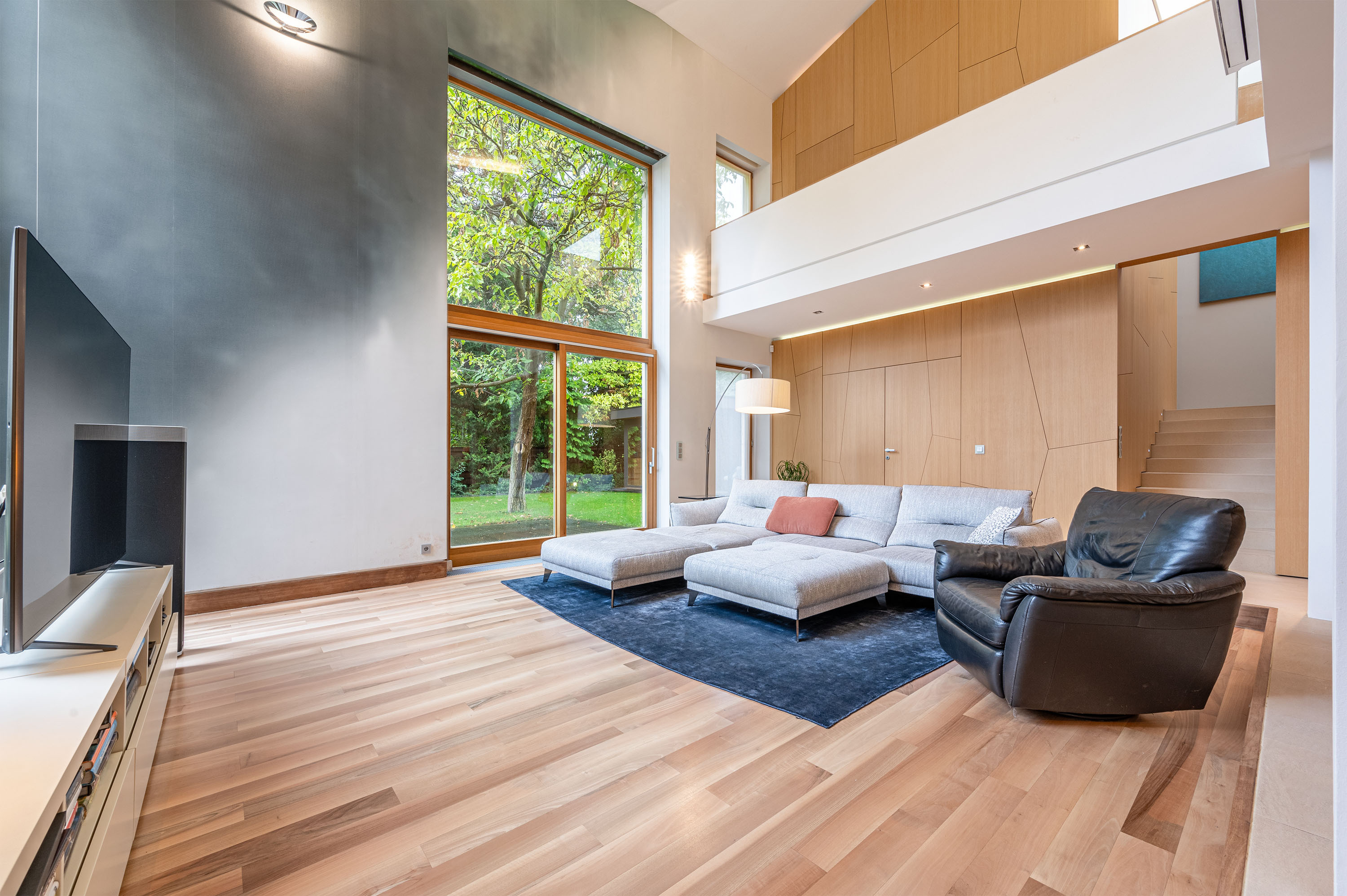 The living room of the house has an imposing ceiling height of more than 7 metres, with large glass surfaces facing the garden, creating a contrast between the homogeneous colours inside and the vibrant green of the garden.
