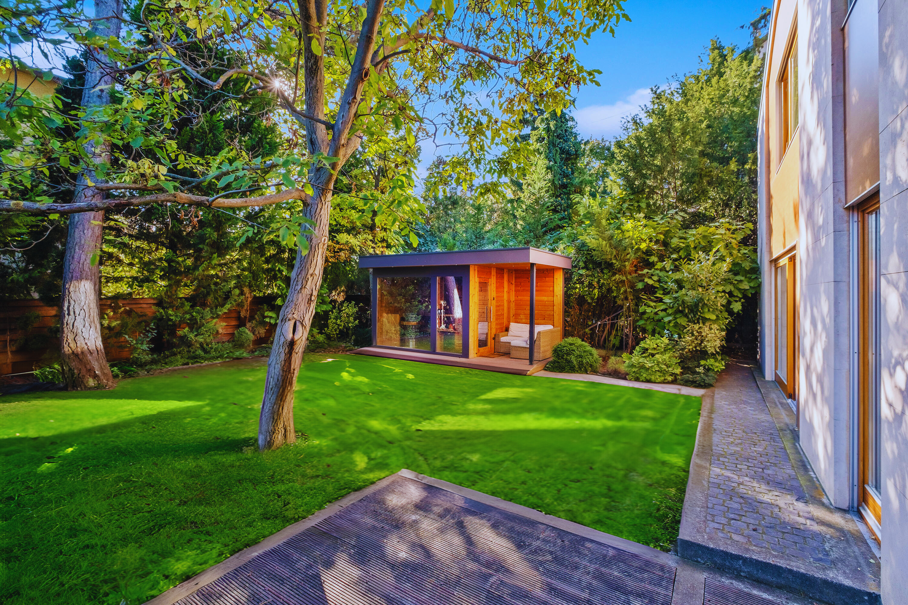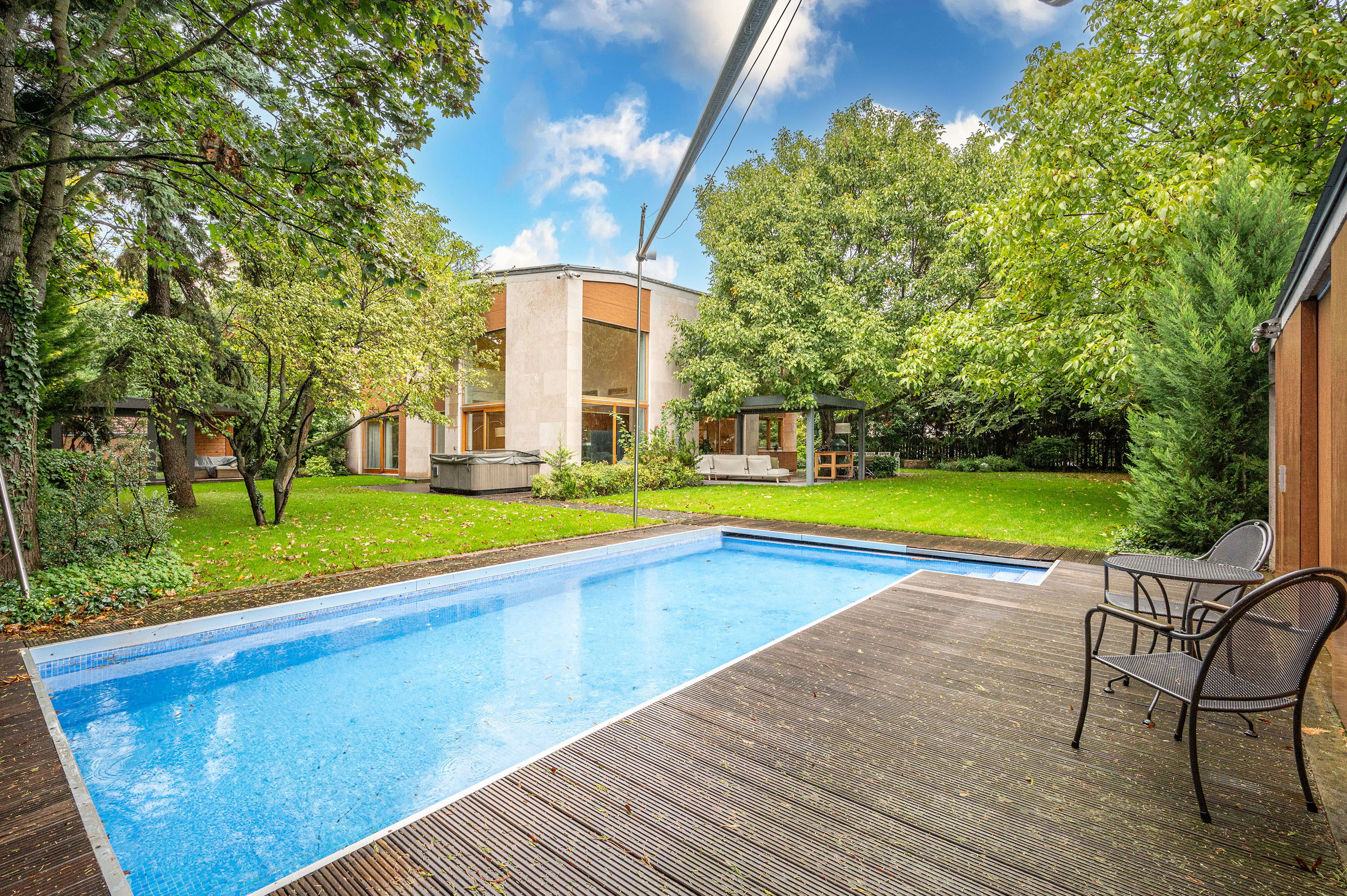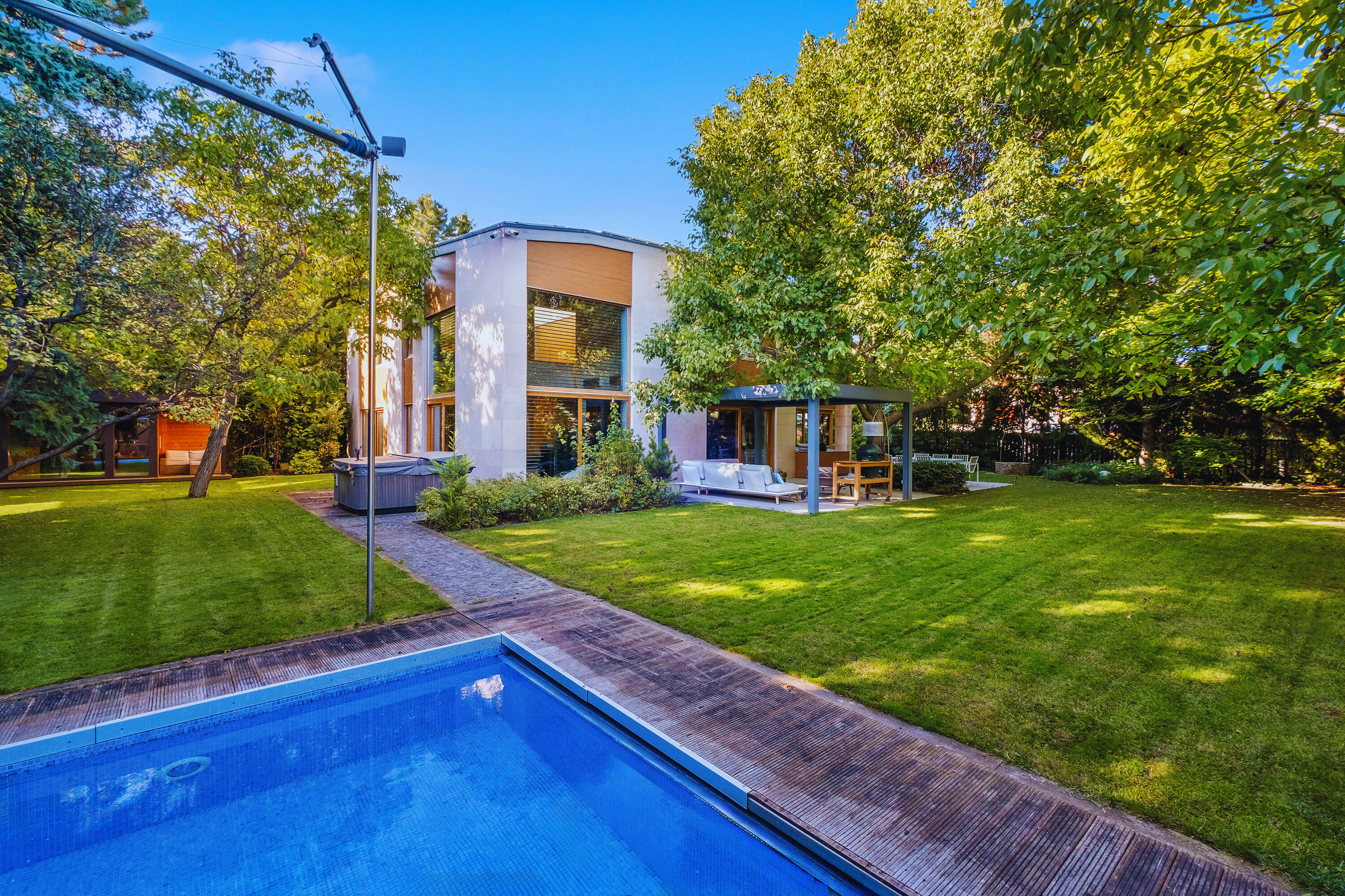 Az ingatlant egy gyönyörűen karbantartott kert öleli körül, melyhez egy Jacuzzi és kültéri medence is tartozik szaunaházzal.