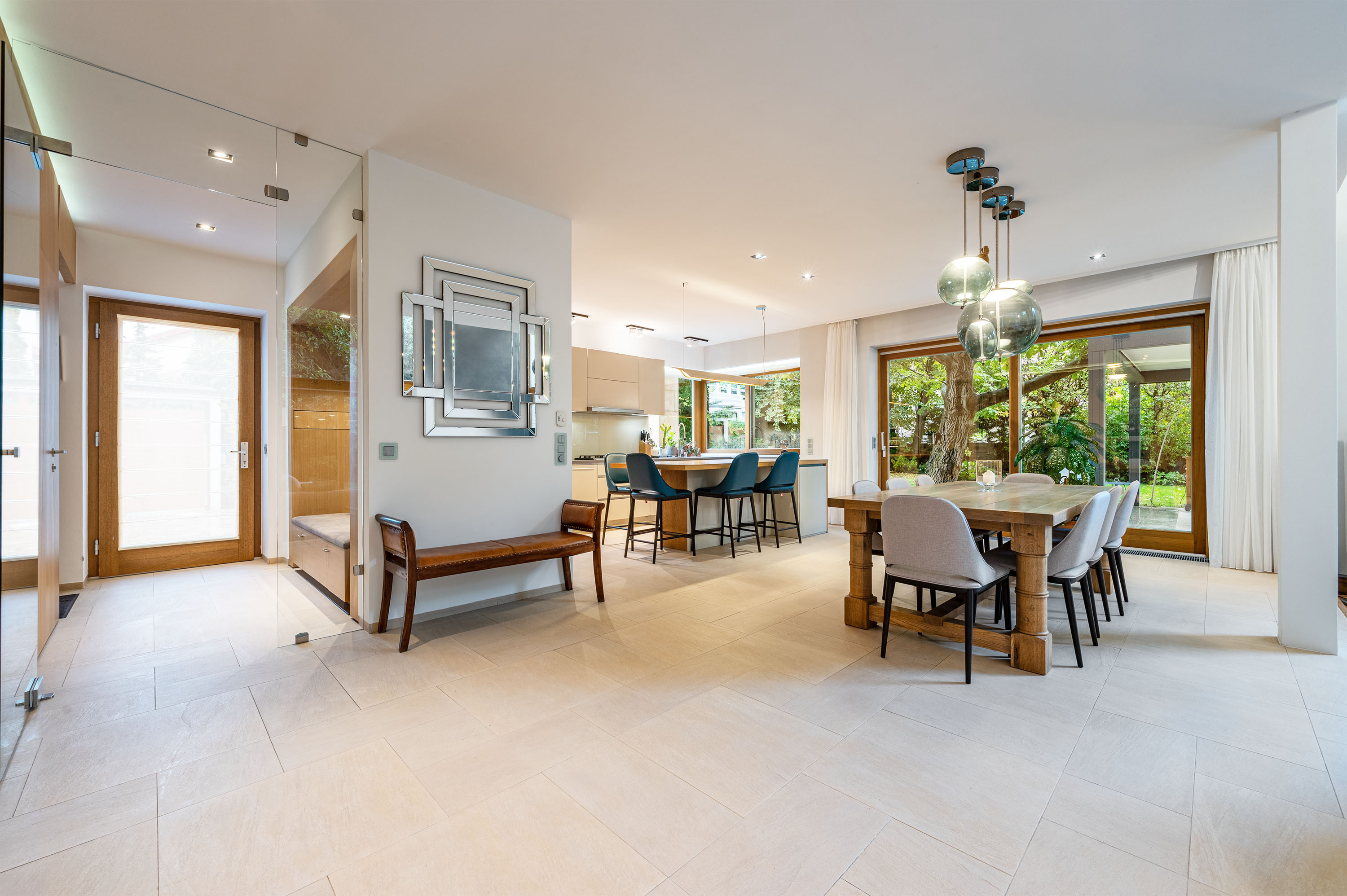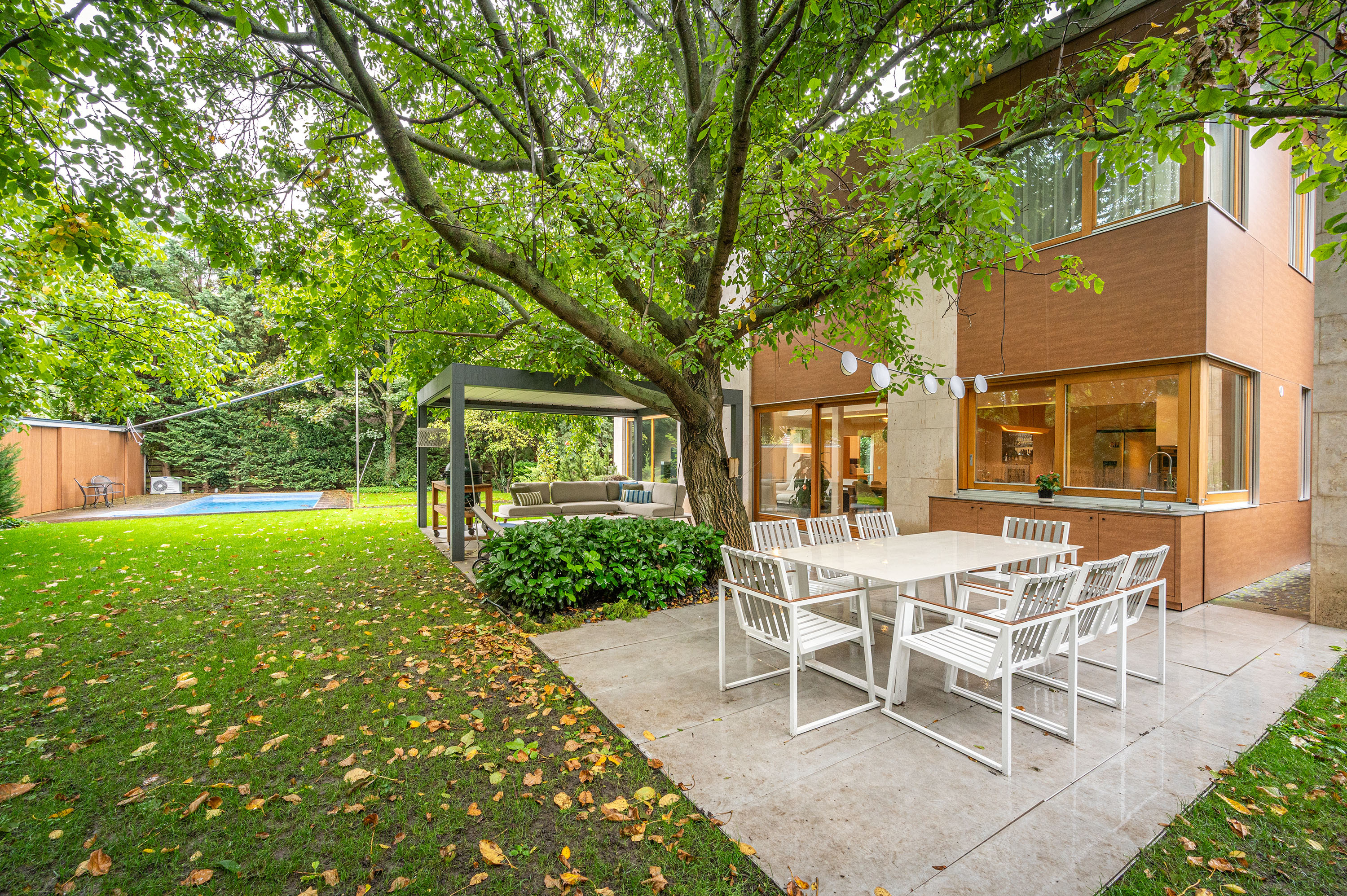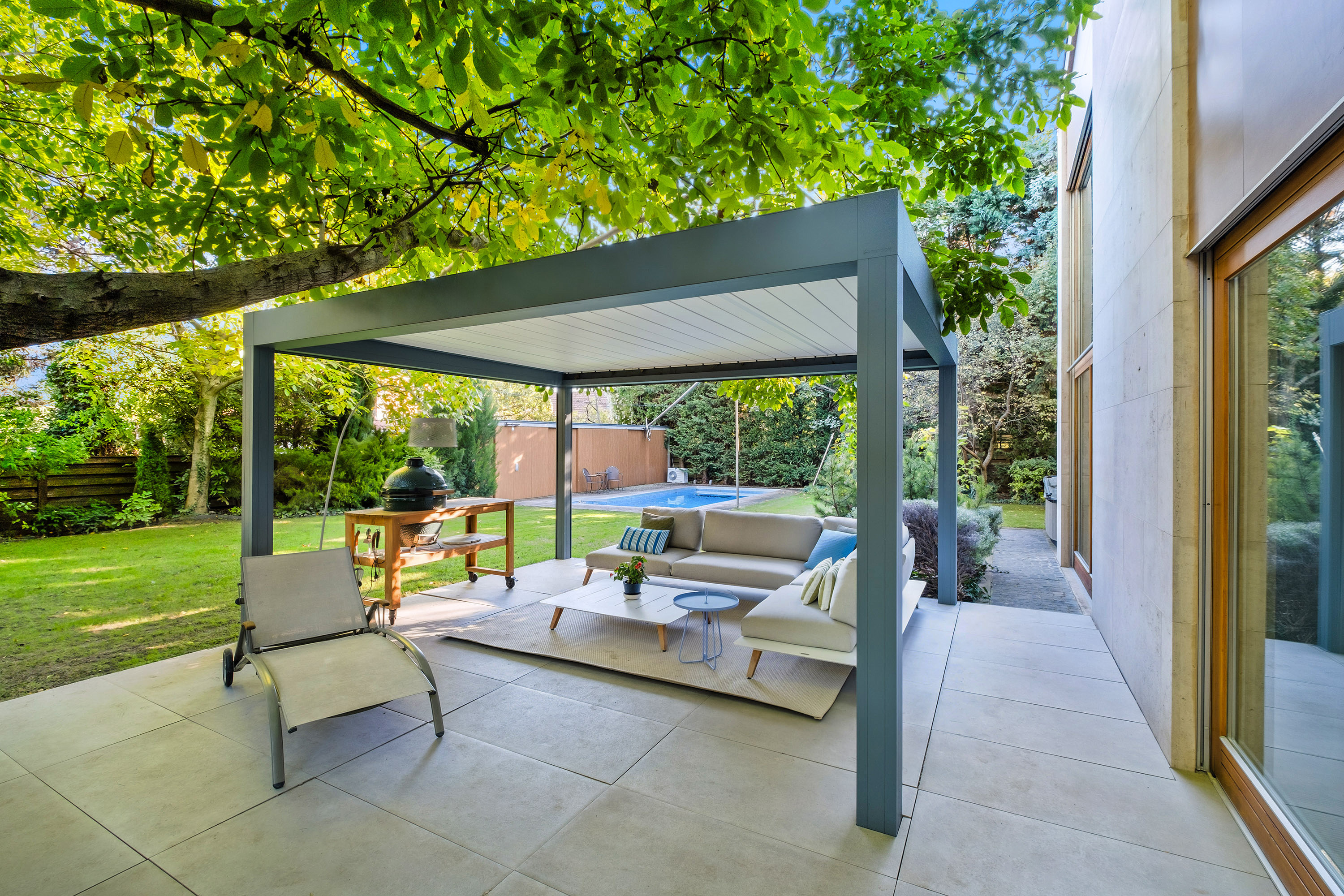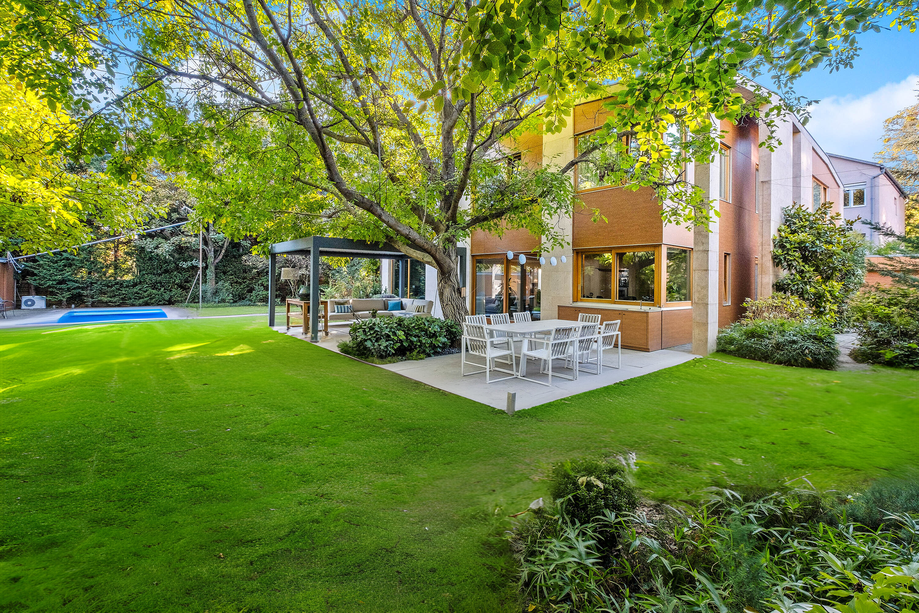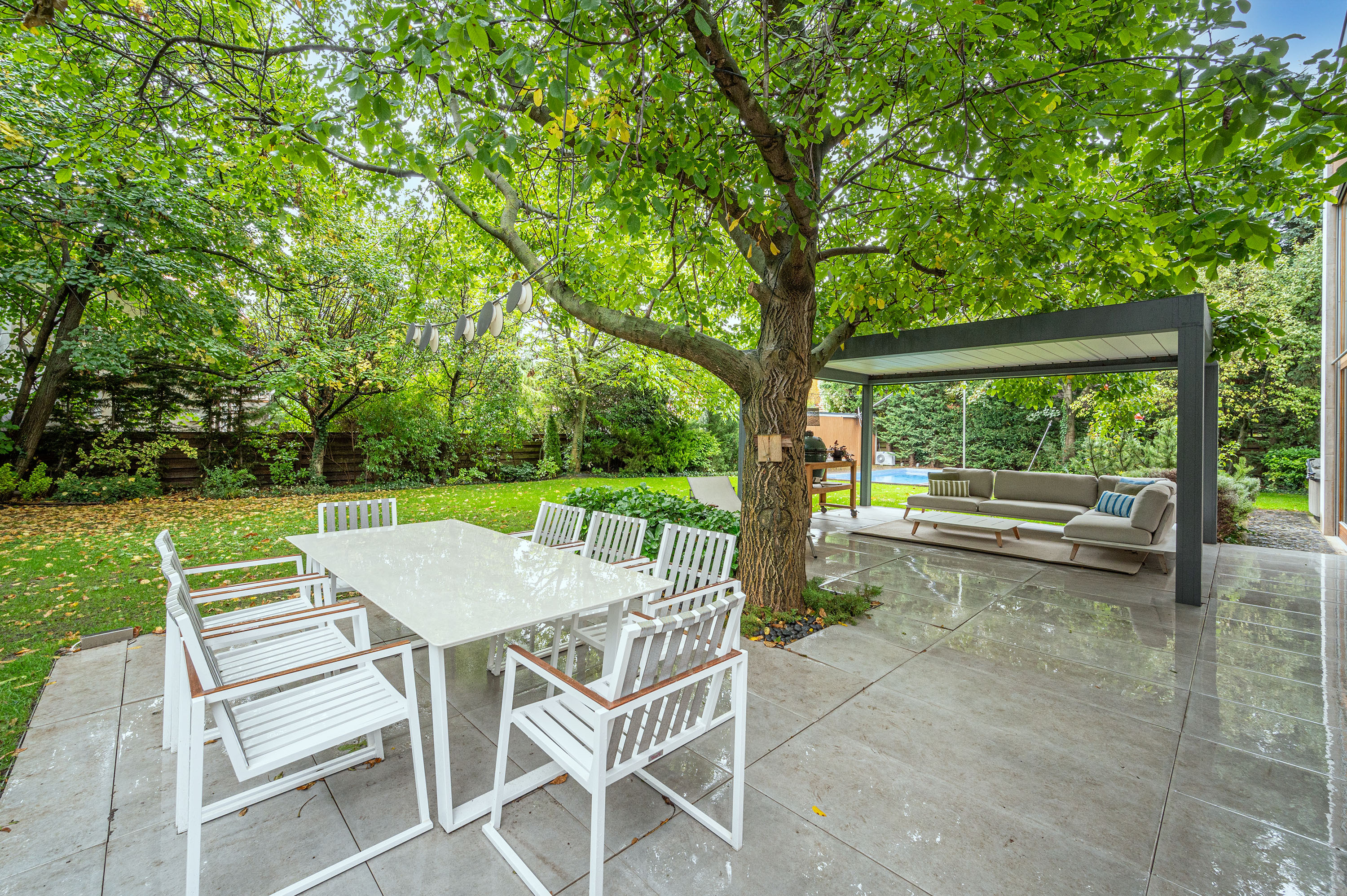 A large walnut tree breaks the unity of the terrace and the lawned courtyard, creating natural shade and a special atmosphere for the outdoor living and dining areas.